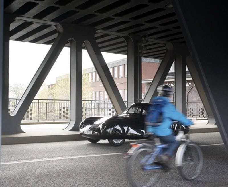 Les vitrages sont près de la tête, de sorte qu’à l’avant et latéralement la vision est bonne malgré la forte présence du tableau de bord et des portes, le levier de vitesse vertical se trouve sur l’épine dorsale centrale, comme les VW KdF, mais beaucoup plus près de la main que dans la 356, la proximité avec le volant, cependant, donne une sensation très vintage qui est en contradiction avec l’extérieur au look moderne. Le tableau de bord métallique sans fioritures ne contient qu’un seul instrument monté en position centrale : un compteur de vitesse VW gradué à 160km/h, l’absence d’un tachymètre est déconcertant, car le ridicule régime moteur qui se manifeste bruyamment est difficile à juger !
