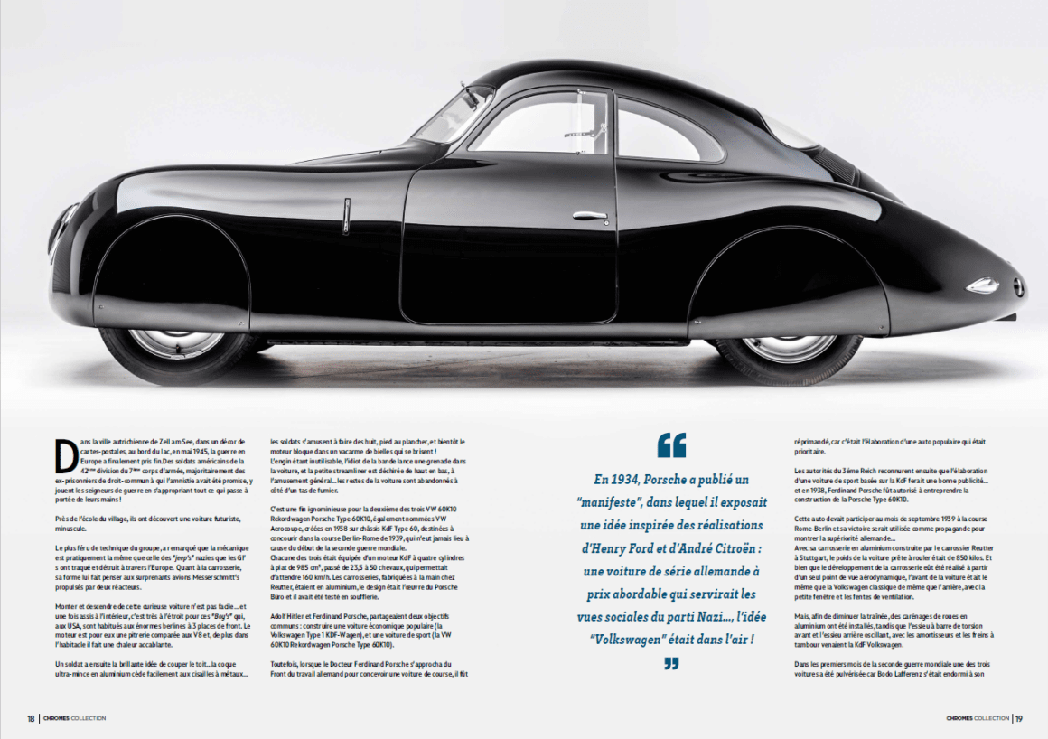 Les autorités du 3éme Reich reconnurent ensuite que l’élaboration d’une voiture de sport basée sur la KdF ferait une bonne publicité… et en 1938, Ferdinand Porsche fût autorisé à entreprendre la construction de la Porsche Type 60K10. Cette auto devait participer au mois de septembre 1939 à la course Rome-Berlin et sa victoire serait utilisée comme propagande pour montrer la supériorité allemande…
