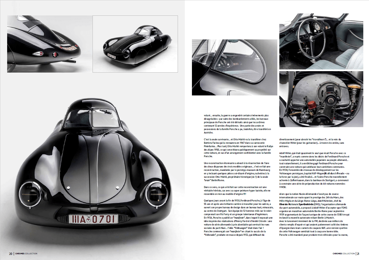 Une reconstruction étonnante a abouti à la résurrection de l’une des deux disparues des trois modèles originaux… C’est en fait une reconstruction totale mandatée par le prototyp-museum de Hambourg (www.prototyp-hamburg.de), en y incluant quelques pièces soi-disant d’origine, rachetées à la succession Otto Mahlé, proprio historique (sic !) de la seule “vraie” Berlin/Rome. Dans ce sens…, ce qui a été fait sur cette reconstruction est une véritable hérésie…, car avec sa super peinture hyper lustrée, elle ne ressemble en rien au modèle d’origine ! Quelques jours avant la fin de 1930, Ferdinand Porsche, à l’âge de 55 ans et après une brillante carrière à travailler pour les autres, a ouvert son propre bureau de design dans un bureau loué, minuscule, au centre de Stuttgart… son équipe de 12 hommes triés sur le volet comprenait son fils Ferry et un groupe talentueux d’ingénieurs.