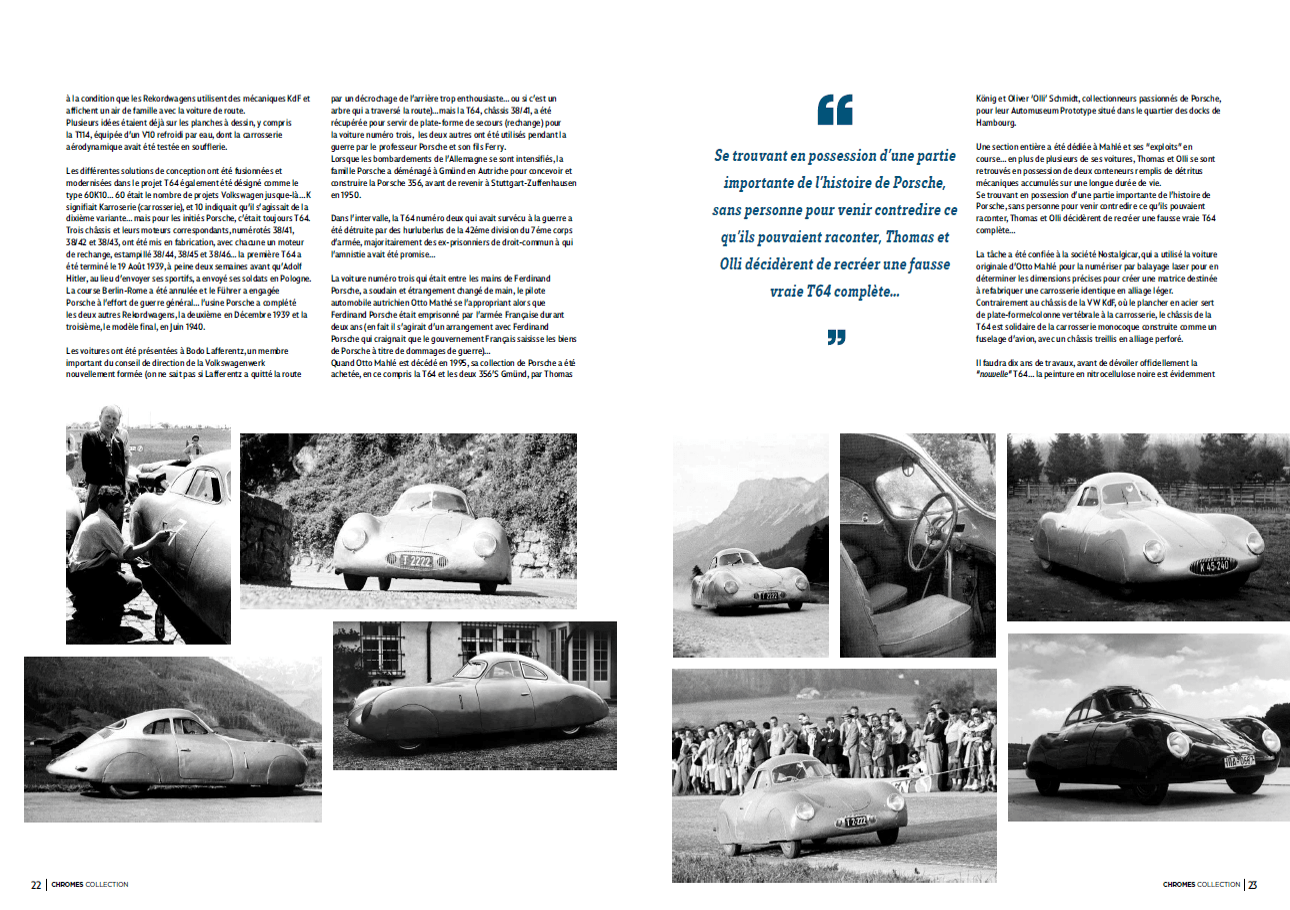 Se trouvant en possession d’une partie importante de l’histoire de Porsche, sans personne pour venir contredire ce qu’ils pouvaient raconter, Thomas et Olli décidèrent de recréer une fausse vraie T64 complète… La tâche a été confiée à la société Nostalgicar, qui a utilisé la voiture originale d’Otto Mahlé pour la numériser par balayage laser pour en déterminer les dimensions précises pour créer une matrice destinée à re-fabriquer une carrosserie identique en alliage léger. Contrairement au châssis de la VW KdF, où le plancher en acier sert de plate-forme/colonne vertébrale à la carrosserie, le châssis de la T64 est solidaire de la carrosserie monocoque construite comme un fuselage d’avion, avec un châssis treillis en alliage perforé.