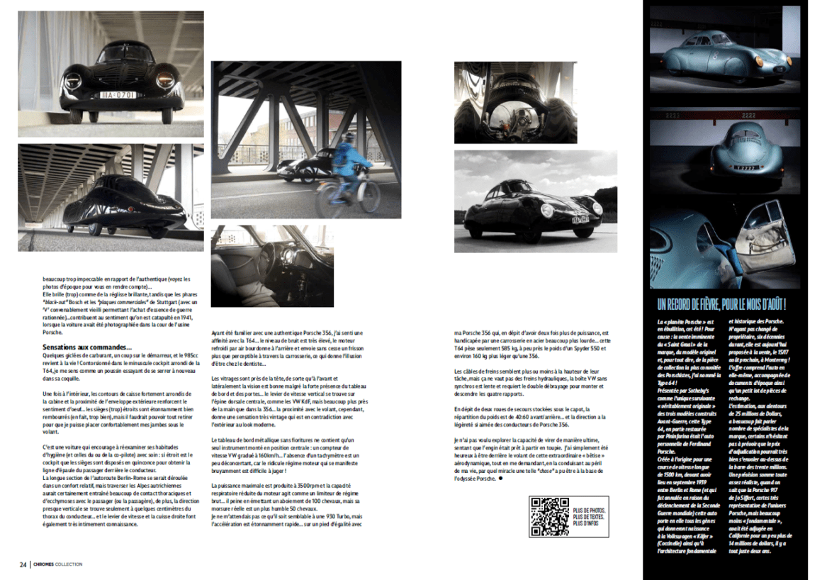 Lorsque les bombardements de l’Allemagne se sont intensifiés, la famille Porsche a déménagé à Gmünd en Autriche pour concevoir et construire la Porsche 356, avant de revenir à Stuttgart-Zuffenhausen en 1950. Dans l’intervalle, la T64 numéro deux qui avait survécu à la guerre a été détruite par des hurluberlus de la 42éme division du 7éme corps d’armée, majoritairement des ex-prisonniers de droit-commun à qui l’amnistie avait été promise…