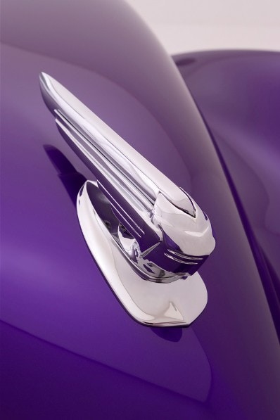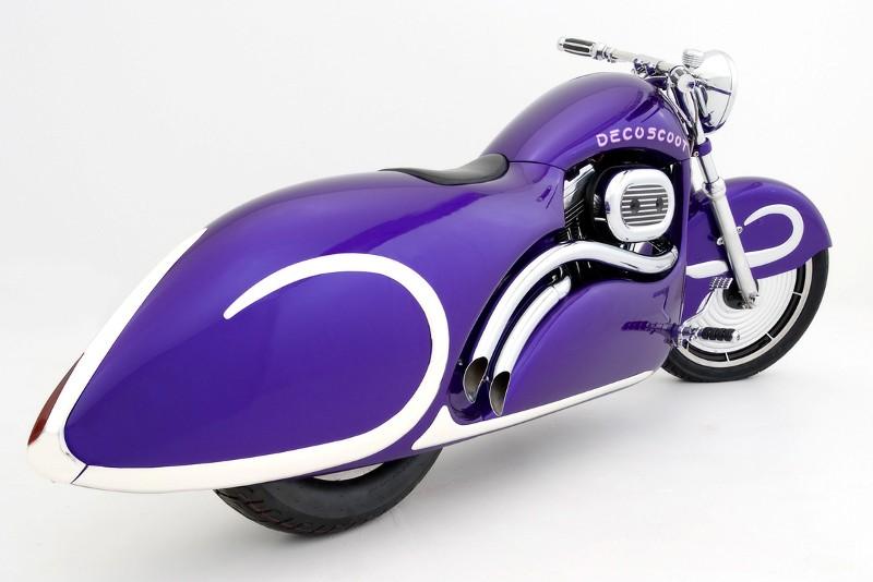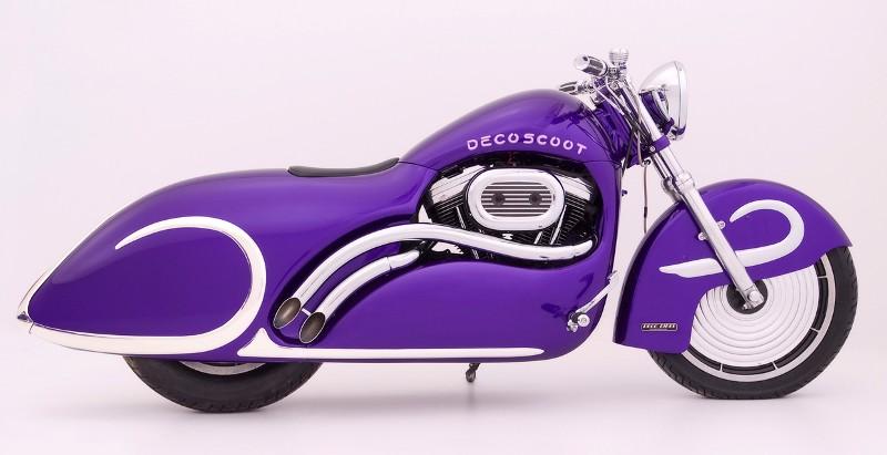Un autre homme impliqué dans ce projet a été Denny Jamison d’Automotive Hammer Art sité dans Gasoline Alley à Indianapolis, qui a construit le Chopper-Kustom ’92 Harley Sportster, dénommé Déco-Scoot, peint en RM Carizzma perle et violet nacré.