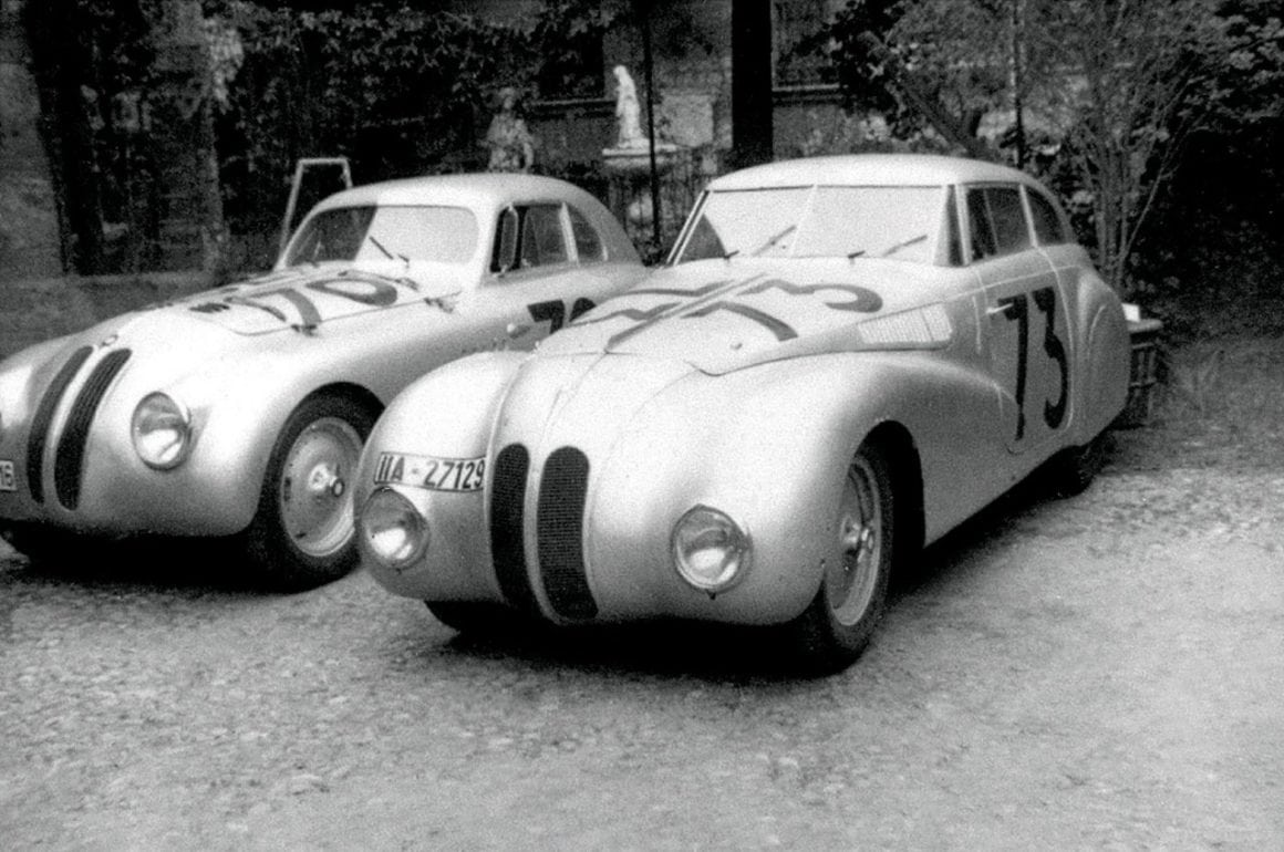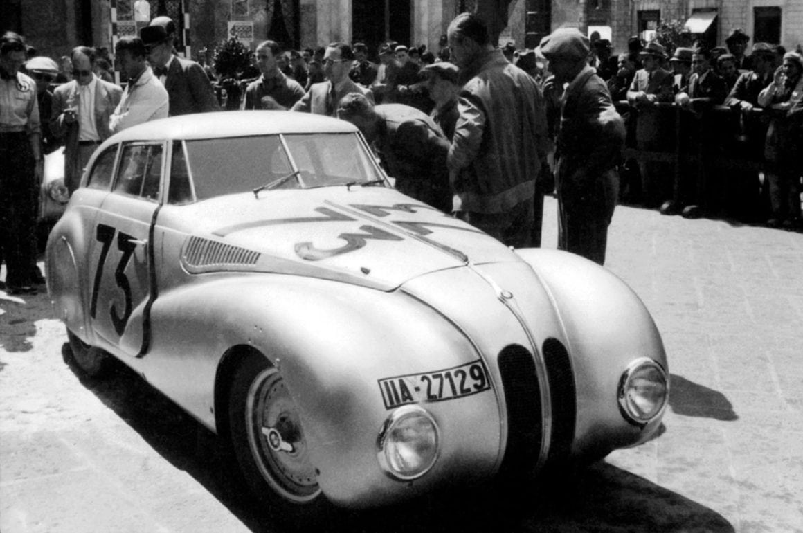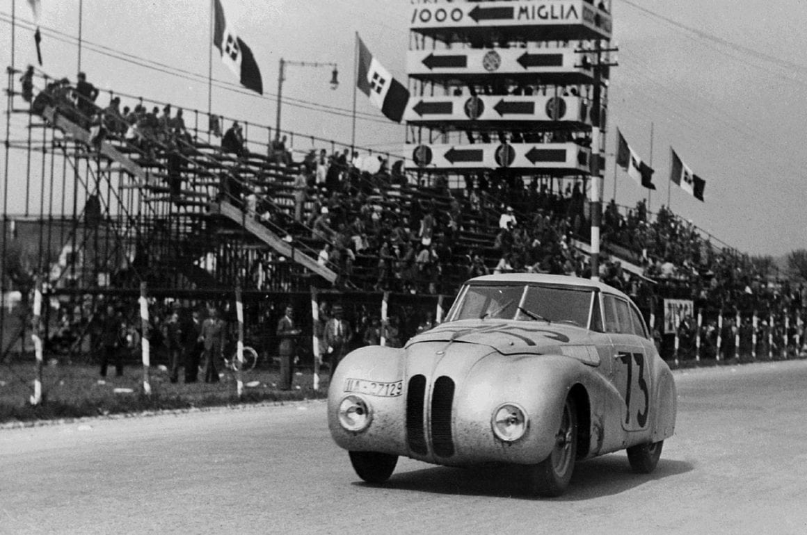 Voilà, on en revient au début de la fin…, donc…, en 1940, le constructeur bavarois BMW avait engagé 5 véhicules et remporté la célèbre course des Mille Miglia (mille miles) en Italie…, ensuite, dans la période trouble d’après conflit, les véhicules seront dispersés dans différents pays (en cause de la guerre, le constructeur prévoyant, avait préféré dissimuler rapidement ses véhicules de pointe dans la campagne allemande, pour ne pas les voir détruits ou saisis).