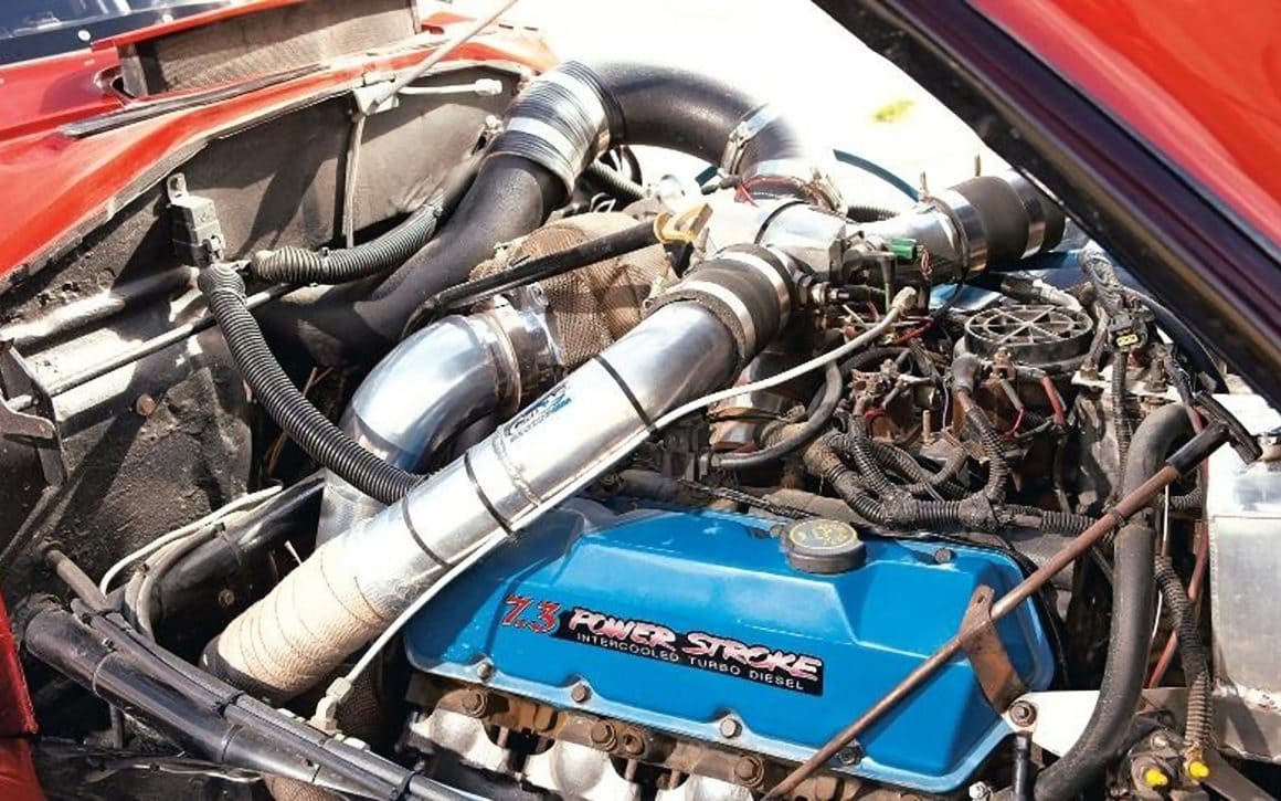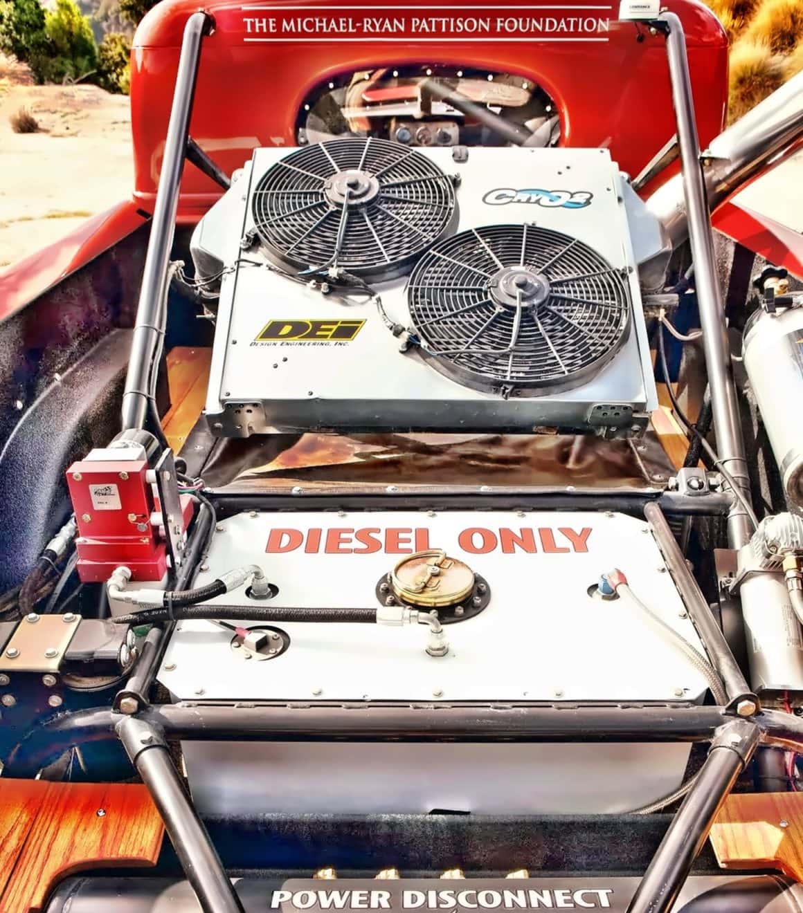 La clé de l’installation entière était un Big-Block Ford 7.300cc turbo diesel Powerstroke, extrait d’un F-250 “à-la-casse”… dont la transmission a été réassemblée par ATS Performance Diesel, garantie pour encaisser au moins 1000 chevaux, puissance transmise à un pont Ford de 9 pouces Nascar-floater-rearend… tandis que la suspension était fabriquée sur-mesure par Randy, elle se composait d’une triangulation à quatre bras avec de gros freins à disques à six pistons.