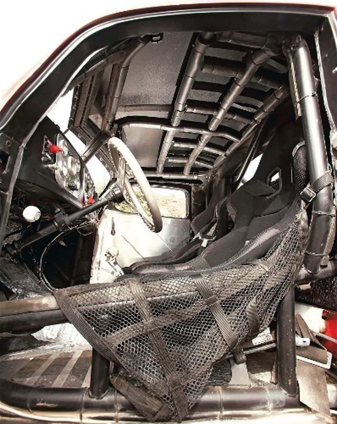 La plupart des garnitures inoxydable avaient été soigneusement démontées et mises en place dans l’habitacle… qui lui, par contre était dans un état proche de l’irrécupérable, il n’y avait d’ailleurs pas d’intérieur, pas de moteur et aucune transmission…, elle était donc difficilement restaurable…, mais en tant que carcasse, sa carrosserie était parfaite pour habiller une voiture de course.