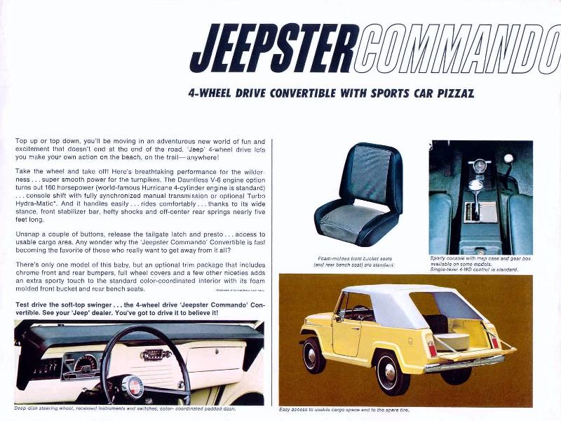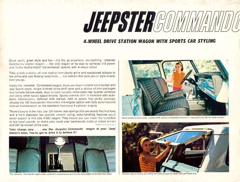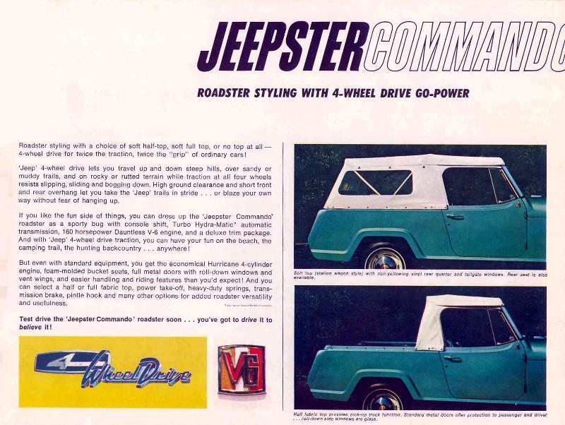 La nouvelle ’67 Jeepster “Commando” destinée ainsi à révolutionner l’univers connu et au delà (si possible) était disponible en Pick-up, break, cabriolet et roadster, mais une chose était restée la même : il s’agissait toujours d’une deux portes relativement basique et insipide qui brinquebalait de partouze, d’origine…