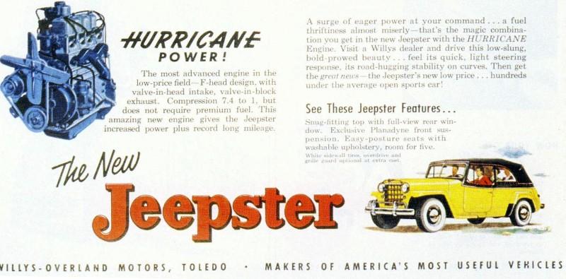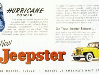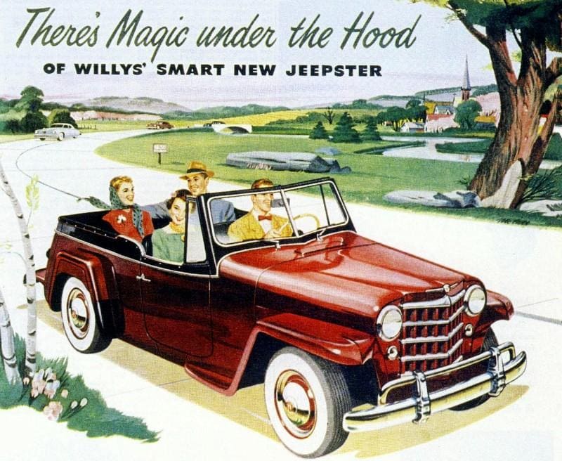 Extrapolée du break, la Jeepster fut lancée en mai 1948, baptisée Jeepster Sports Phaeton, il s’agissait d’une automobile de loisirs disponible uniquement en décapotable, qui empruntait à la Jeep prétendument “une ligne sportive”…