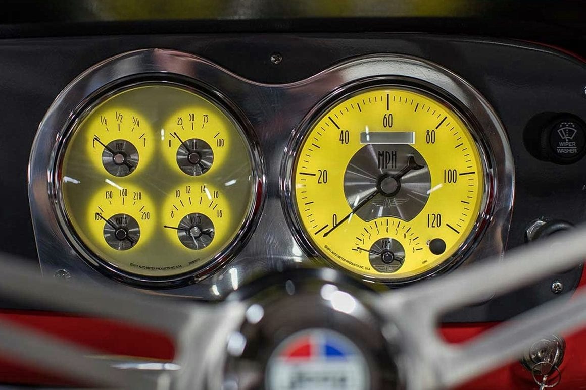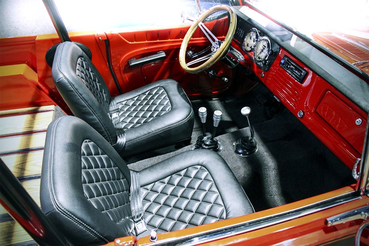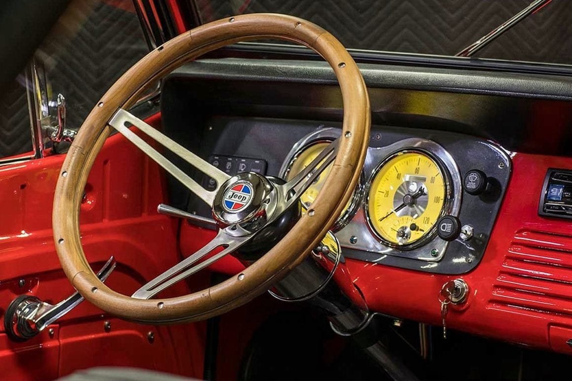 La Jeepster Commando est entièrement découvrable pour une expérience en plein air inédite…, à l’intérieur, quelques détails ramènent au passé…, l’habitacle est très large et celui-ci montre même quelques sections en acier peint…, on remarque également que le tableau de bord, tout en restant “moderne”, a été adapté à un véhicule qui ne permettait pas, dans les années ’70, beaucoup de fantaisie dans ce domaine.