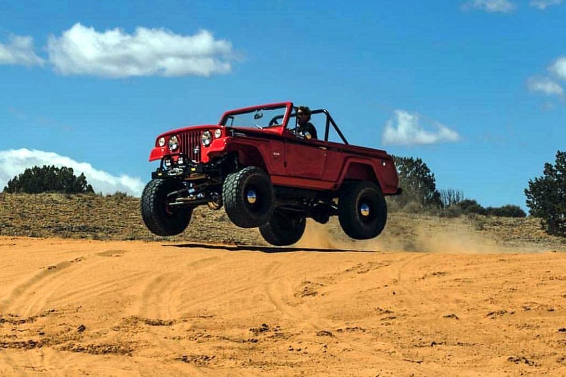 Aujourd’hui, l’ensemble paraît chargé d’un parfum assez kitsch, surtout avec des pneus à flancs blancs, mais la Jeepster est, d’une certaine manière, une voiture à prendre au second degré…