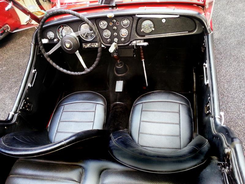 Dans la Triumph TR3, on est assis très bas et l’échancrure de la porte permet, comme dans une Lotus Seven de toucher le sol du bout des doigts…, heureusement d’ailleurs qu’elle est échancrée, cela permet de passer le bras à l’extérieur, ce qui est indispensable : il n’y a que quelques centimètres entre le large volant et la portière.