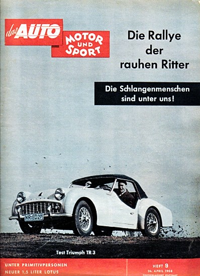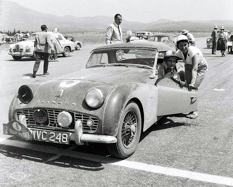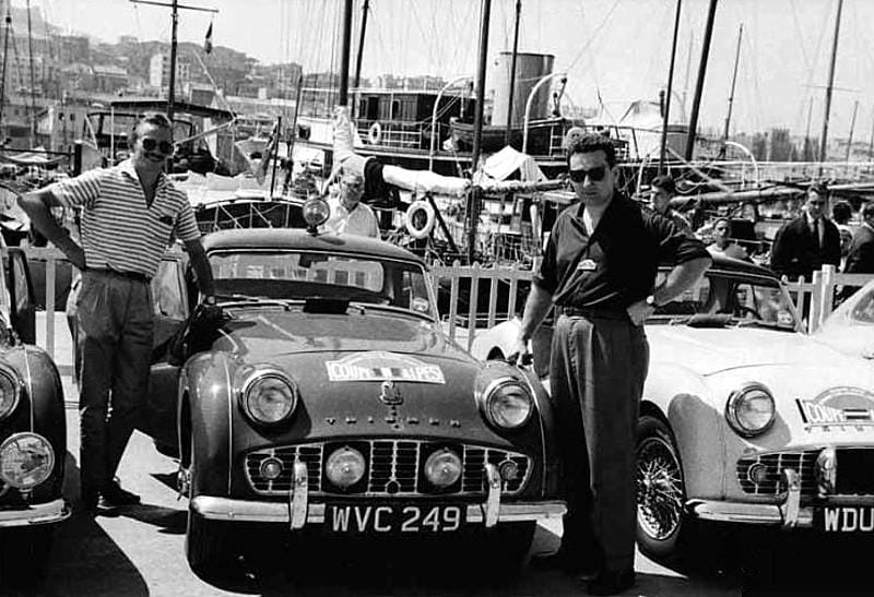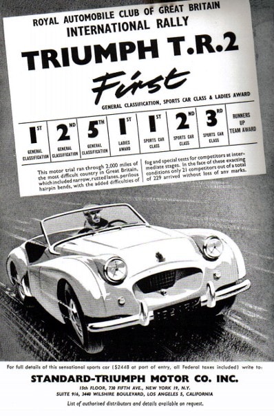 3ème au général du Liège-Rome-Liège 1957, la TR3 poursuit ses bons résultats…, au rallye des Monte-Carlo 1958, Triumph réalisera sa plus belle performance avec une victoire de classe…, un nouveau moteur à double arbre à cames en tête est développé pour combler le principal défaut de la TR3, son manque de puissance…, cela va conduire Triumph à développer des voitures usine de plus en plus spécifiques pour s’imposer dans les grandes épreuves comme les 12H de Sebring, les Mille Miles, ou encore les 24H du Mans.