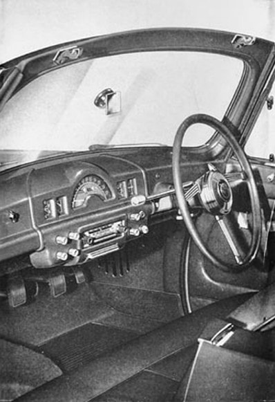 Sur le dessus du moyeu, un basculeur en bakélite permet d’actionner les clignotants…, derrière lui, le compteur de vitesse et le compte-tours sont recouverts d’un verre bombé…, la partie centrale du tableau de bord est richement dotée en compteurs variés (ampèremètre, température d’eau, pression d’huile et jauge d’essence), surplombés, sous l’unique rétroviseur, par une tirette qui ouvre un volet au milieu du capot, à la base du pare-brise, envoyant de l’air frais sur les pieds.
