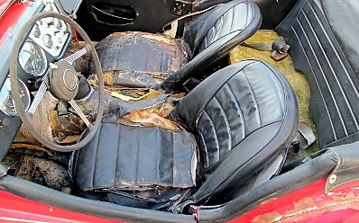 L’armature de la capote est boulonnée à la caisse, mais est nue, dès les deux arceaux déployés, bien plus haut que le pare brise, il apparaît évident qu’une fois la voiture fermée, la tête restera droite…, la capote est dans le coffre, simple bâche dotée d’une lunette arrière souple, à balancer en place, puis à soigneusement arrimer à l’aide de pressions tout autour de la carrosserie et du pare-brise…