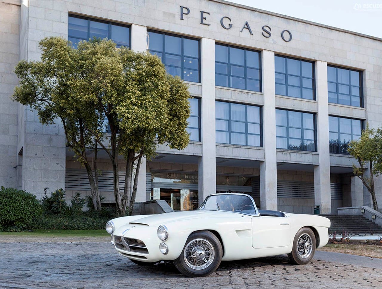 Pegaso confie à Serra, un petit carrossier de Barcelone, la fabrication de 5 Spider destinés à la compétition… et en 1953 un de ces Spider équipé d’un moteur suralimenté, est chronométré à 152 mph…, un record pour une voiture de tourisme…, record qui ne va d’ailleurs pas tenir longtemps puisque, quelques semaines plus tard il est pulvérisé par Jaguar avec une XK 140 allégée…, aux essais des “24 Heures du Mans” (destinés pour Pegaso, à “venger l’affront”), le pilote de l’équipe Pégaso Jover se tue et l’équipe doit se retirer de la compétition…, le seul succès international de l’équipe sera remporté au cours de la “Carrera PanAmericana”, en 1954, par la voiture qui illustre cet article (lire en finale de la chronique).