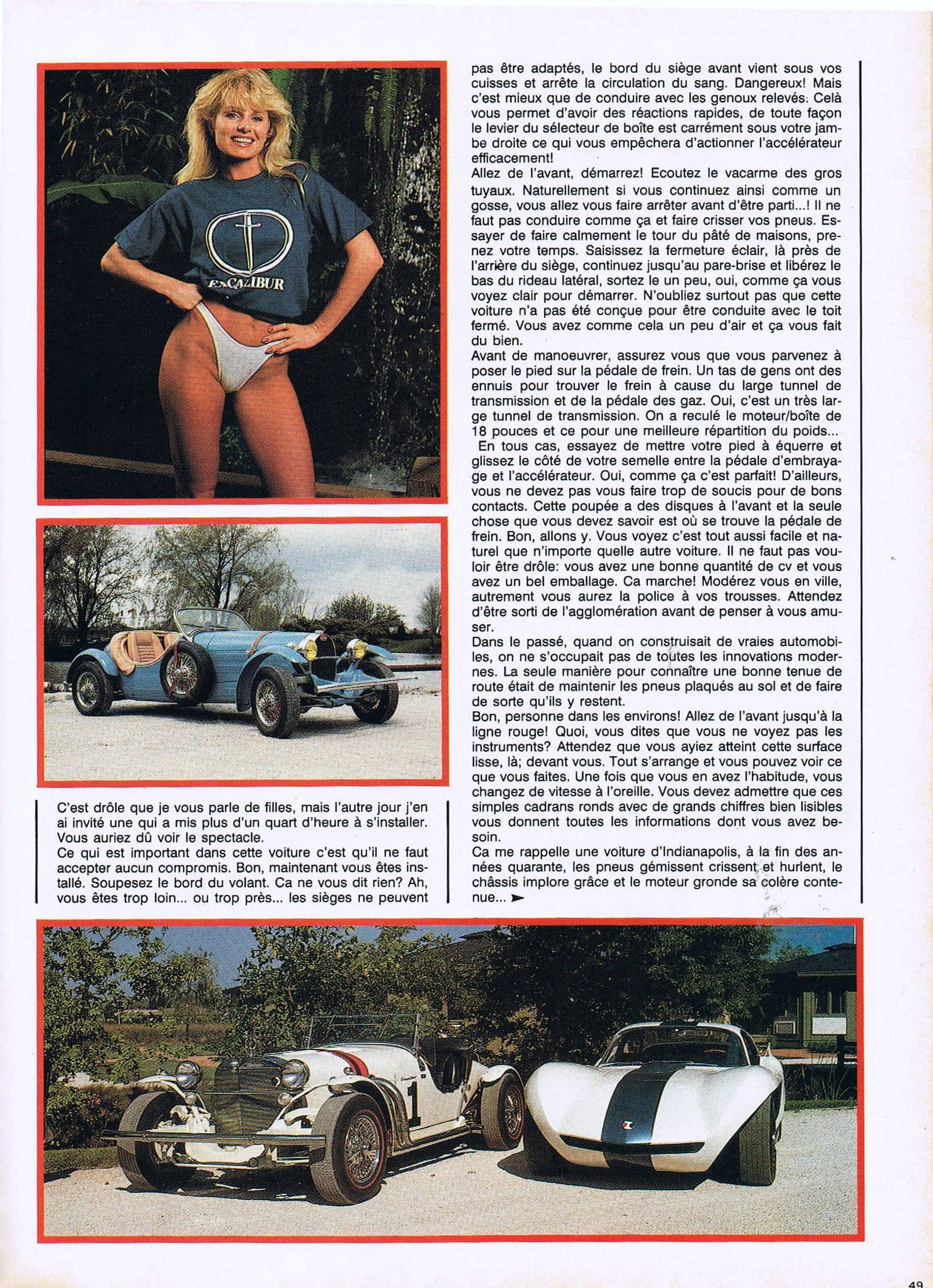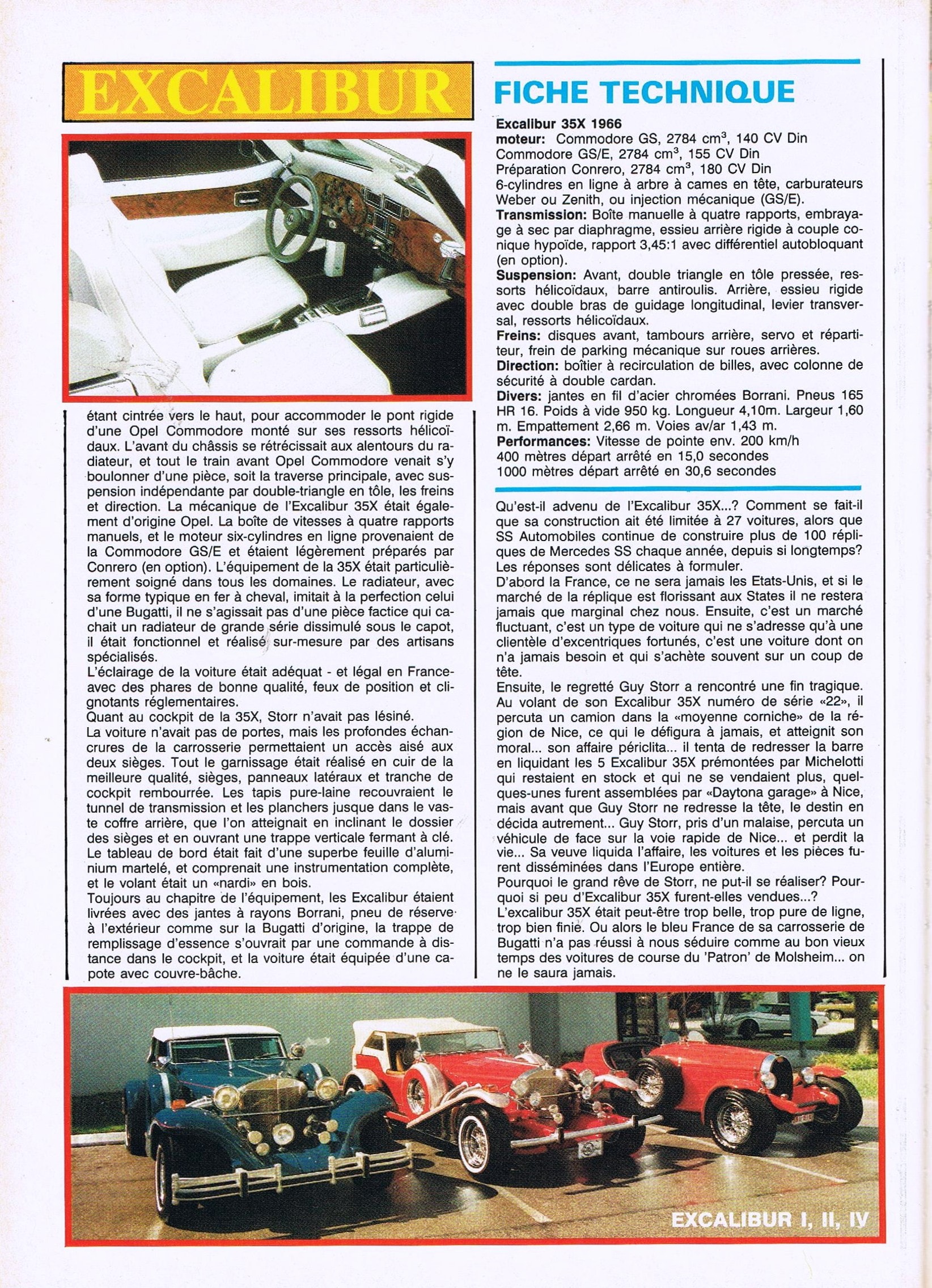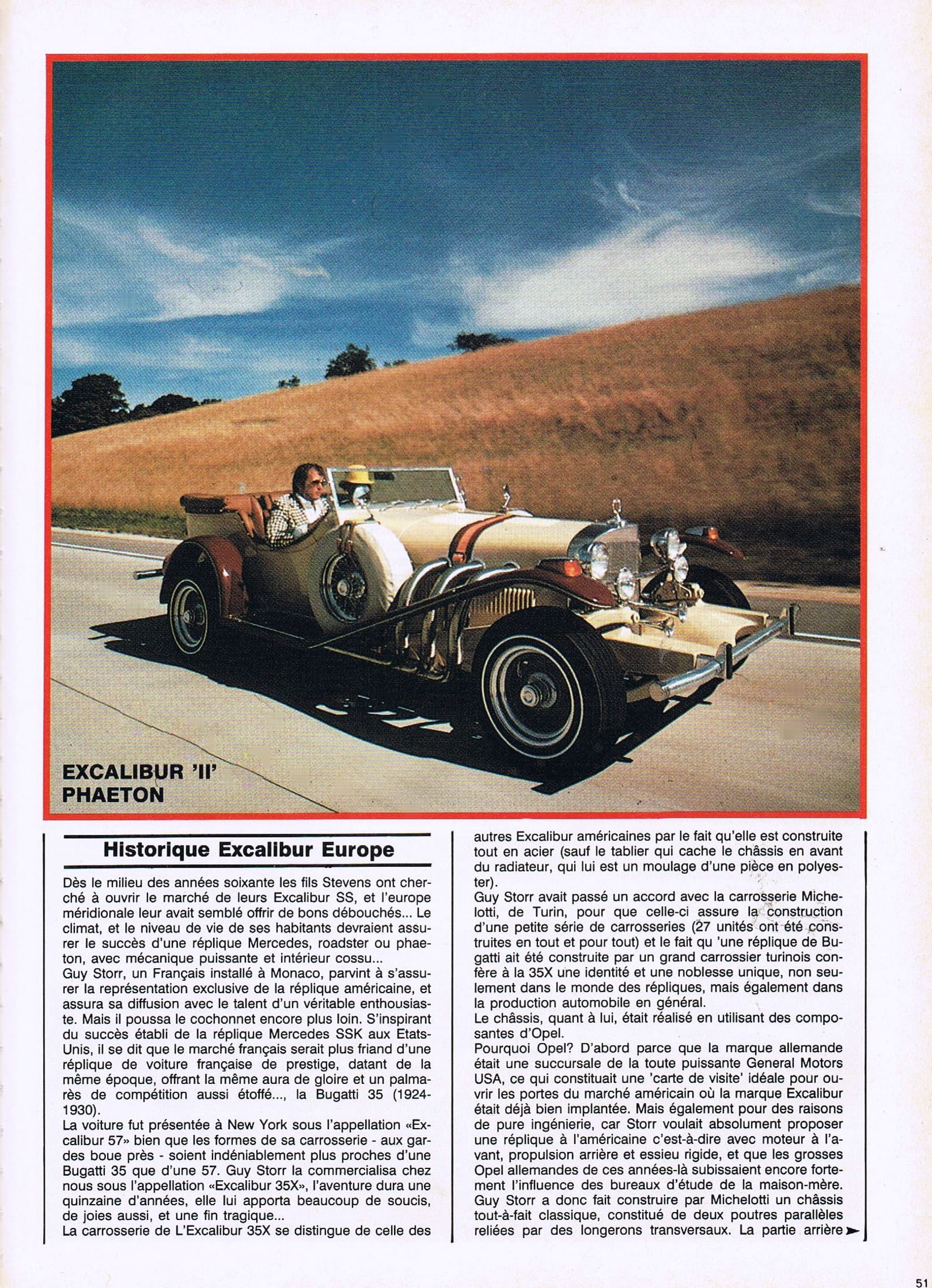 Possédant (ou étant possédé) par une Panther J72, et alors que j’étais avec elle à Monaco (en 1975 dans le cadre de la promotion de mon roman “Par qui ce scandale ?”)…, j’ai connu, rencontré, parlé, sympathisé avec Guy Storr qui était le concessionnaire exclusif Excalibur pour l’Europe…, également constructeur de l’Excalibur 35X…, une sorte de vol avec viol souriant…, une prise de marque impunissable…, pour lui permettre de vendre à son profit (l’argent, toujours l’rgent) exclusif, une évocation caricaturale de la Bugatti 35, construite en tôles d’acier chez Michelotti à Turin, motorisée par un bloc Opel Commodore 6 cylindres en ligne 3L… (il n’y en aura que 27 construites).