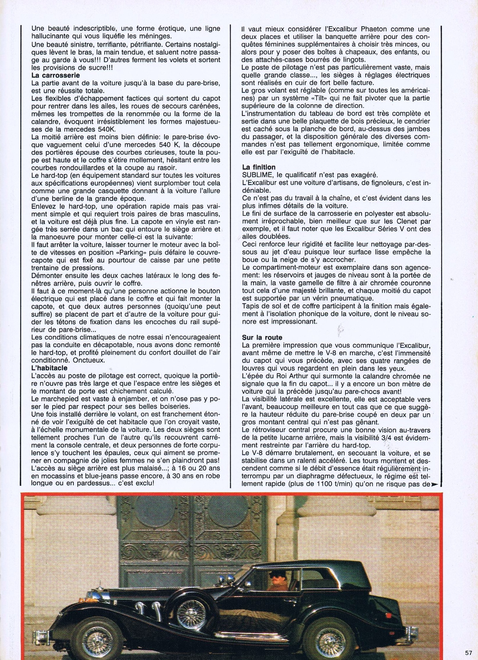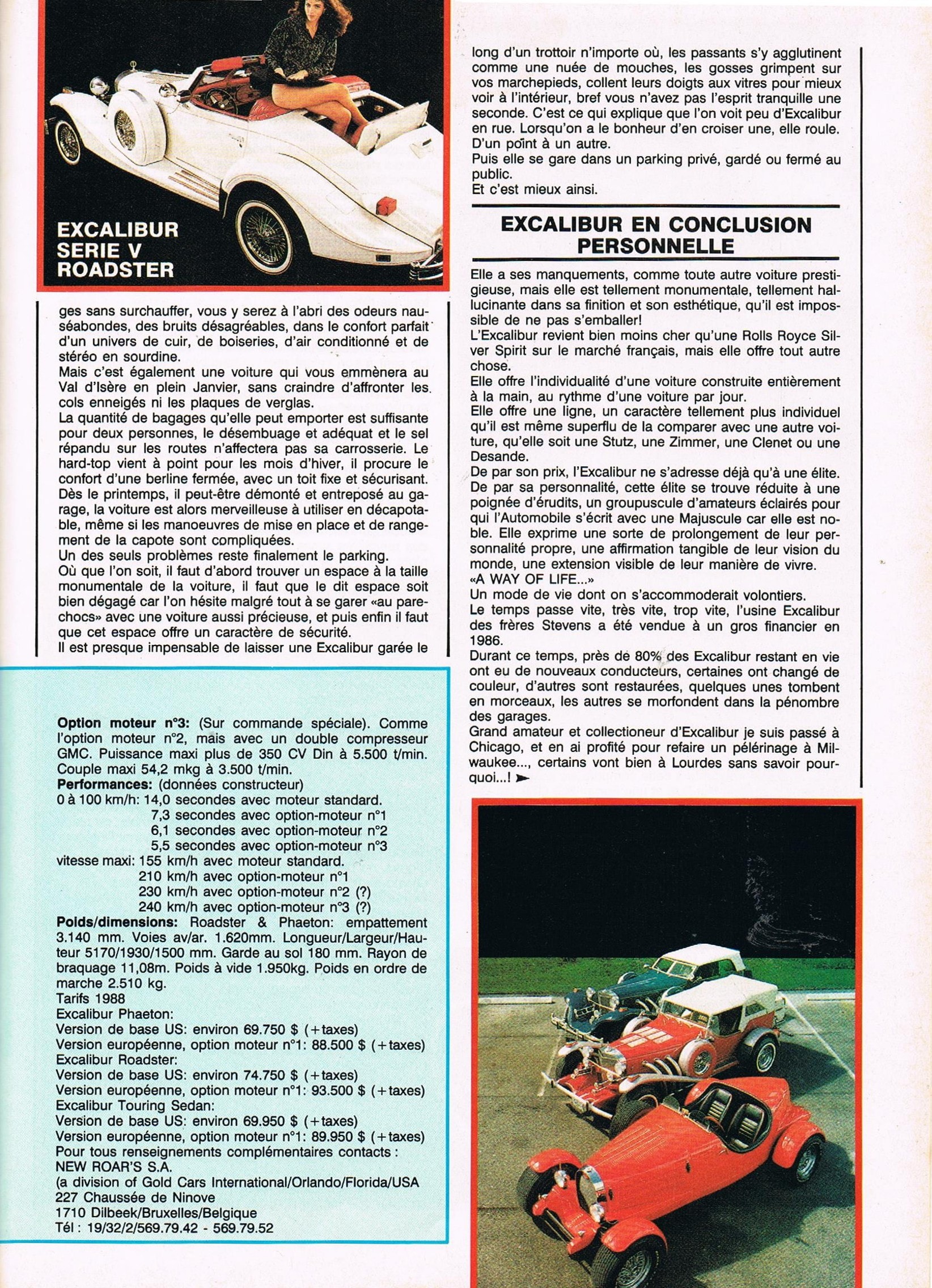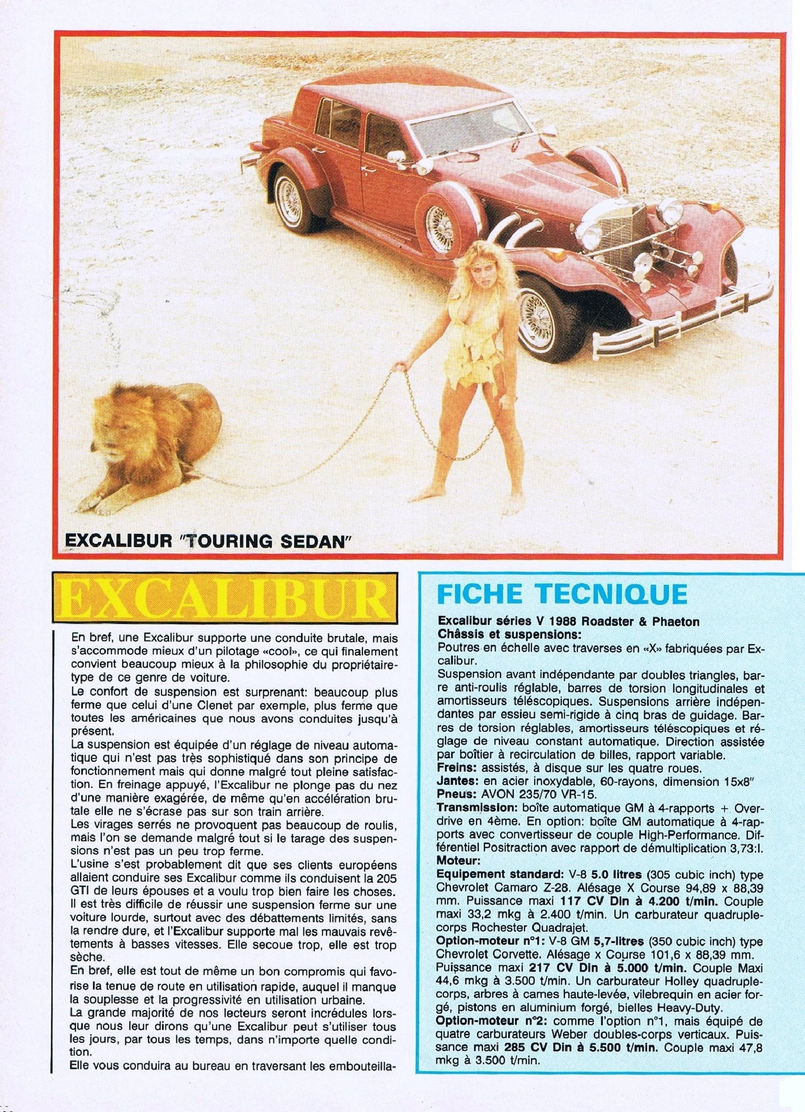 Ayant possédé durant tout ma chienne de vie, une trentaine d’Excalibur’s comprenant au moins un exemplaire de toutes les versions et séries fabriquées, je puis assurer que c’est du pipeau…, du vent…, de la poudre de perlimpinpin jetée à la face des gnous crédules…, si la SI était déjà mortellement vicieuse dès 60km/h…, la SII, lourde comme une machine à laver sur roulettes, faisait beaucoup de bruit pour épater la galerie et consommait 50 litres aux cent, tout ça pour pas grand chose d’autre que de la parade et du paraître…, elle était idéale et unique pour draguer en respectant “mine de rien” les limitations de vitesse, mais elle était totalement incapable de dépasser le seuil des 160km/h, les 120 km/h étant atteint au péril de la vie du conducteur intrépide (kamikaze) et de ses passagers (suicidaires)…, mais quelle belle bête !