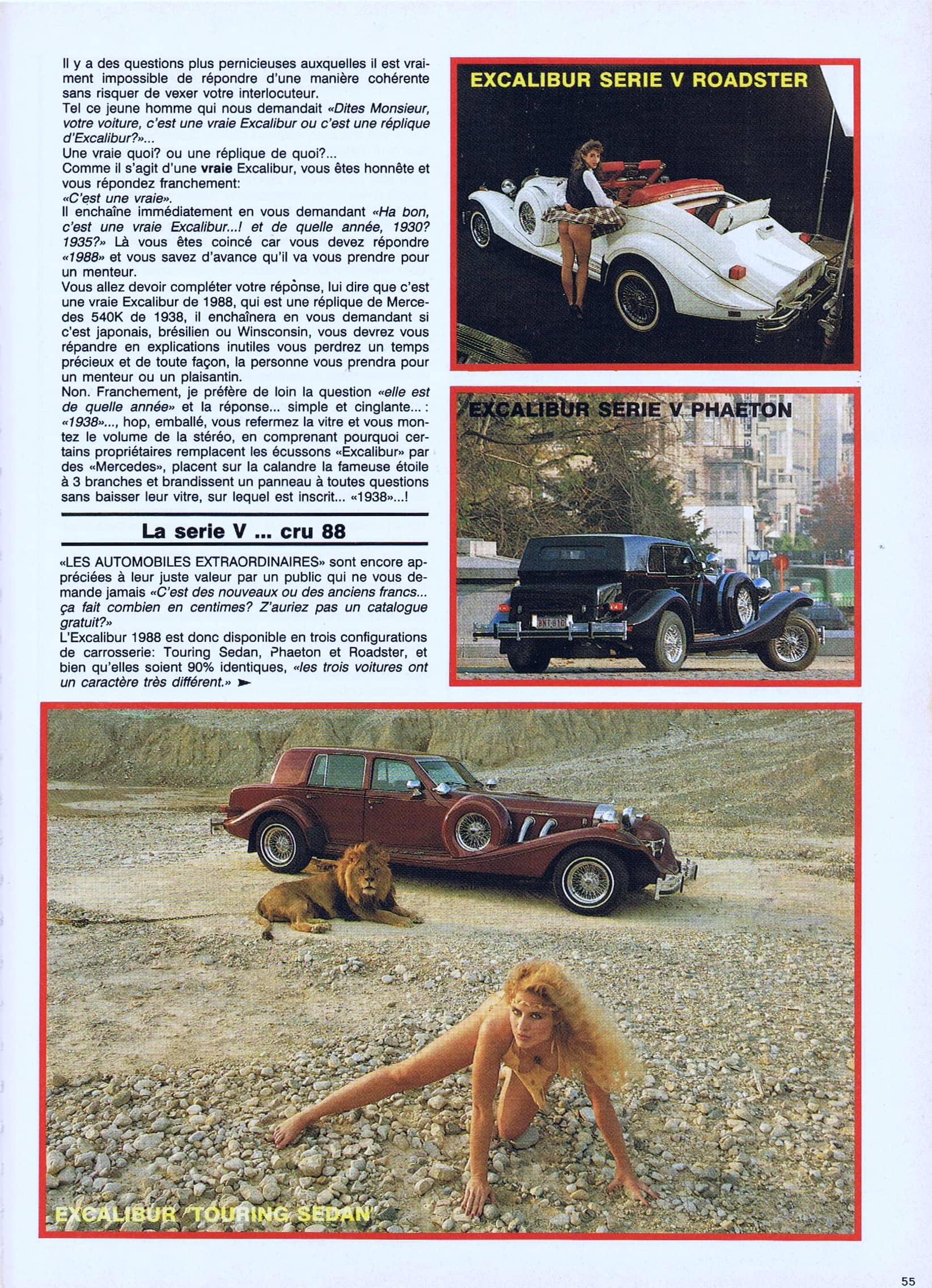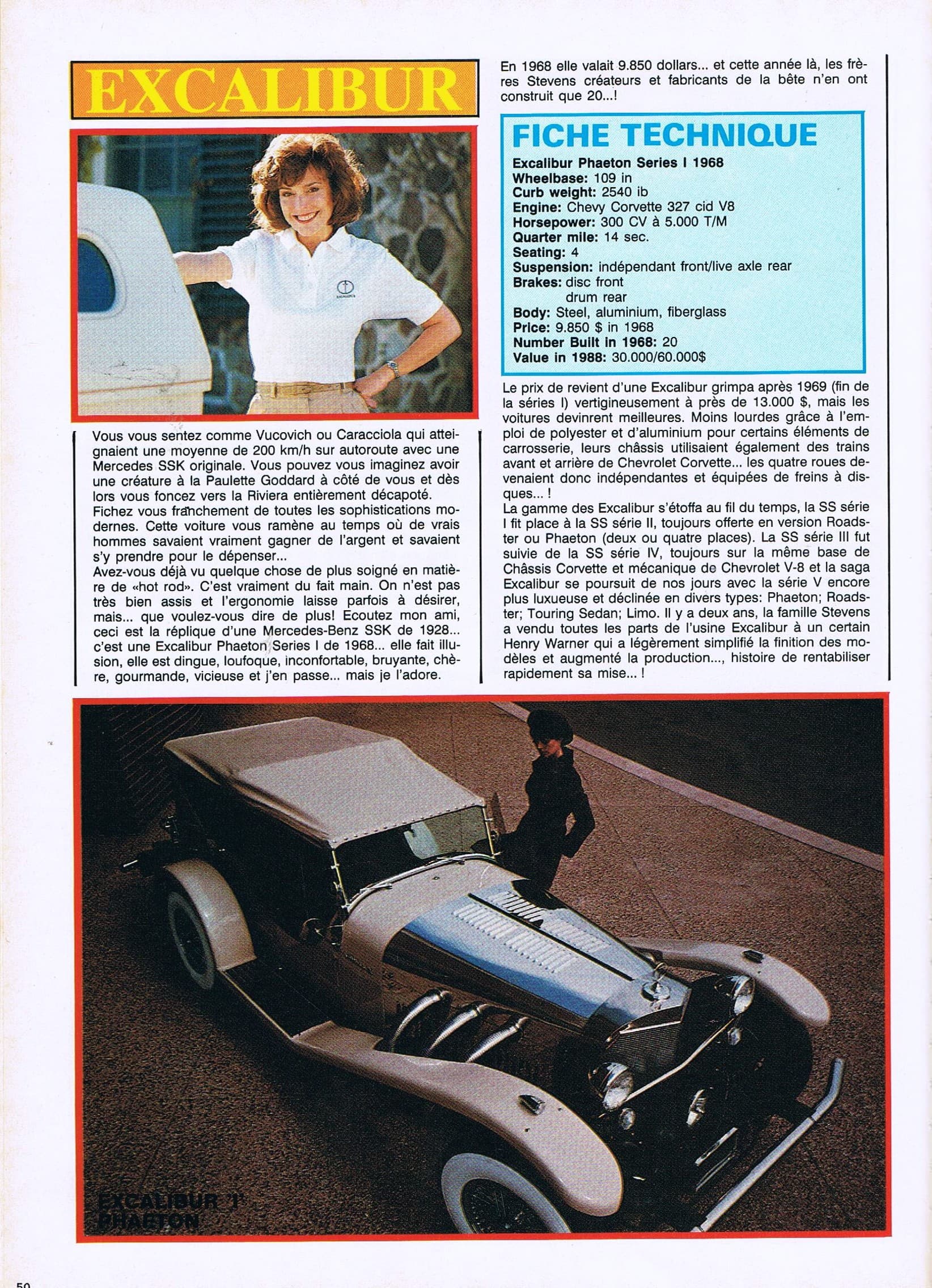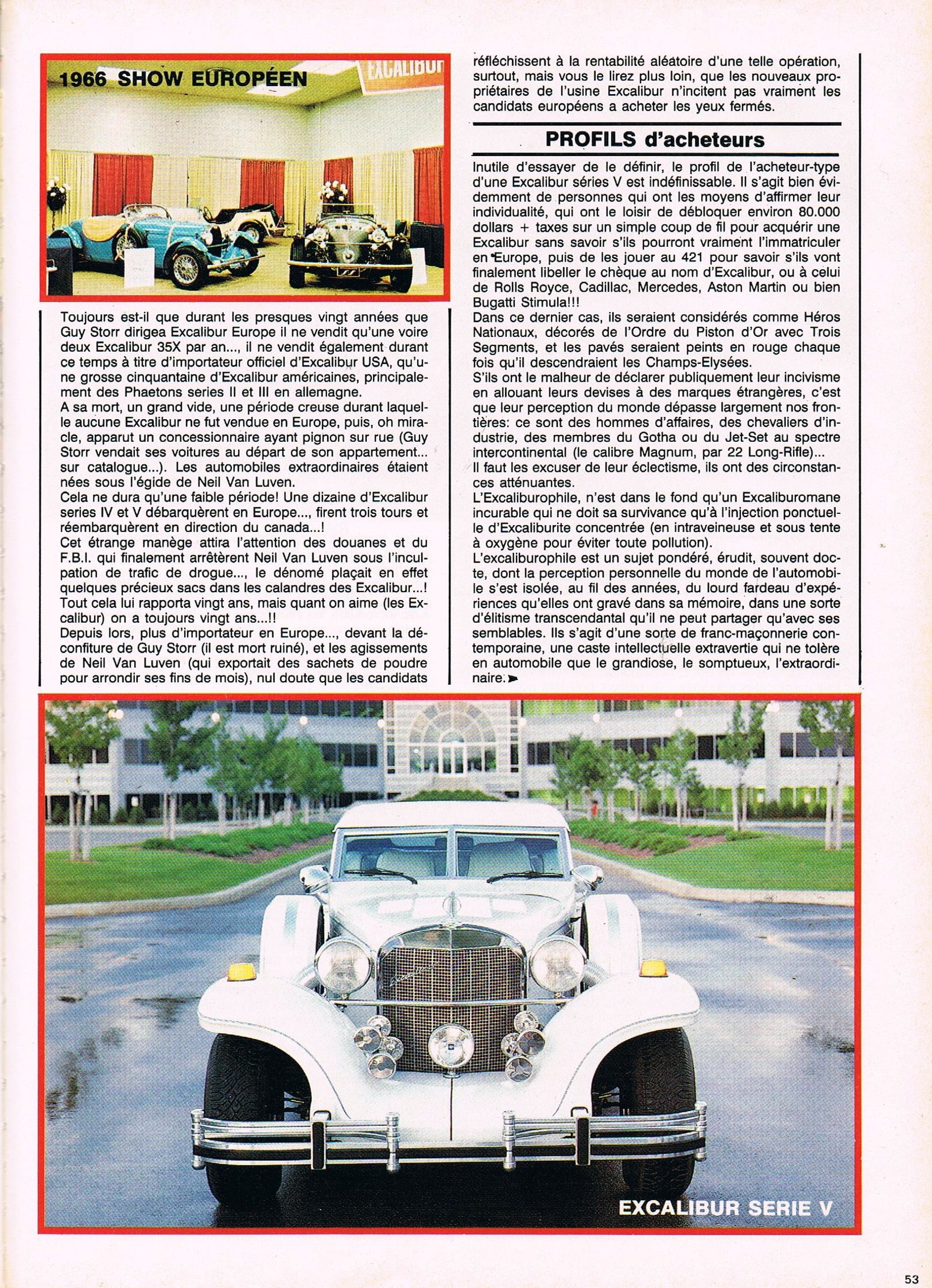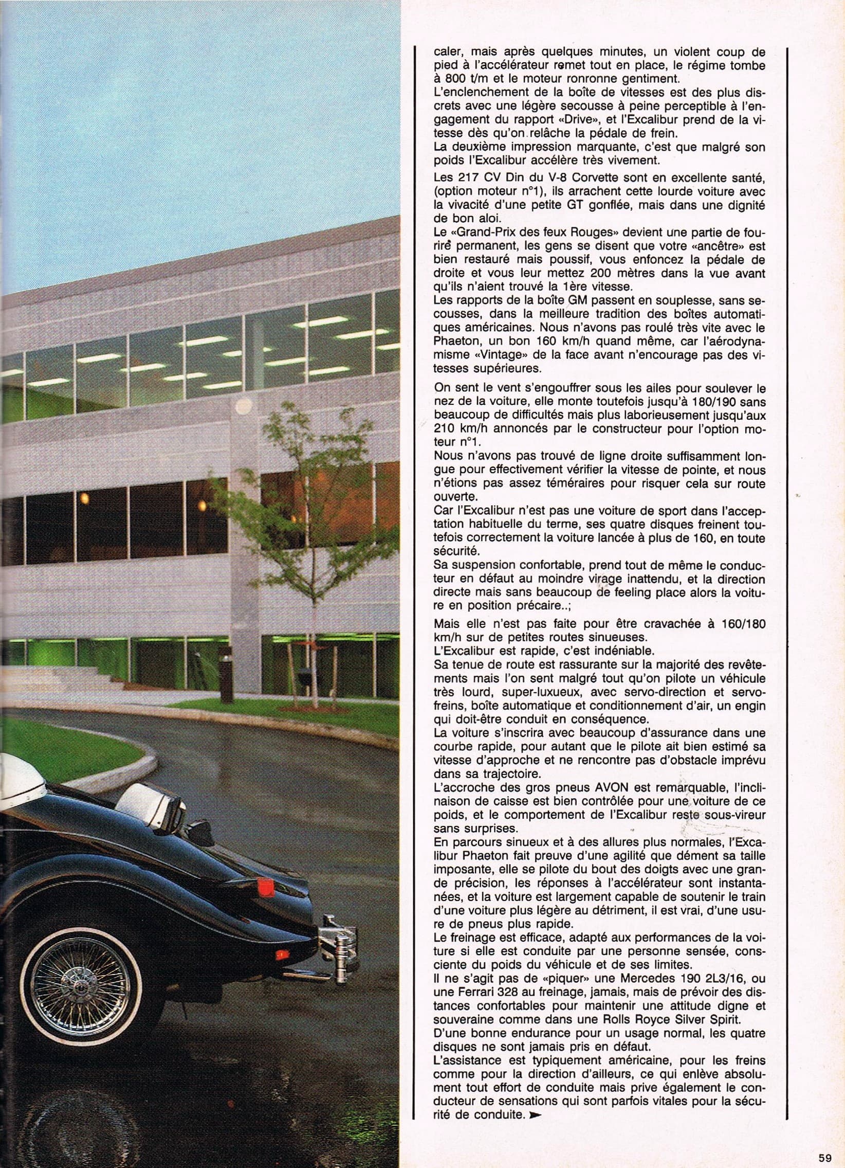 Ayant possédé durant tout ma chienne de vie, une trentaine d’Excalibur’s comprenant au moins un exemplaire de toutes les versions et séries fabriquées, je puis assurer que c’est du pipeau…, du vent…, de la poudre de perlimpinpin jetée à la face des gnous crédules…, si la SI était déjà mortellement vicieuse dès 60km/h…, la SII, lourde comme une machine à laver sur roulettes, faisait beaucoup de bruit pour épater la galerie et consommait 50 litres aux cent, tout ça pour pas grand chose d’autre que de la parade et du paraître…, elle était idéale et unique pour draguer en respectant “mine de rien” les limitations de vitesse, mais elle était totalement incapable de dépasser le seuil des 160km/h, les 120 km/h étant atteint au péril de la vie du conducteur intrépide (kamikaze) et de ses passagers (suicidaires)…, mais quelle belle bête !