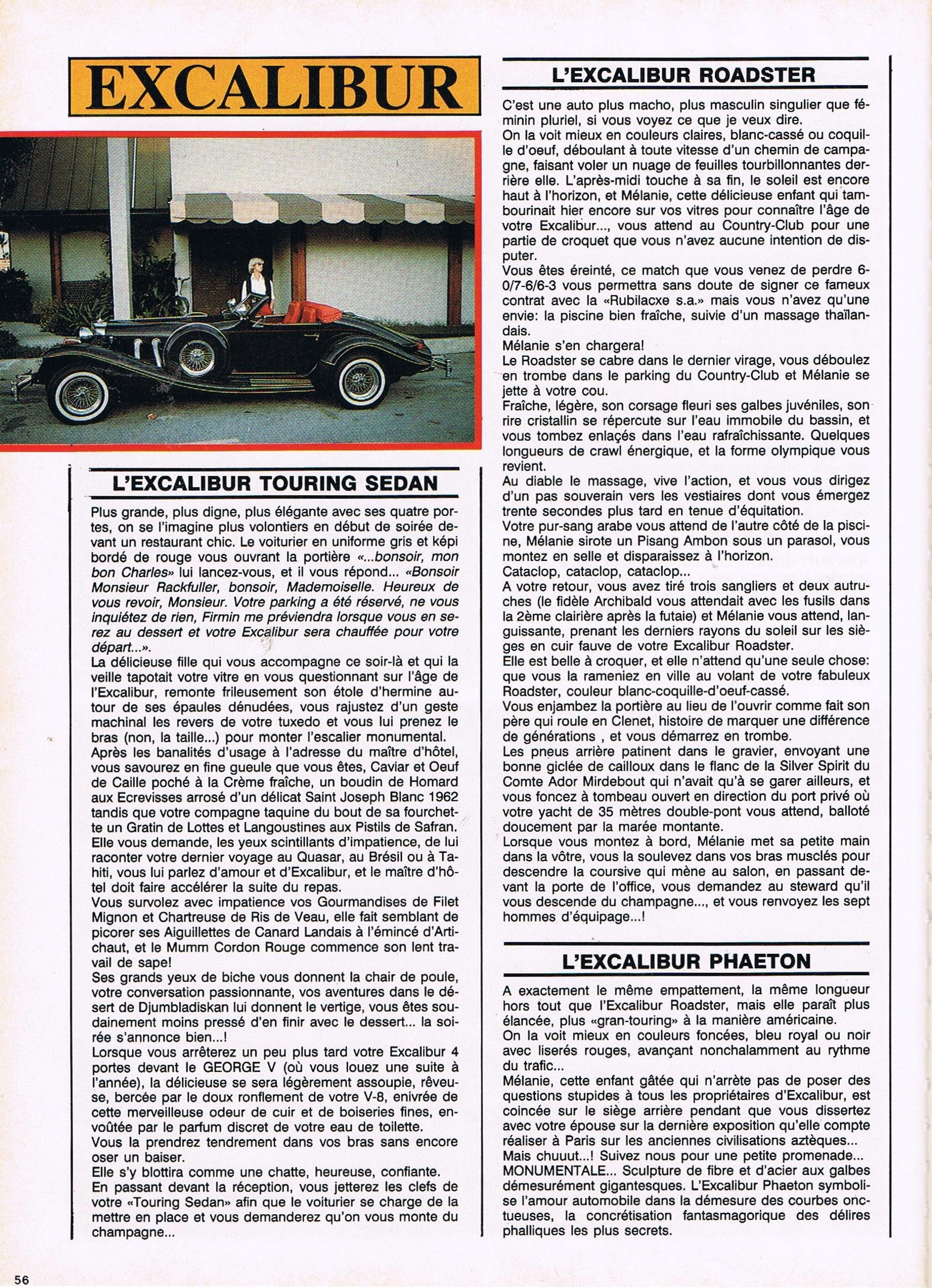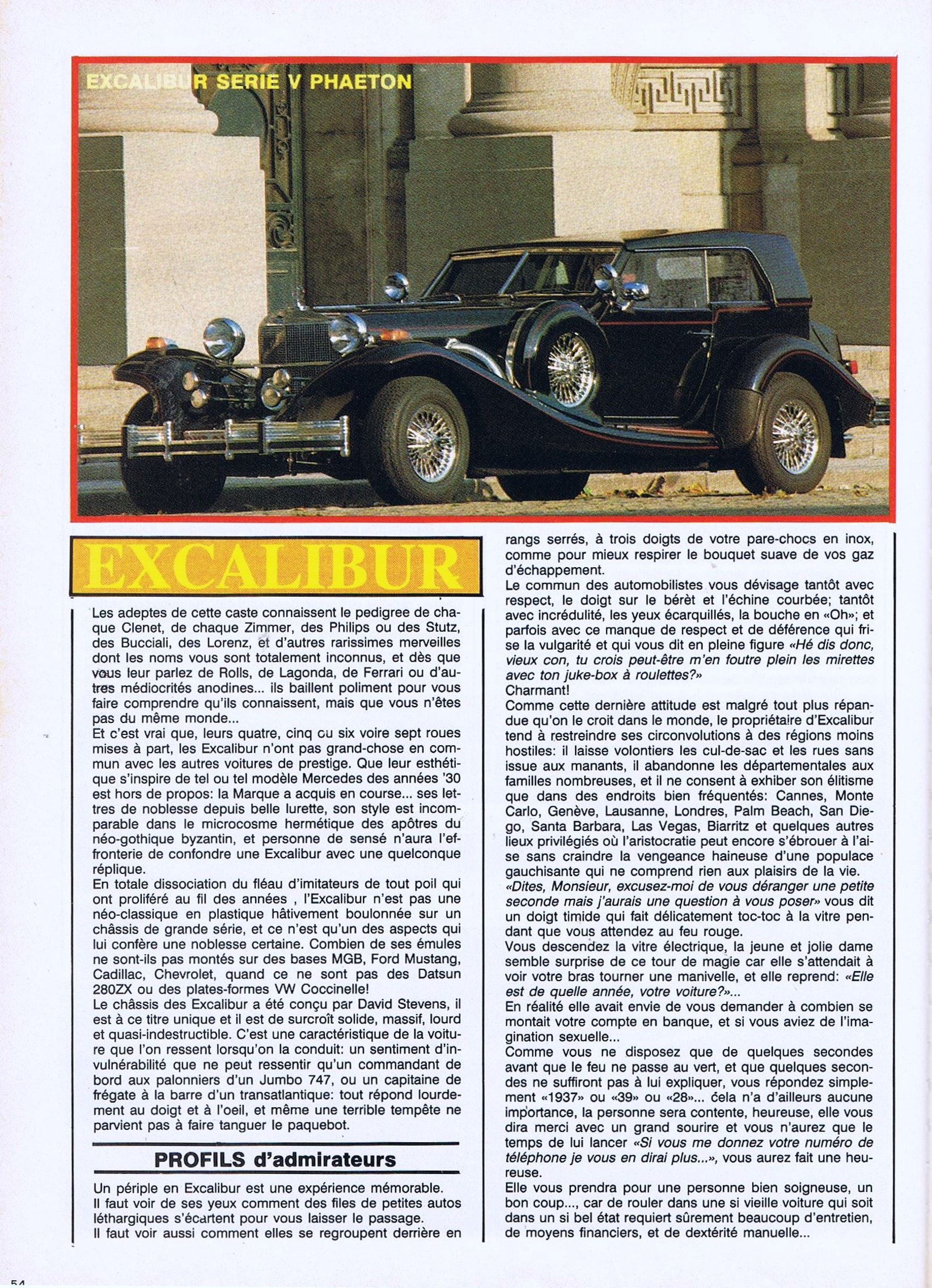J’avais lu dans un magazine que Johnny (Halliday) avait troqué sa Lamborghini Miura (une autre pitrerie) contre une Excalibur S1… et que Steve McQueen en possédait une, lui-aussi…, donc j’en ai rêvé, il m’en fallait une…, mais chacune coûtait toujours trop cher, même au fur et à mesure de mon vieillissement (inexorable)…