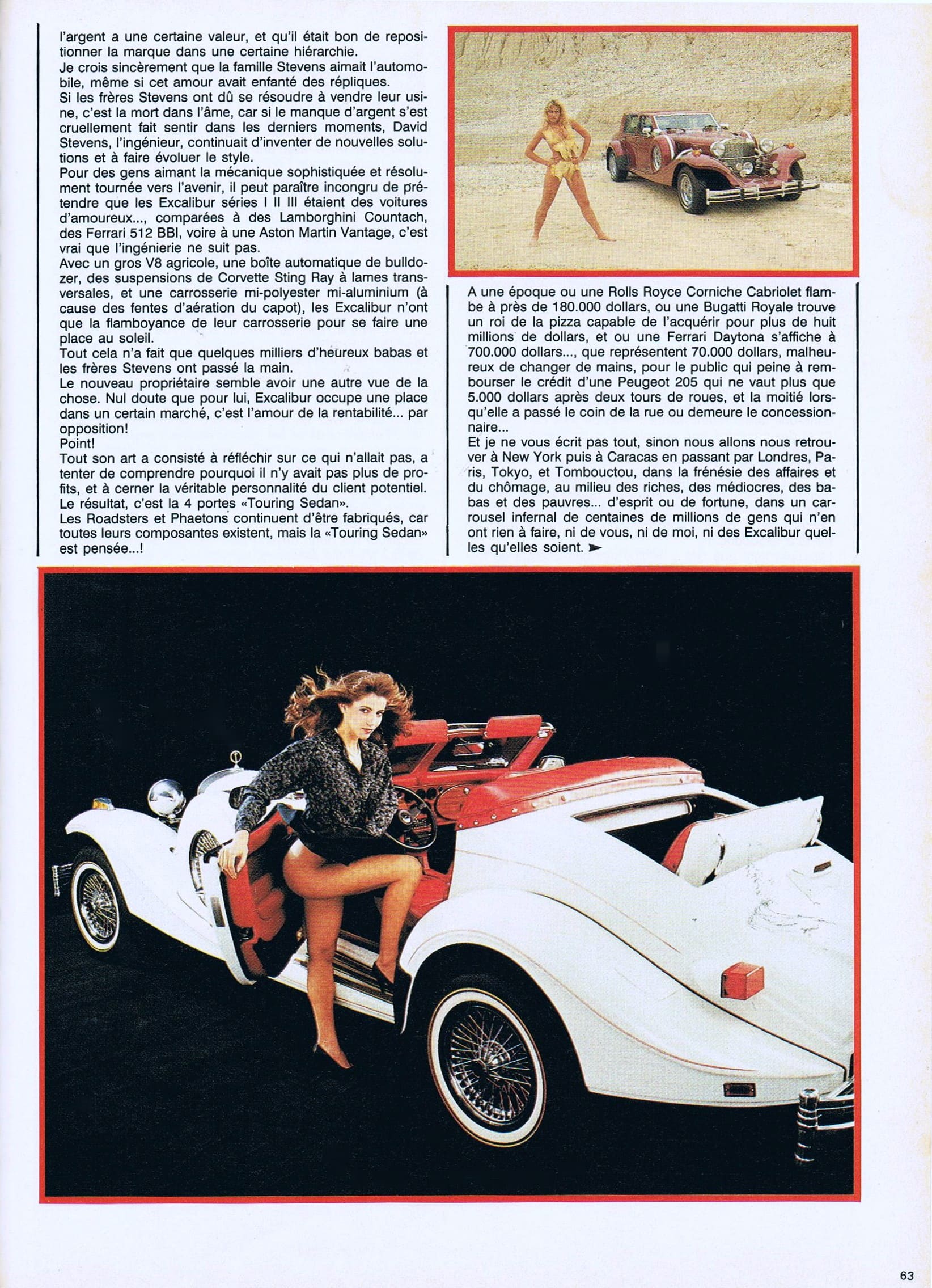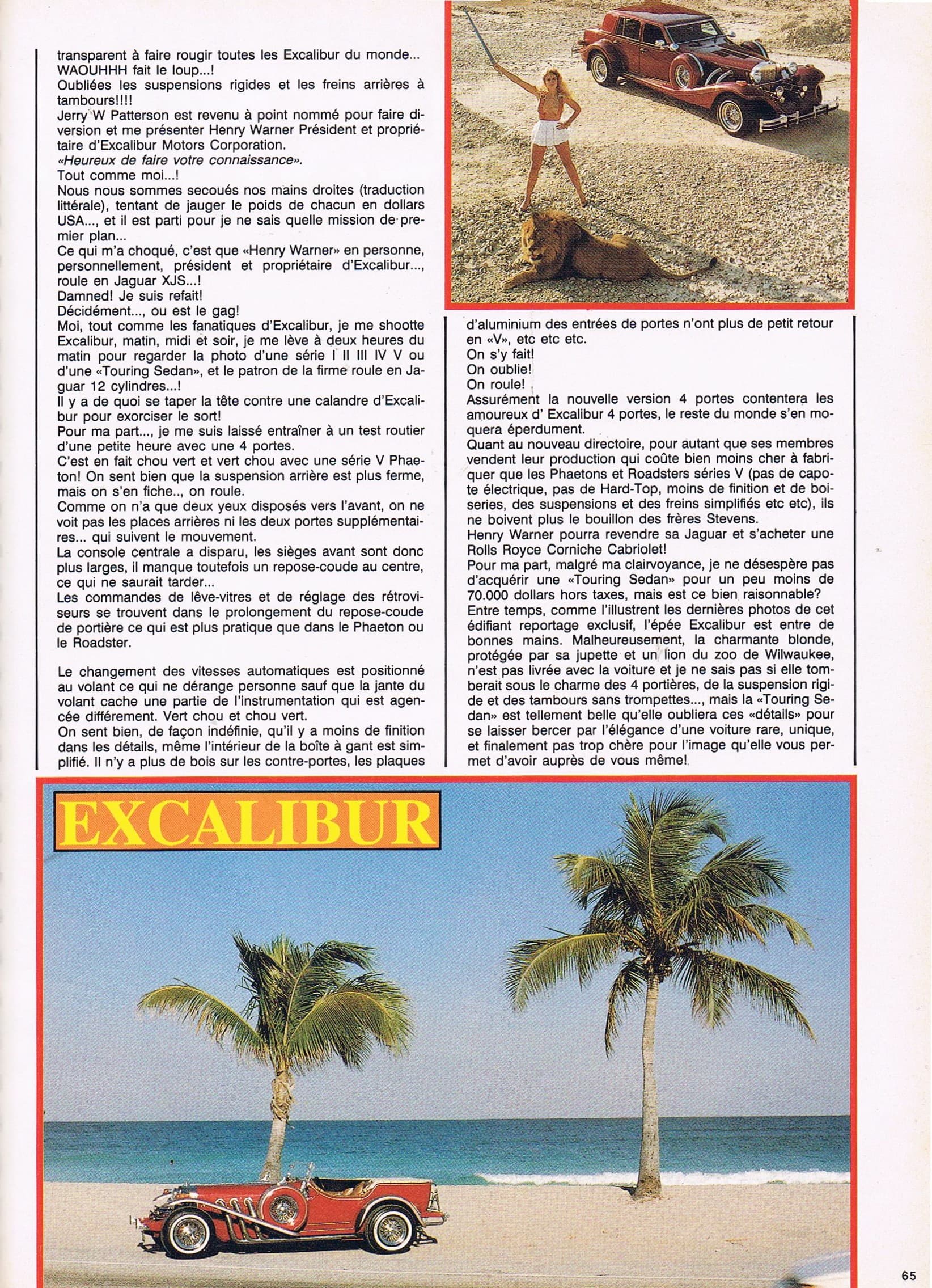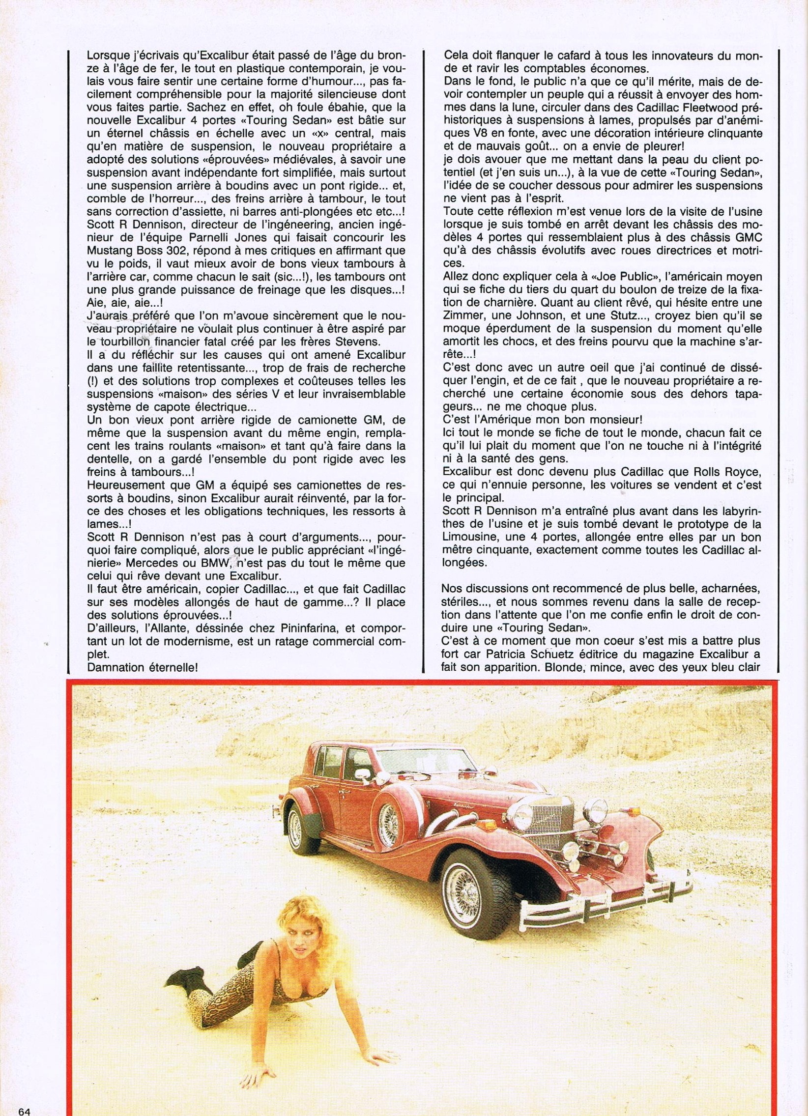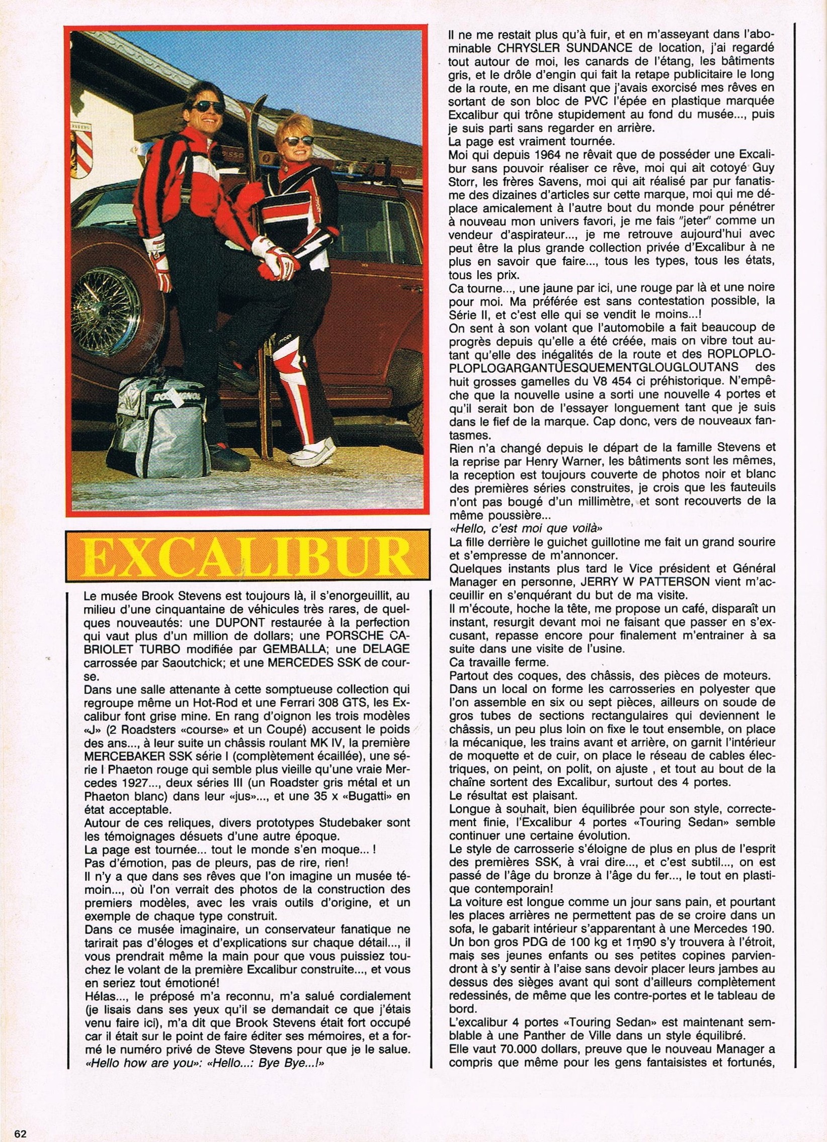 Tous ses efforts financiers, toute cette nouvelle diversité à la gloire du plastique, ne changent rien au déclin de la marque…, 6 Roadster’s…, 57 Phaeton’s…, les 4 Excalibur’s à toit fixe “Royal”… et 21 “Limited 100″… sont fabriqués et vendus en 1986, soit 88 Excalibur’s…