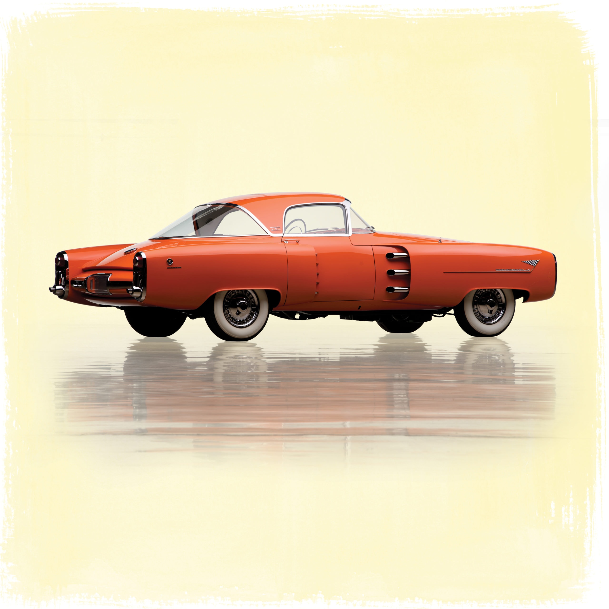 Tout était kitchissime et faux (faux échappements le long des ailes, fausses entrées d’air de refroidissement des freins à tambours) dans l’arrière des portes et faux hard-top (la voiture n’étant pas décapotable)…, mais c’était exubérant, toutefois sans aucun sens de la vocation première d’une auto qui est de pouvoir déplacer des gens et des choses d’un point A vers un point B…, toute l’auto avait donc été pensée trop grande (à l’américaine), la section centrale étant dessinée arrondie façon carlingue de Jet-fusée… et les ailes étaient comme des cônes “coniques” (sic !) intégrés à chaque extrémité, façon réacteurs positionnés dans les ailes intégrant les pontons extérieurs…