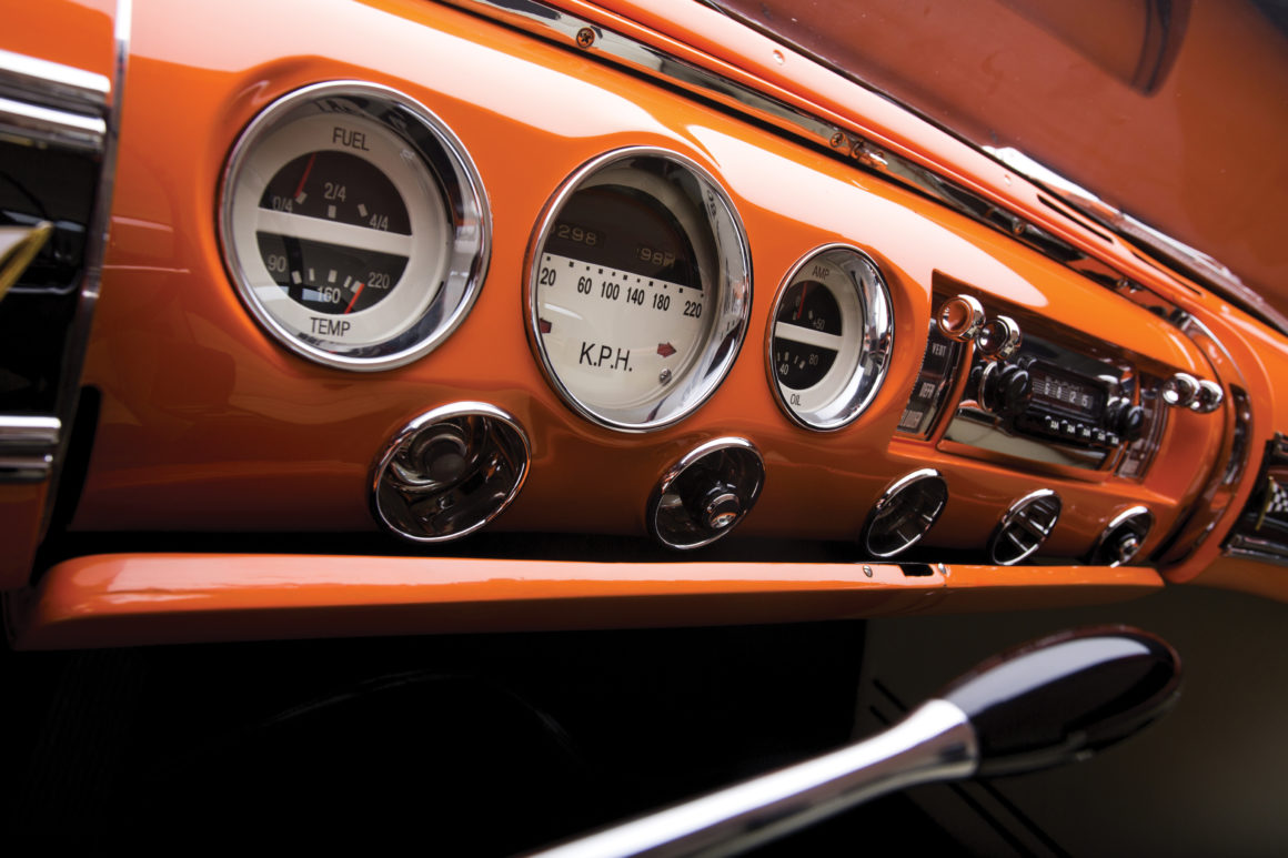 Conducteur et passager se retrouvaient devant un carénage amovible du haut en bas (et inversément), façon boîte de rangement de pain, une fois fermé formait la continuation de la bande d’insert noir encadrée de baguettes chromées recouvrant les panneaux orange, et portant, en lettres majuscules un fier, “INDIANAPOLIS” derrière le dit couvercle se camouflant la banque complète d’instruments divers…