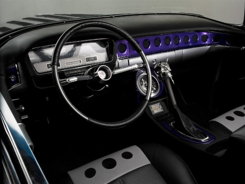 En ouvrant les portes de ce coffre-fort à roulettes, on découvre un tableau de bord gainé de cuir teinte terre brûlée avec une pointe de violet… et une console centrale comportant des jauges de Classic Instruments…, oeuvre “immortelle” de Pat Russell de PJ’s Trim Shop à Hemlock dans le Michigan.