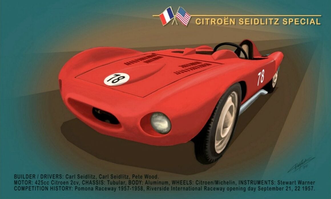 En recherchant les traces laissées par cette automobile hors du commun dans la base de données “racingsportscars.com”, nous avons découvert que la Citroën Seidlitz a été inscrite dans divers événements à Pomona et Riverside en 1957, avec Seidlitz et Pete Woods répertoriés comme pilotes, la 2CV rivalisant avec audace avec diverses sportives ! Cette voiture de course à carrosserie en aluminium avec moteur Citroën 2CV disposait d’une boite 5 vitesses, d’un rarissime carburateur double-corps mis en place à l’avant-centre d’un chassis tubulaire disposant de trains roulants Panhard !!!!