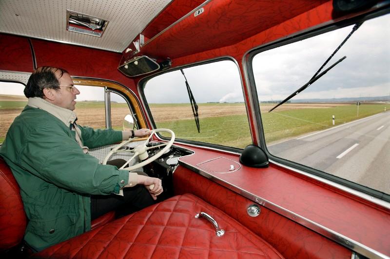 The cab-over-engine design took its time in gaining a foothold in Germany in the 1950s before it experienced a sudden boom in 1958, caused by the restriction of combination length. The LP 333 proved to be a highly modern representative of its kind, and not only by dispensing with a nose which has disappeared almost completely today. Its single-plate dry clutch, for instance, required astonishingly low pedal pressure. Little strength was equally required for turning the almost horizontal, ivory-colored four-spoke steering wheel.