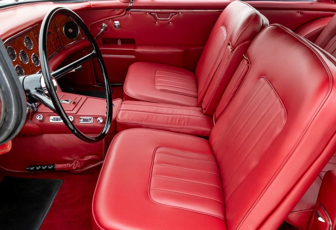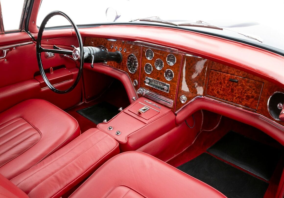 Aujourd’hui finie avec élégance dans un bleu profond riche avec un intérieur rouge éclatant et des finitions en acier inoxydable finement remises à neuf et des jantes bimétalliques Borrani d’usine, c’est un exemple époustouflant du grand hybride franco-américain qui affiche ses prétentions sous une valeur de 300.000$… Le luxe du milieu du siècle passé est pleinement présent dans l’habitacle de quatre places grâce au magnifique cuir rouge, aux tapis, aux tissus larges et aux garnitures en faux bois peintes à la main, tous finis selon des standards de qualité de concours.