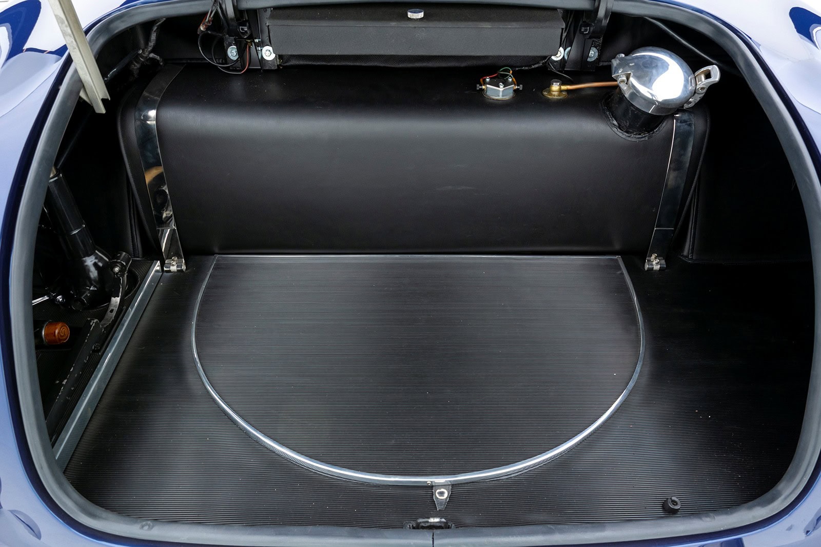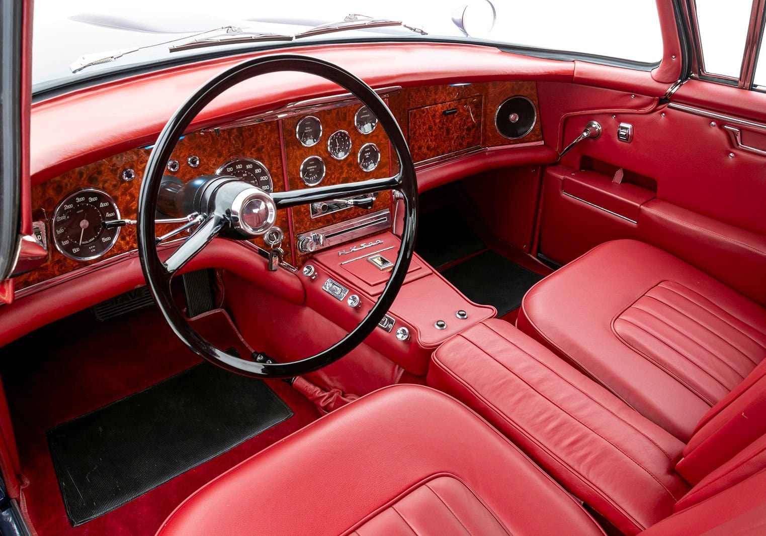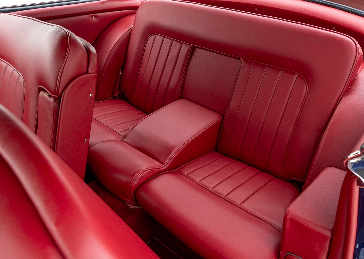Aujourd’hui finie avec élégance dans un bleu profond riche avec un intérieur rouge éclatant et des finitions en acier inoxydable finement remises à neuf et des jantes bimétalliques Borrani d’usine, c’est un exemple époustouflant du grand hybride franco-américain qui affiche ses prétentions sous une valeur de 300.000$… Le luxe du milieu du siècle passé est pleinement présent dans l’habitacle de quatre places grâce au magnifique cuir rouge, aux tapis, aux tissus larges et aux garnitures en faux bois peintes à la main, tous finis selon des standards de qualité de concours.