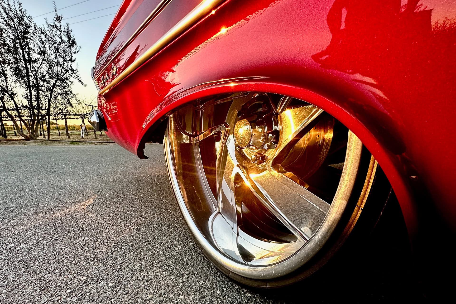 Des coussins pneumatiques “Slam Specialties SS-6” ont été installés à l’avant et des “Slam Specialties SS-7” à l’arrière. Les passages de roues de l’Impala ’61 abritent des jantes “Raceline” en aluminium usiné, de 20×8,5po à l’avant et de 22×10po à l’arrière. Pour une adhérence optimale par tous les temps, ces jantes sont chaussées de pneus ultra-performants “Delinte Thunder D7” : des 225/35ZR20 à l’avant et des 265/30ZR22 plus larges à l’arrière, créant ainsi un déport latéral. Le système de freinage a été entièrement revu grâce à l’installation de kits ABS à l’avant et à l’arrière. “Percés et rainurés”, m’a précisé Junior. Un maître-cylindre servo-frein “Wilwood” et une pompe à vide électrique “Leeds Brakes Bandit” ont été ajoutés pour cette conversion. En 1961, Chevrolet proposait la couleur Rouge Romain. La première Impala de Junior était peinte en rouge, mais pas d’un rouge Chevrolet.