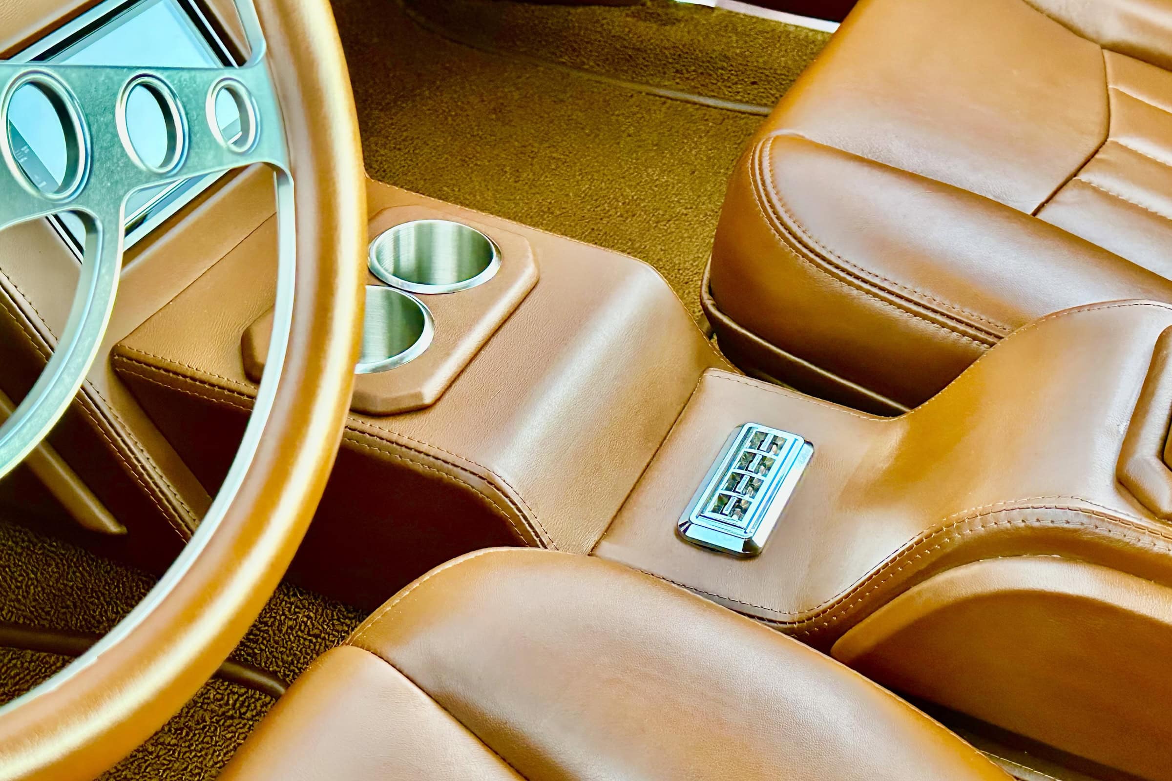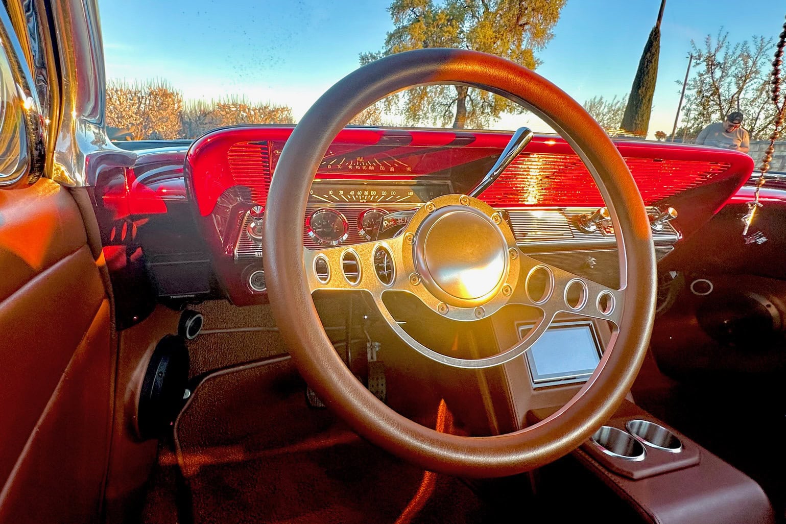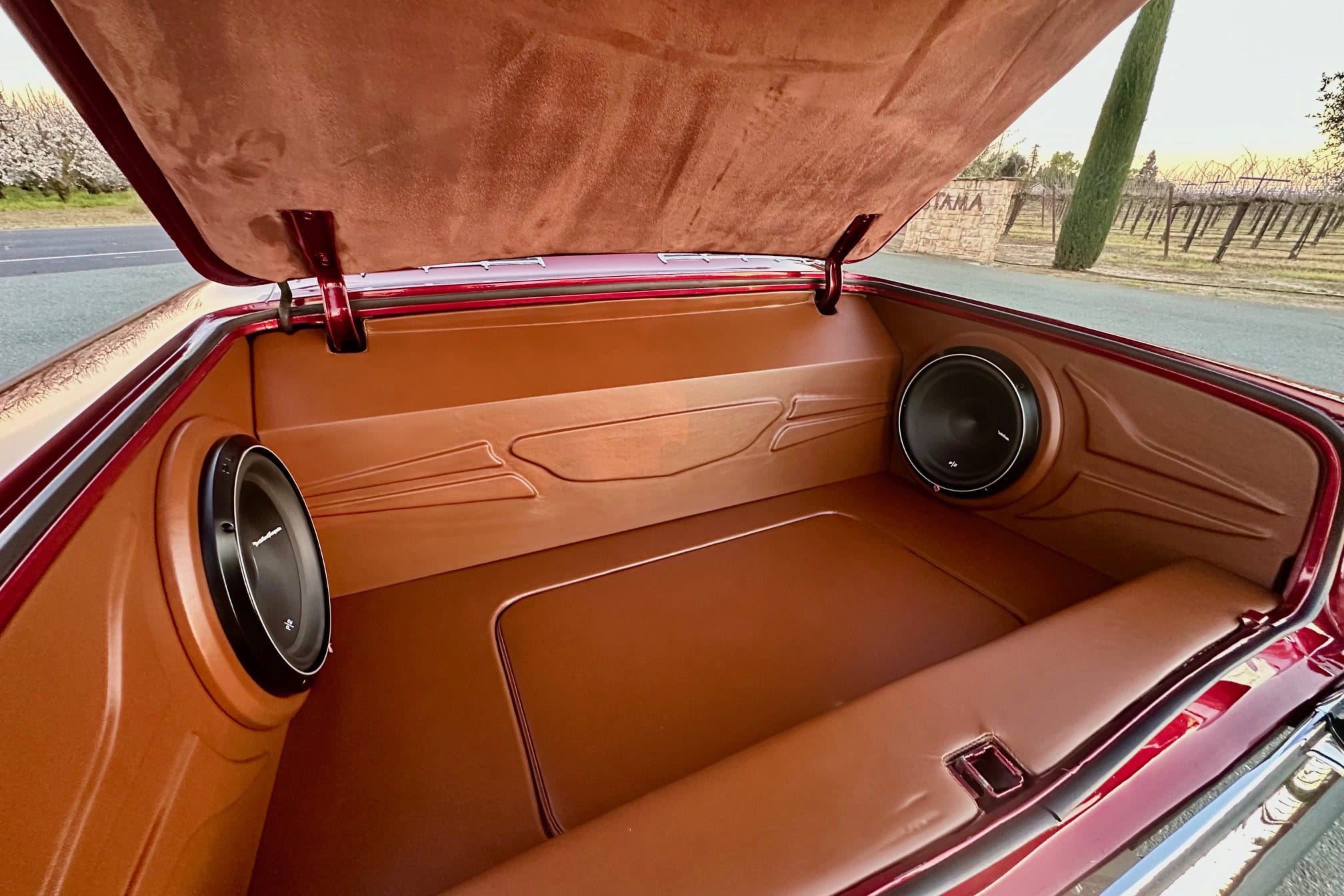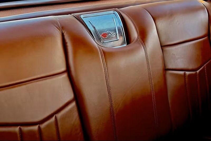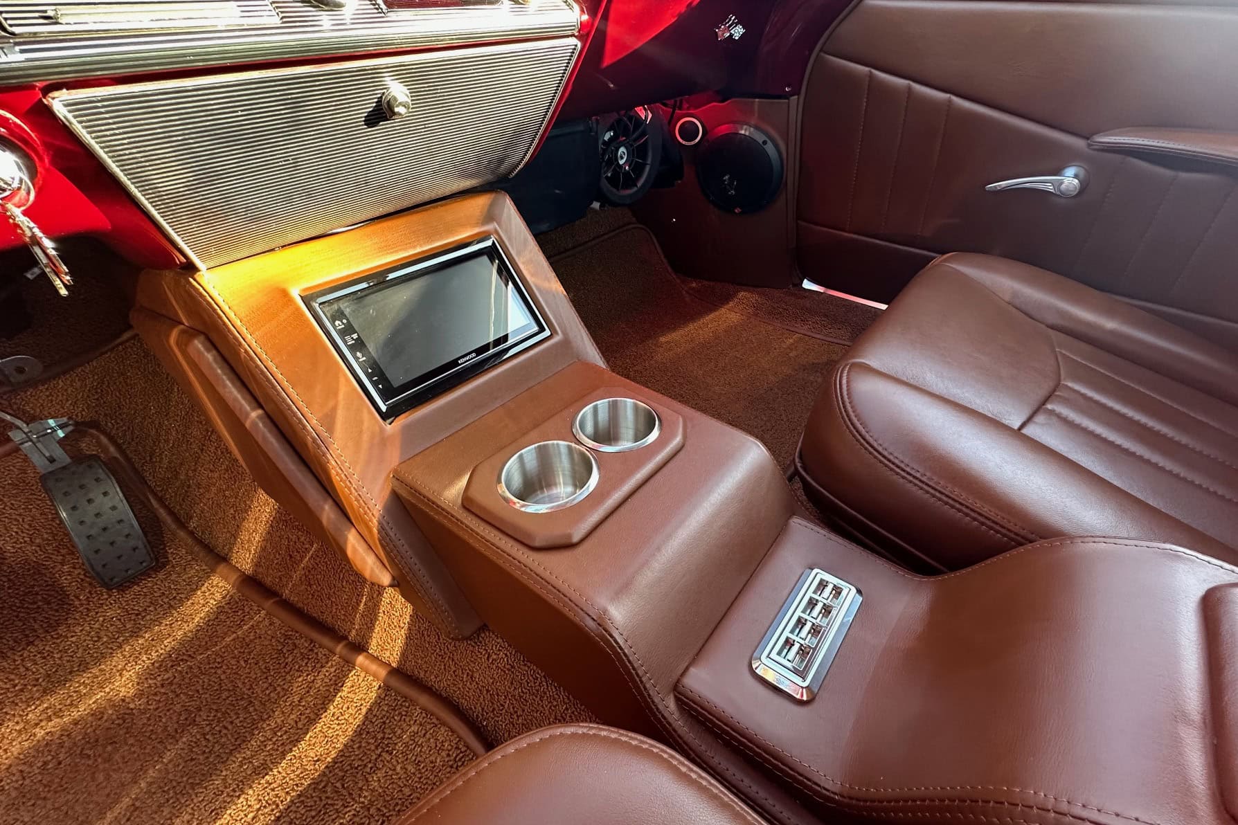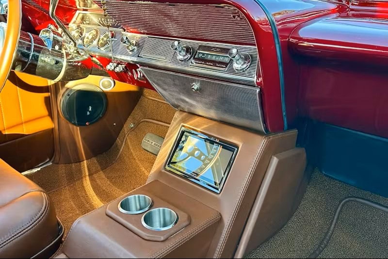 Il s’agissait d’une couleur Chrysler. “Une fois peinte, elle n’avait pas l’effet que j’attendais”, se souvient-il. “Du coup, j’ai choisi ce rouge vif, presque comme un bonbon. Mais à part ça, c’est fou à quel point ce rouge ressemble à mon ancienne Impala”… Pour cette Impala 2.0, Junior. a opté pour le Rouge Rubis de Ford. La peinture a été réalisée par “Alex’s Auto Body & Paint”. Souhaitant, une fois de plus, surpasser sa première Impala, Junior. a choisi une couleur intérieure plus foncée : “Elle était plutôt couleur beurre de cacahuète”, se souvient-il à propos de son ancienne Impala : “Elle paraissait foncée, mais pas comme ça, et je la voulais plus proche de la couleur tabac de cette Impala”… Les sièges baquets en cuir couleur cigare provenaient d’une Thunderbird de 1964. Au final, sa palette de couleurs ressemblait à une version survitaminée et dopée de la Corvette rouge classique.