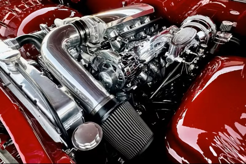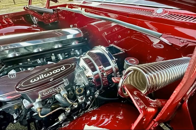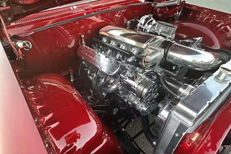 Ce véhicule était équipé du Chevy 283, comme la grande majorité des Impala V8… Le 283 de base était doté d’un carburateur Rochester double corps développant 170cv, tandis que le 283 Turbo-Fire, en option, était équipé d’un carburateur quadruple corps produisant 230cv. À l’époque, cette option coûtait 136 dollars supplémentaires… “Raceline Billet Wheels a fourni les jantes surdimensionnées : 20po à l’avant et 22po à l’arrière”… Bien qu’un moteur d’origine soit un atout indéniable en collection, Junior. recherchait avant tout la fiabilité moderne pour sa nouvelle Impala. Il a donc opté pour une conversion avec un V8 LS avec injection. Le compartiment moteur de l’Impala abrite désormais le Chevy V8 LS1 5L7 Génération III, équipé d’un carburateur Holley Terminator X Max. Ce moteur LS est couplé à une transmission 4L60E.