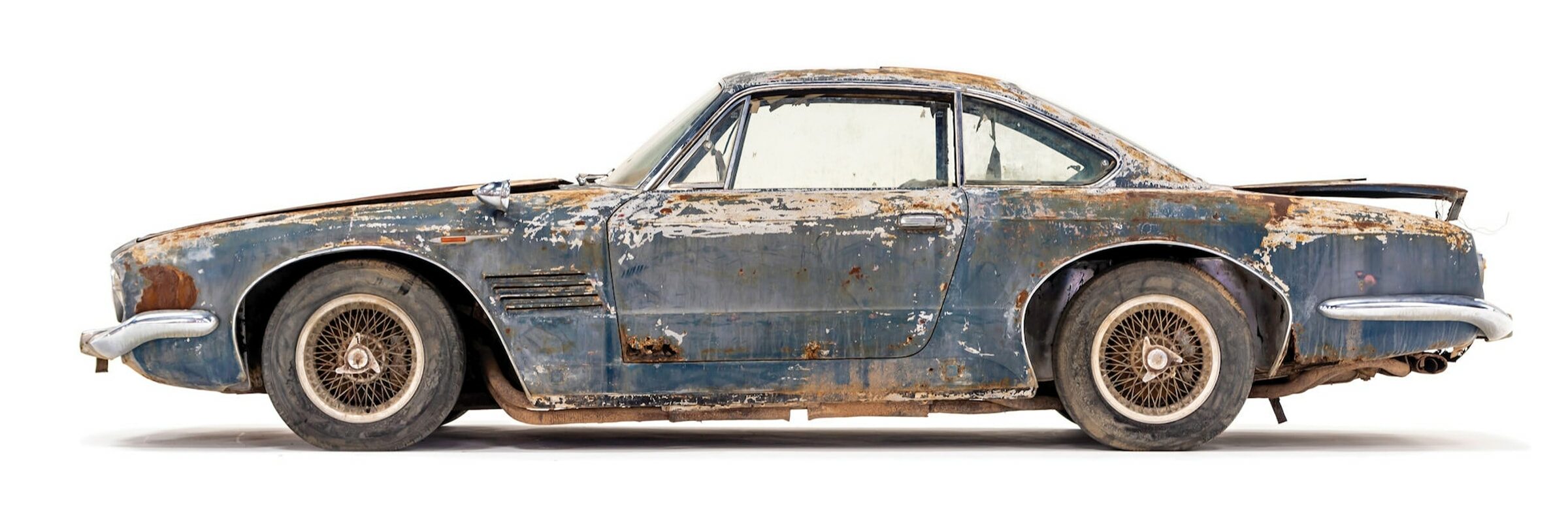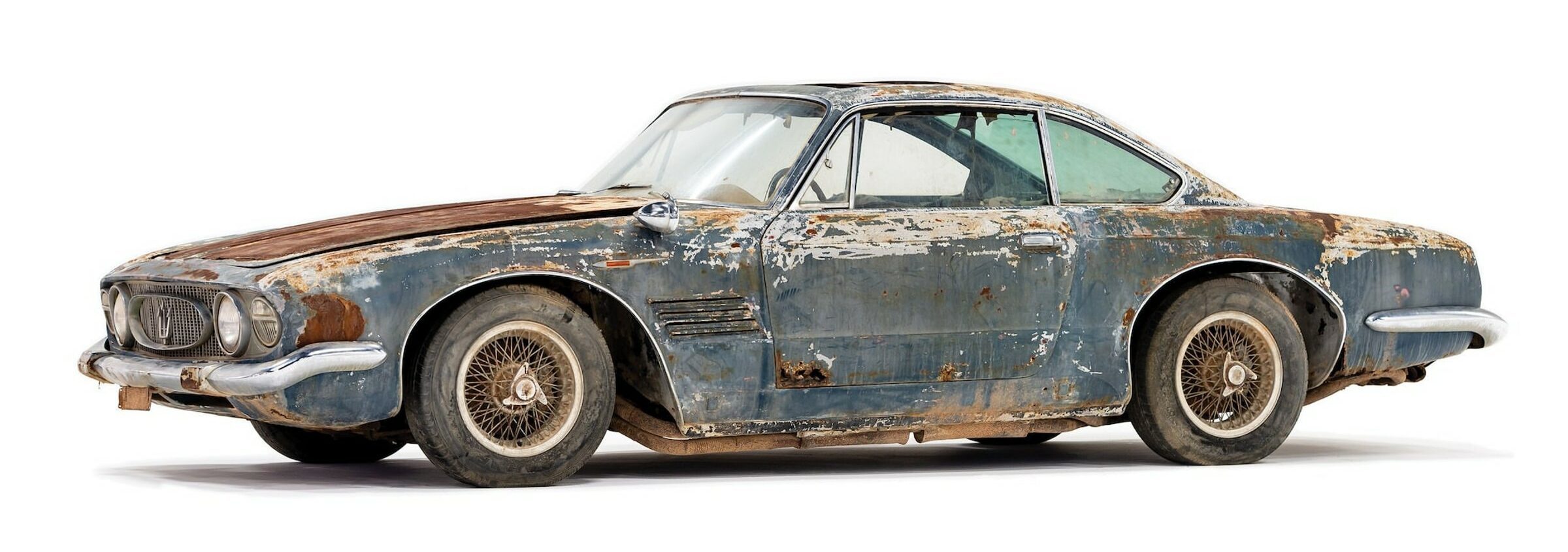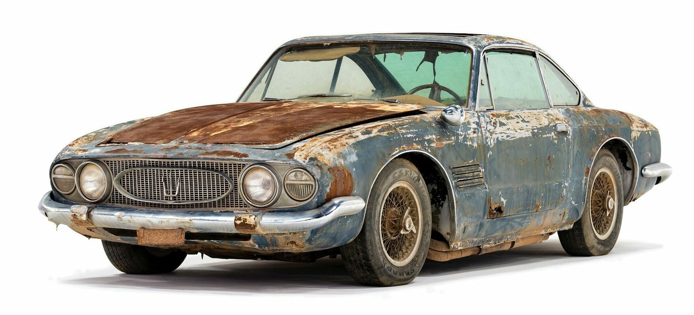 Voyez les photos de cette Maserati pourrave, c’est la carcasse-épave d’une Maserati 5000 GT… Et vous vous êtes mis à me lire après avoir zieuté les photos, je me f… de ce que vous en pensez, pour ma part c’est un magnifique objet décoratif qui serait au TOP dans un jardin, et je vais allumer des bougies pour qu’elle reste ainsi, comme un symbole du temps qui passe, car refaite, rien d’elle ne sera plus jamais authentique, pis qu’une réplique, c’est mon idée philosophique, mais “les ayants-droits” de l’épave qui ne sont que des faux voleurs et vrais opportunistes, ne cherchent qu’à en tirer grand profit.
