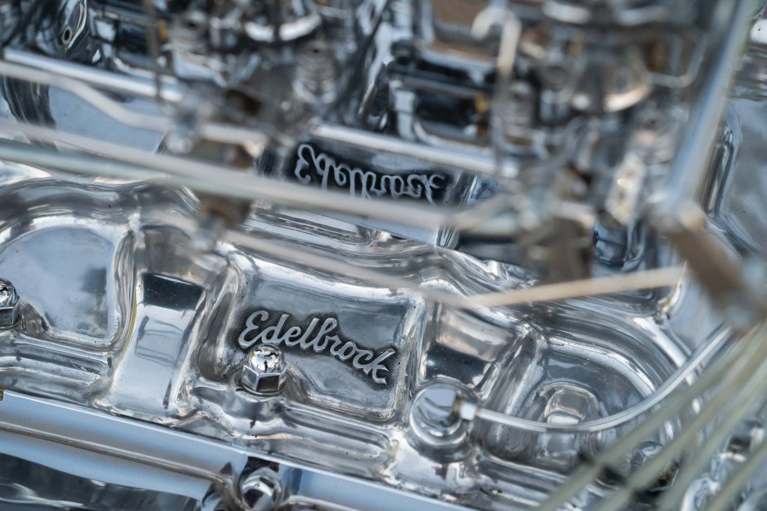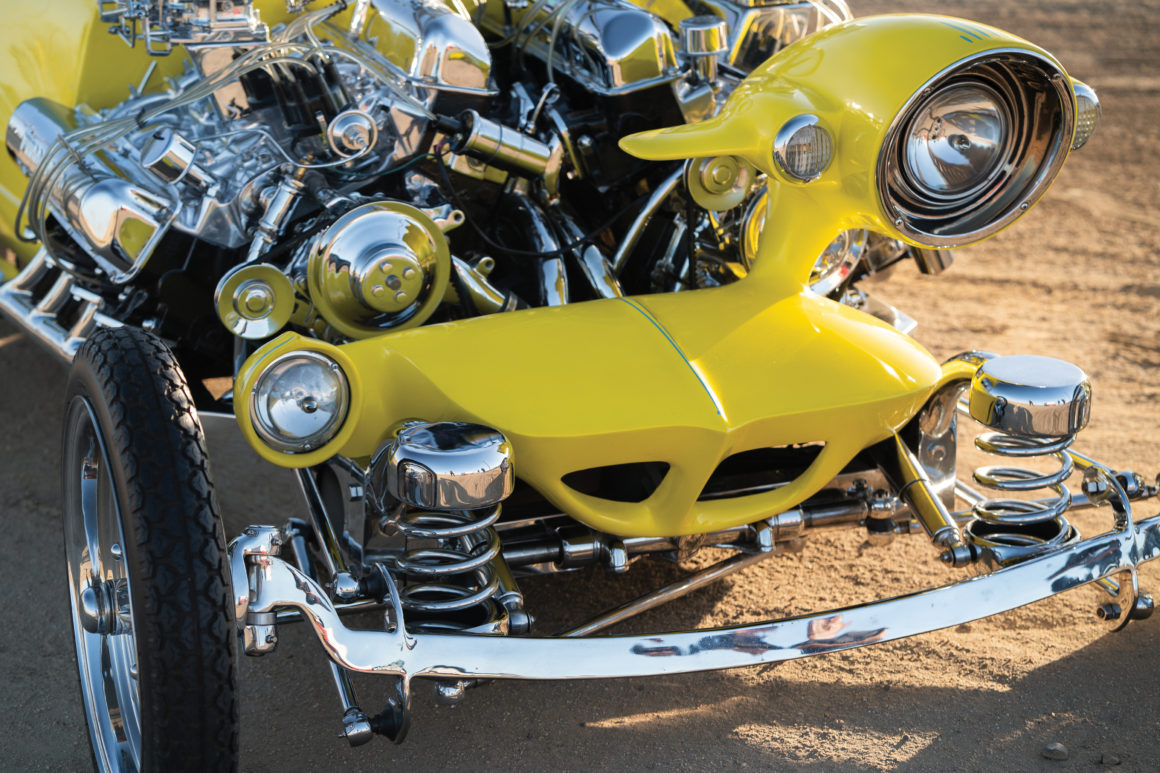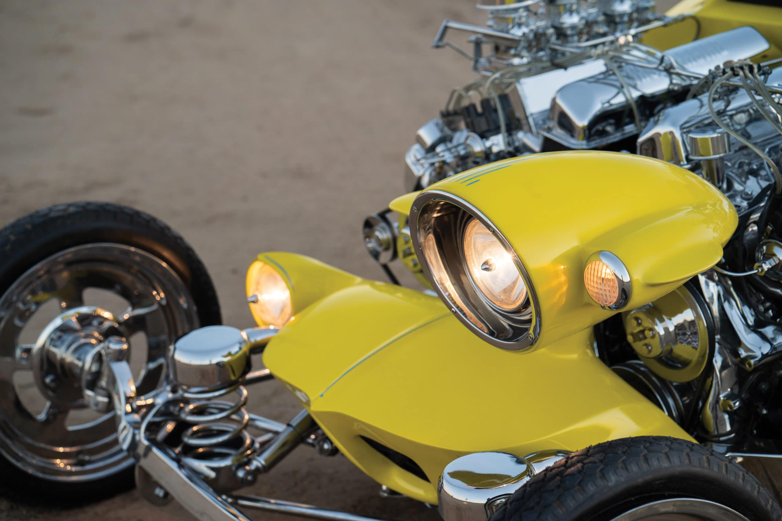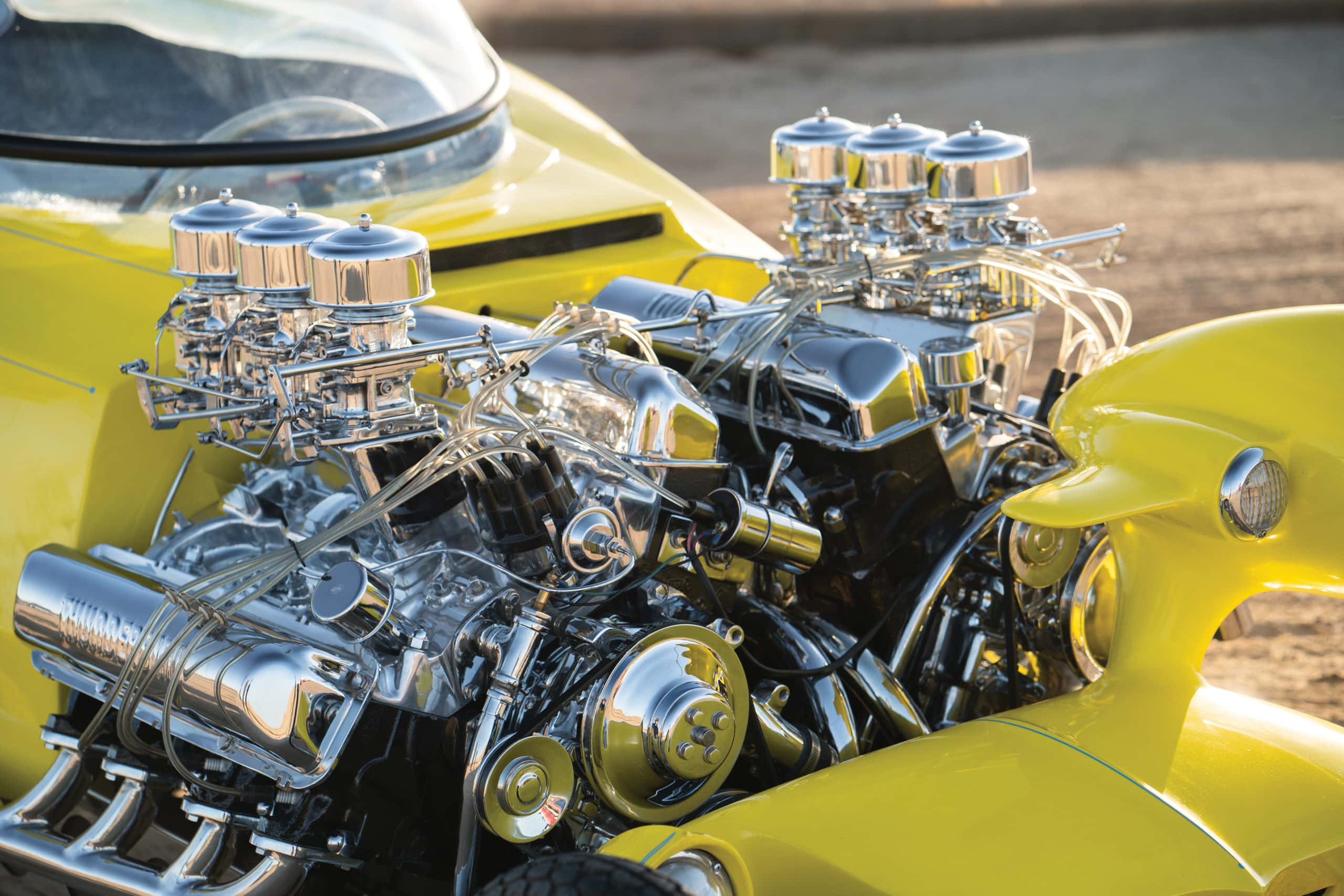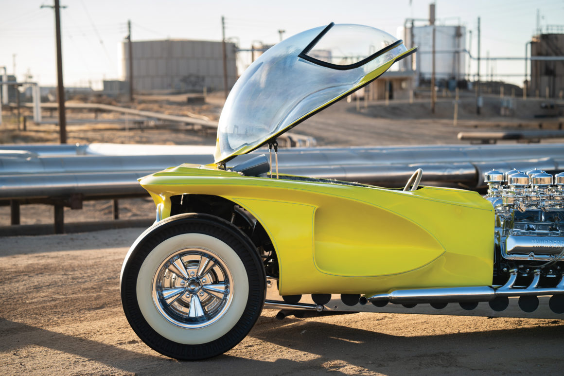 La bulle commandée hydrauliquement, disposait d’un petit pare-brise à l’avant… et c’est Larry Watson qui avait peint l’engin en “Or Murano bonbon perlé de blanc”…, tandis que tout le reste était chromé, y compris le châssis.