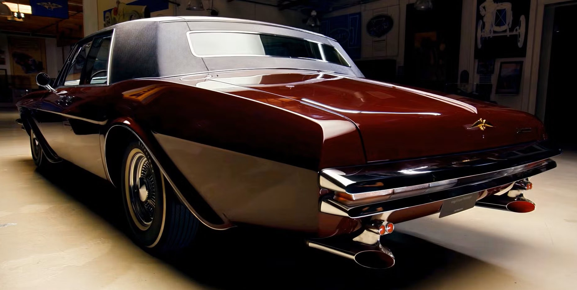 Exner avait déjà réalisé des croquis de cette voiture de renaissance pour le magazine Esquire fin 1963, et toute cette vague néo-classique qui a suivi (Excalibur et Clénet entre autres) n’est pas apparue par hasard… Le modèle D représentait un pari audacieux, visant un prix de plus de 19.500 $ destiné à une clientèle fortunée. Jay Leno affirme que cela équivaudrait aujourd’hui à acheter une Bugatti Veyron, mais ce projet n’a jamais abouti… L’objectif était la production en série, et non un simple prototype éphémère, mais, comme souvent pour les projets ambitieux, le financement a fait défaut. Il ne reste aujourd’hui que le prototype construit, ce qui confère à cette voiture un caractère unique. Ce n’est pas une simple imitation, c’est le véritable vestige de cette tentative. Ce truc est énorme, comme aucune autre voiture de luxe moderne ne l’est. La phrase qui me reste en tête, c’est celle de Jay Léno qui m’a invité, qui dit que c’est comme conduire un salon roulant, parce que c’est exactement l’impression que ça donne. Elle peut accueillir confortablement huit personnes, le capot est d’une longueur absurde, et on a plus l’impression d’être dans un canapé roulant que dans une voiture. Cette Duesenberg repose sur la plateforme de la Chrysler Imperial , ce qui se comprend quand on se souvient de la robustesse de ces voitures. C’est le genre de châssis dont on se plaignait autrefois de sa trop grande robustesse lors des courses de démolition, et c’est assez cocasse de dire ça d’une plateforme de luxe.
