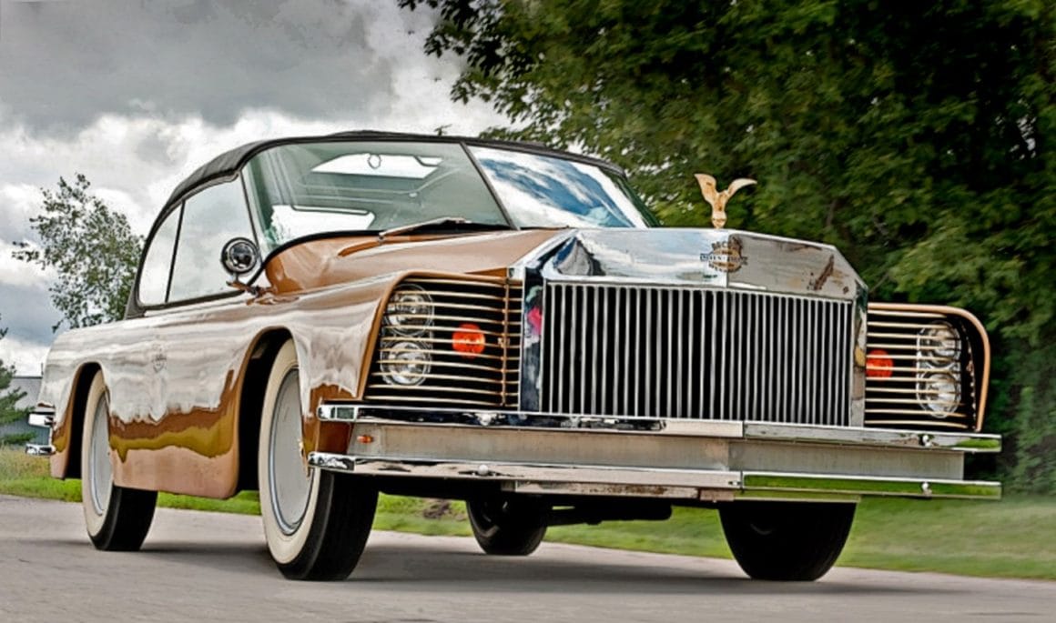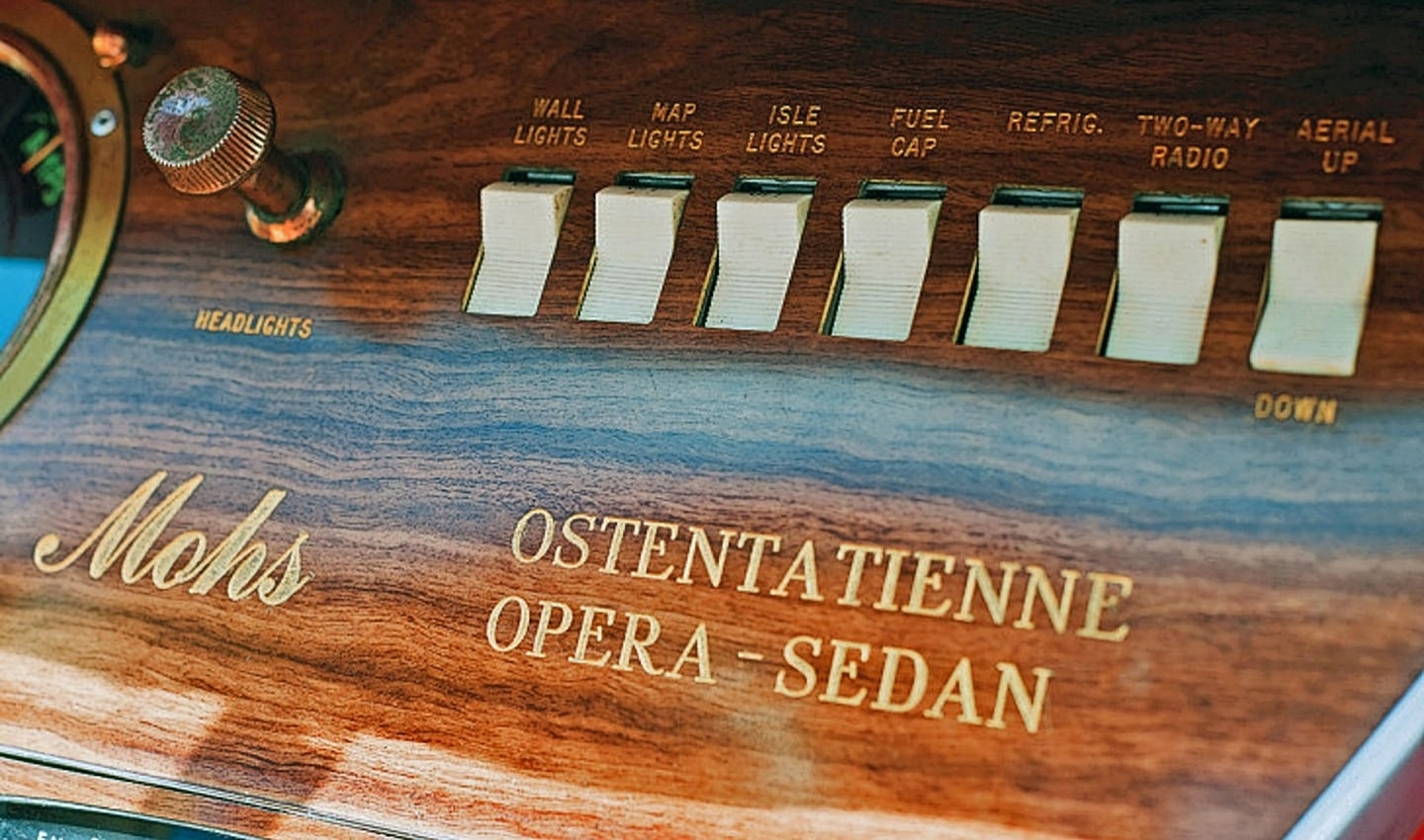 – C’est difficile à exprimer mais vous comprenez, n’est-ce pas ? La MOHS Opéra Sedan Ostentatienne se voulait être la plus extraordinaire automobile made-in-USA, supérieure même à la Rolls-Royce… Elle valait 19,600 US$ en 1967, elle pesait 2.600 kg. Le moteur était un V8 8.990cc…, un moteur de camion international Harvester. Les pneus du véhicule étaient gonflés à l’azote. L’entrée dans la voiture se faisait par l’arrière, la sortie aussi. Le châssis était constitué de rails en acier massif, conçus pour protéger les passagers lors d’un accident, ce qui empêchait de placer des portes sur les côtés. L’Ostentatienne pouvait être commandée sur mesure pour répondre aux souhaits de ses acheteurs : les tapis Ming orientaux, un écritoire en acajou et un réfrigérateur étaient quelques-unes des options disponibles. La production s’est limitée à quatre véhicules par an, une seule année !