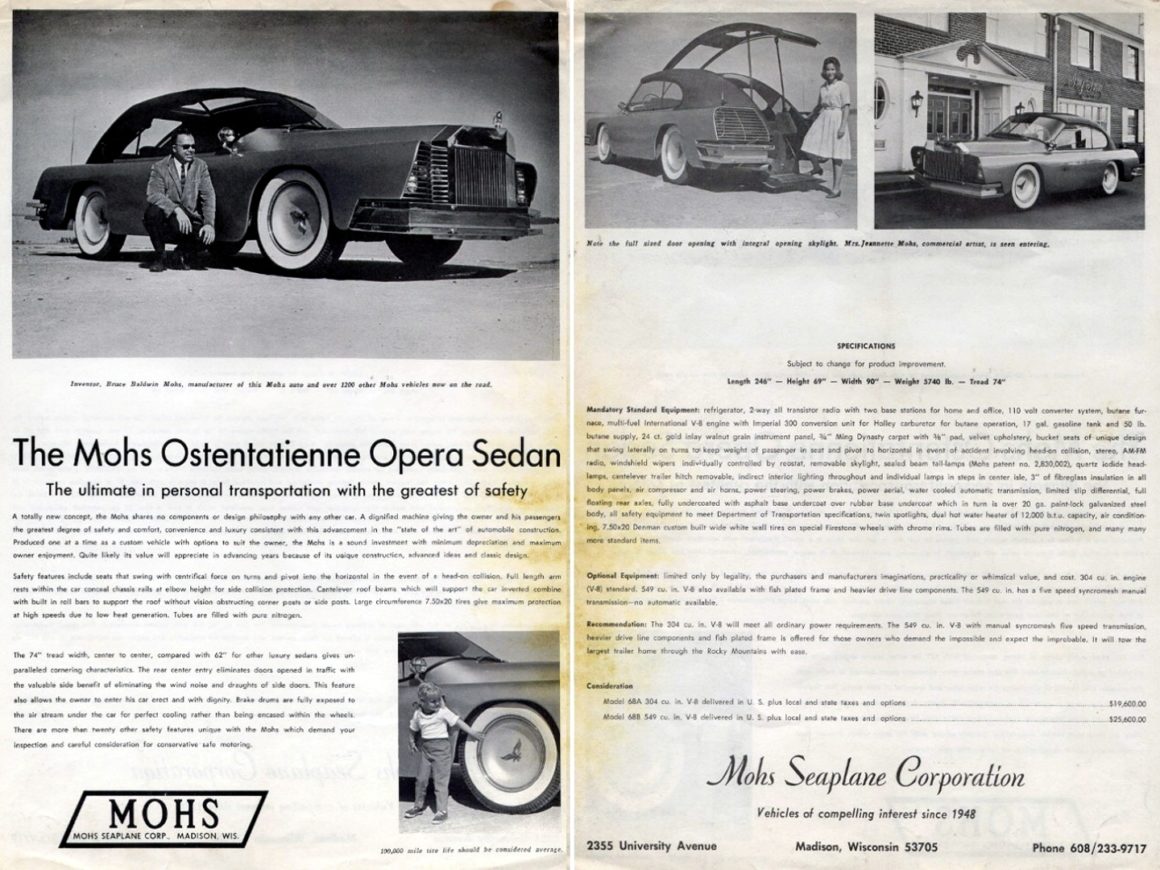 Ce fou génial, construisait des hydravions en production limitée sous sa marque : MOHS Hydravion Corporation, à Madison, Wisconsin, États-Unis… mais, au milieu des années ’60 il s’est mis en tête de créer une automobile avant-gardiste selon ses spécifications très personnelles, basée sur le châssis et le moteur V8 8.990cc d’un des camions fabriqués par International Harvester Company.