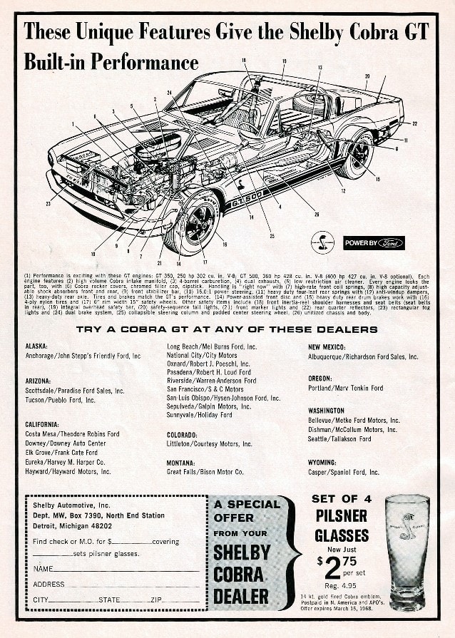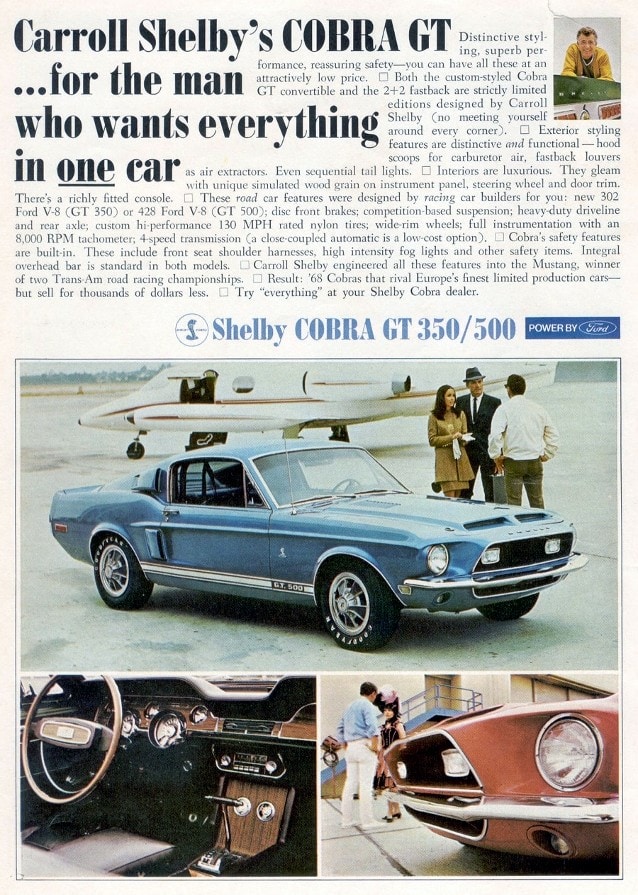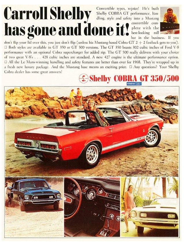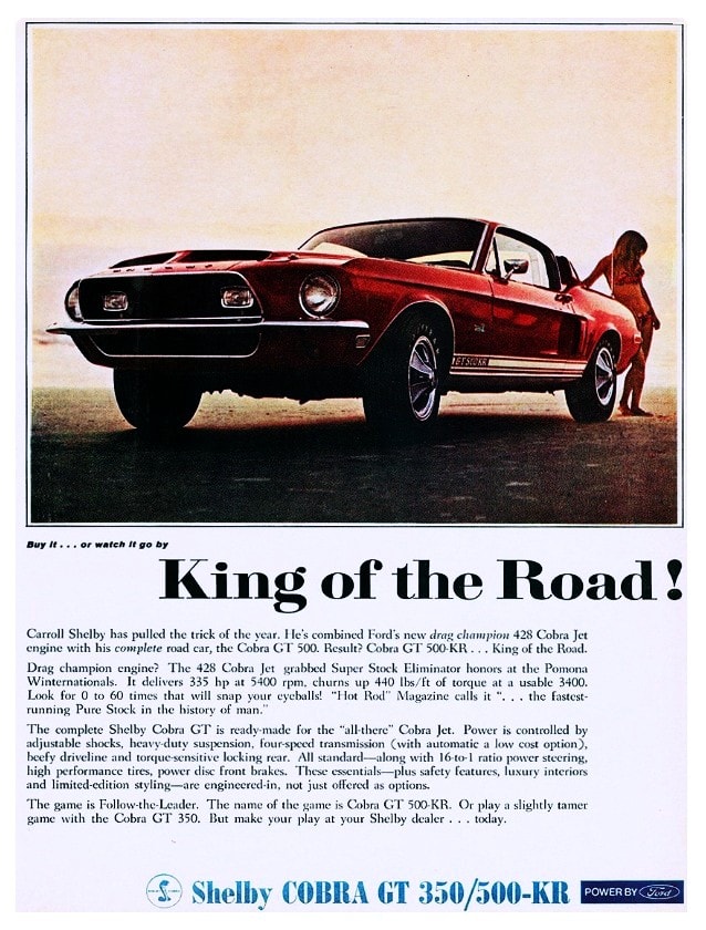Le millésime 1968 voit le lancement de la GT500 “King of the Road” dotée du 428 Cobra Jet, qui développe plus de 400 chevaux (diffusion de 933 exemplaires)…, organisée initialement de manière artisanale, la production s’industrialise quelque peu avec le succès commercial, la fabrication étant assurée par Ford à partir de 1968.