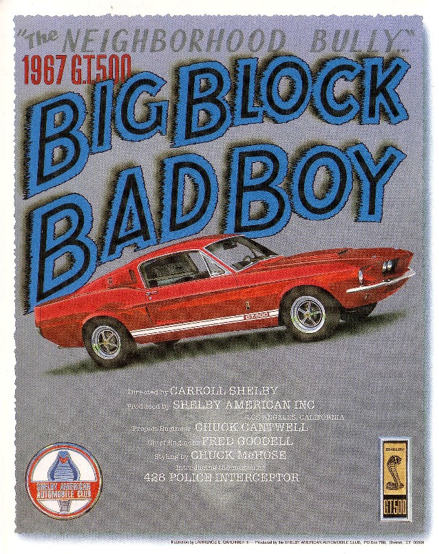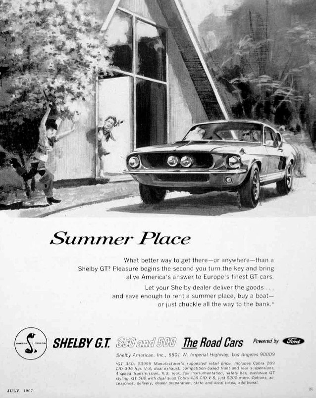 En 1967, la 350GT se voit adjoindre une grande sœur, la GT500…, monstrueuse, la voiture est motorisée par l’énorme 428 ci (sept litres de cylindrée) donné pour 355 chevaux (beaucoup plus en réalité).