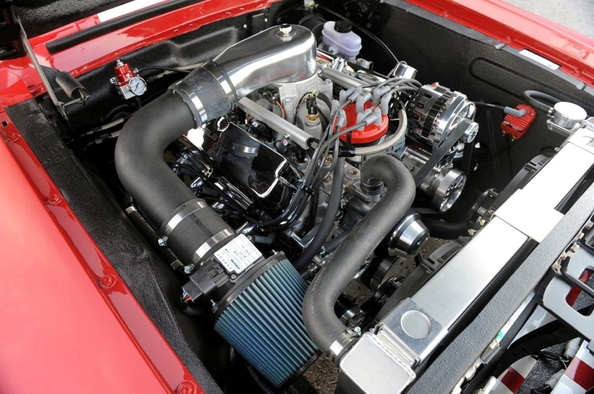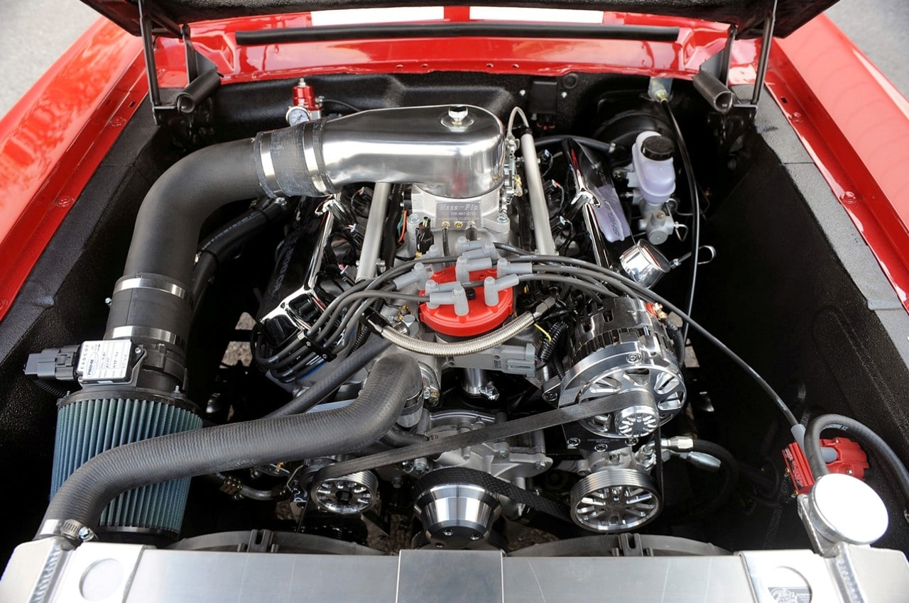 Encore faut-il que le ramage aille avec le plumage…, en dégoupillant le capot avant, on se rend compte que le moteur a lui aussi reçu une belle préparation, sous le capot de notre belle du jour siège un V8 427ci Crate, équipé d’un ProCharger F-1R-17PSI avec 3 Intercooler, permettant une puissance de 770 chevaux !