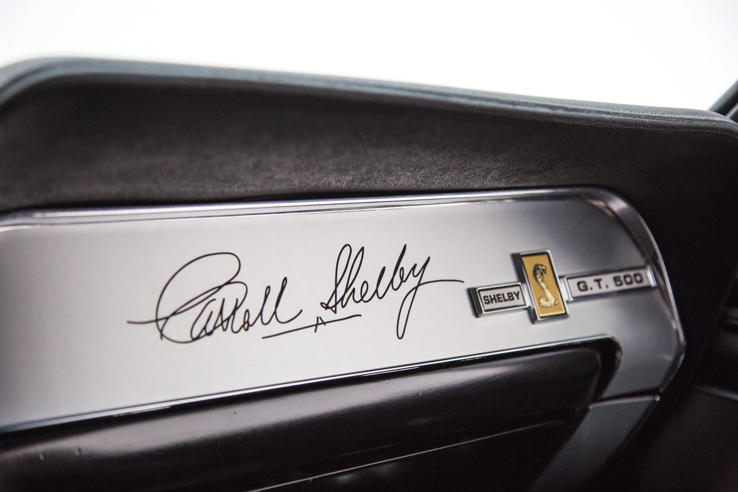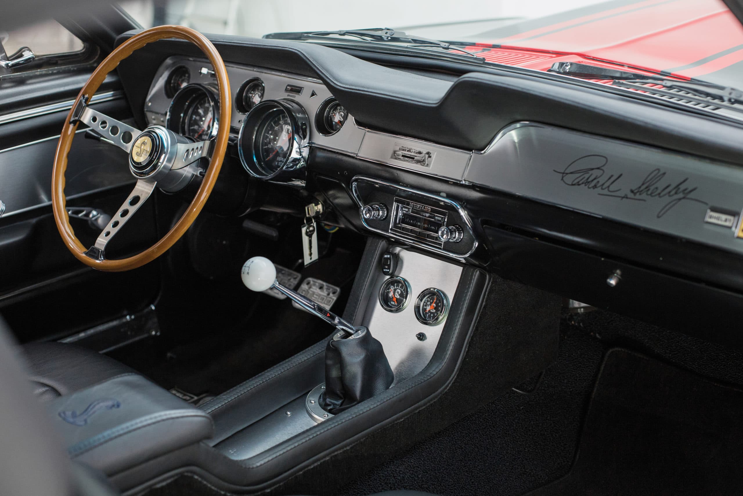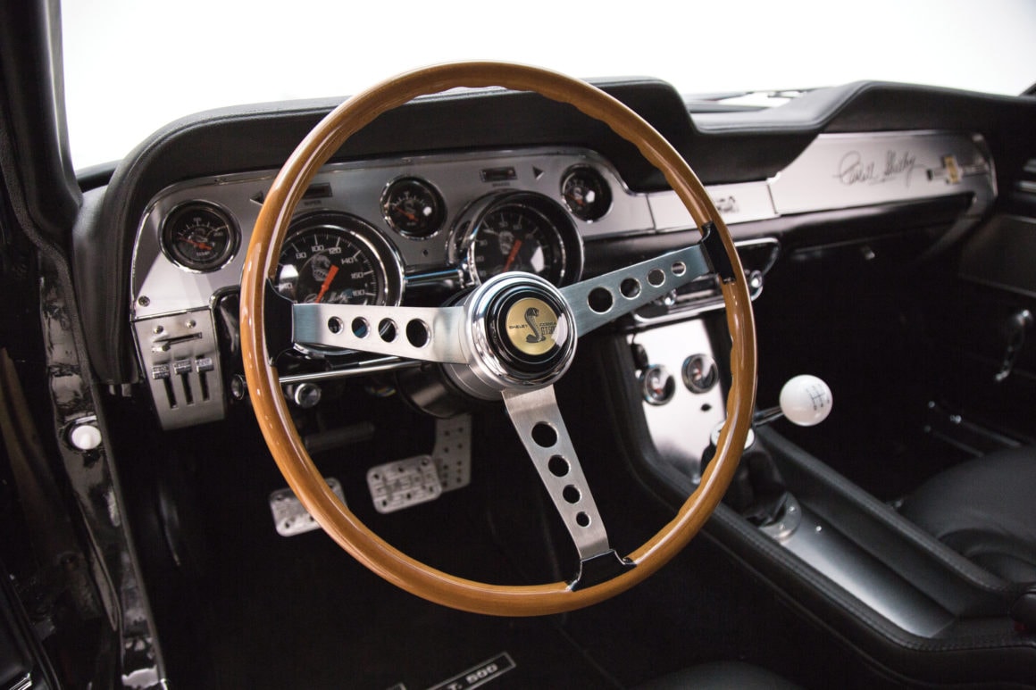 L’intérieur a le même genre de saveur distinctive, mais similaire que l’extérieur. Les sièges sont Mustang, de même que le tableau de bord, les commandes, etc., mais il y a l’ajout d’une barre de roulis appropriée et des bretelles pour compléter les ceintures abdominales standard. L’instrumentation de base de la Mustang est complétée par un anémomètre et une jauge de pression d’huile maladroitement située sur le bord inférieur du milieu du tableau de bord. Il y a aussi un volant à bords de bois avec l’emblème Shelby et, celui-ci est moins profondément plat que le volant Ford standard. La banquette arrière du fast-back qui avait été supprimé pour le modèle de l’année précédente est conservée ici en version GT500, elle permet ainsi un pratique 2 + 2 alors que la GT350 était strictement une deux places. La suspension de la GT 500 est rigide et extra-ferme. Les modifications de suspension représentent une partie des efforts de Shelby pour adapter les voitures à un marché plus large et à un coût moindre. Les freins ont la combinaison arrière “à l’ancienne” : disques avant/tambours arrières disponibles en option avec un matériau de friction organique plus résistant.