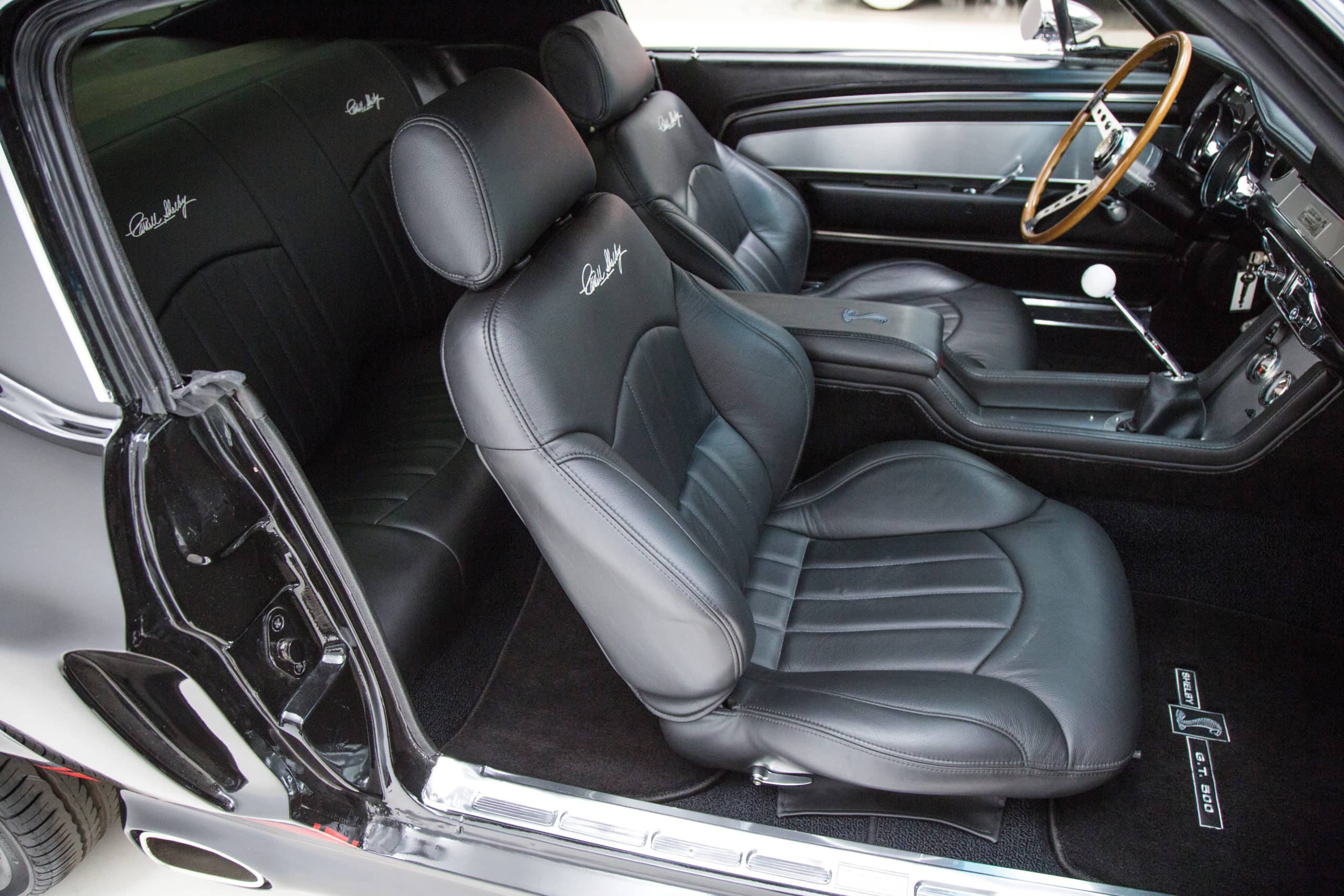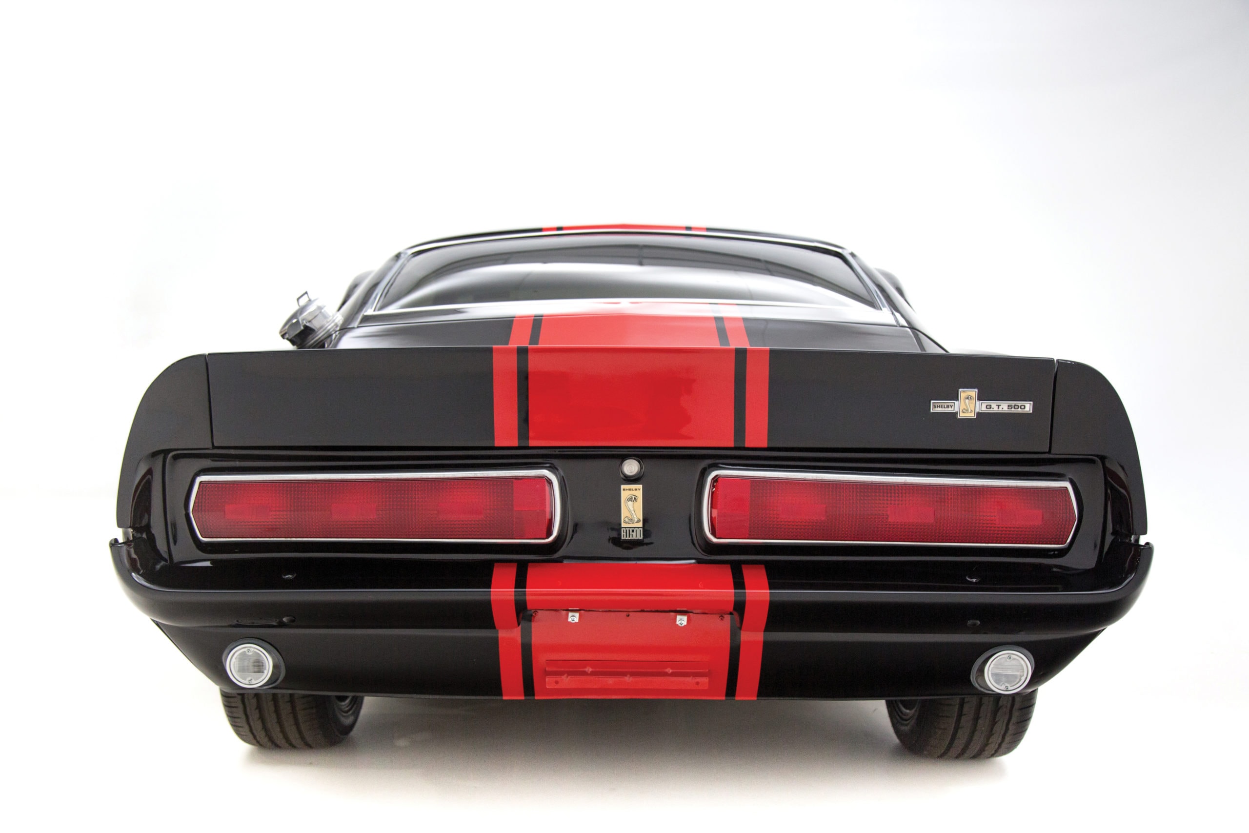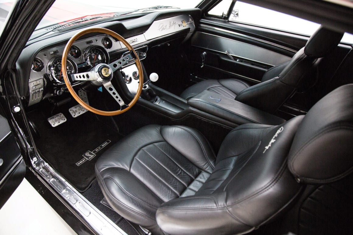 L’intérieur a le même genre de saveur distinctive, mais similaire que l’extérieur. Les sièges sont Mustang, de même que le tableau de bord, les commandes, etc., mais il y a l’ajout d’une barre de roulis appropriée et des bretelles pour compléter les ceintures abdominales standard. L’instrumentation de base de la Mustang est complétée par un anémomètre et une jauge de pression d’huile maladroitement située sur le bord inférieur du milieu du tableau de bord. Il y a aussi un volant à bords de bois avec l’emblème Shelby et, celui-ci est moins profondément plat que le volant Ford standard. La banquette arrière du fast-back qui avait été supprimé pour le modèle de l’année précédente est conservée ici en version GT500, elle permet ainsi un pratique 2 + 2 alors que la GT350 était strictement une deux places. La suspension de la GT 500 est rigide et extra-ferme. Les modifications de suspension représentent une partie des efforts de Shelby pour adapter les voitures à un marché plus large et à un coût moindre. Les freins ont la combinaison arrière “à l’ancienne” : disques avant/tambours arrières disponibles en option avec un matériau de friction organique plus résistant.