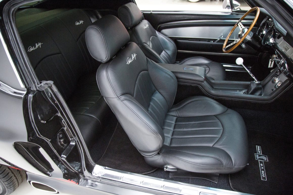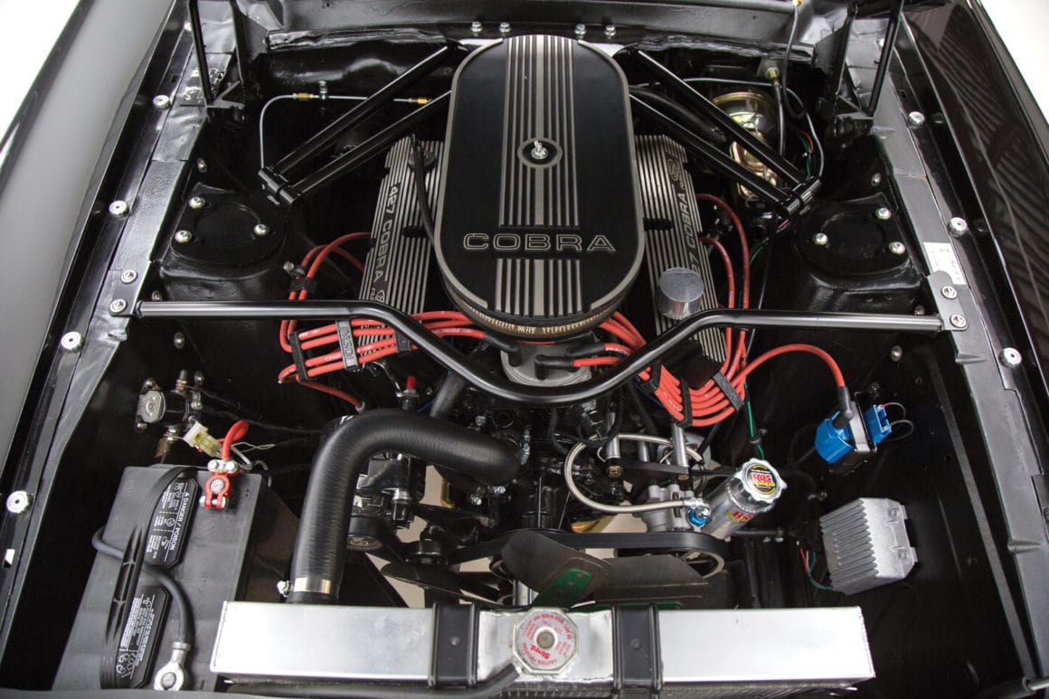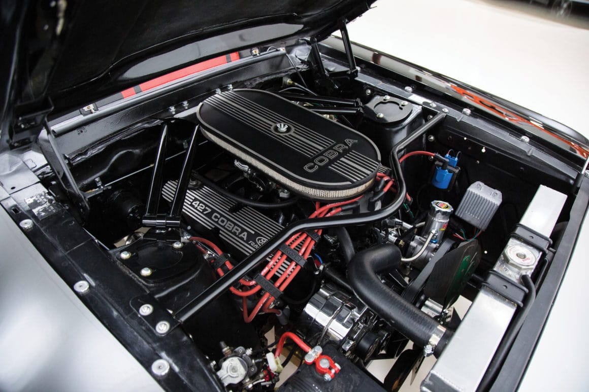 Le “big-big-big-Block 428ci” des GT500 “de base” (4,13 x 3,98 alésage et course) était “le” gros moteur de cuisson rapide bon marché de Ford utilisé dans les variantes Thunderbird et Police Interceptor, mais le Graal ultime avec accès direct à l’autoroute du Kif, c’est le célèbre 427ci (4,24 x 3,78) développé pour les courses de stock NASCAR et utilisé dans les GT MarkII prototypes ayant gagné les 24h du Mans. Installé sur la GT500, ce rarrissime 427ci est équipé de deux carburateurs Holley four barrels et est évalué à seulement 355 chevaux à 5400 tr/min… une misère car les ahuris, les ploucs et les lecteurs des ex-Nitro et Power-Glide sont persuadés que ce V8 mythique “fait” 500 chevaux comme l’indique le chiffre GT500 ! C’est du flanc ! Du bourre-mou et cul-cul ! En vrac de physique pure, le 427ci est plus grand que la taille du roi ! Il y a à peine de la place pour lui dans la Mustang Shelby si bien que les ignares se disent qu’il doit y avoir au moins 4 bougies par cylindre soit 32 bougies d’allumage là-bas quelque part (on peut voir les fils qui disparaissent sous les entrailles du monstre), les changer ne supportant dès-lors même pas l’idée d’y penser… (Mais non, revenez sur terre les mecs, vous voyez bien sur les photos que c’est facile d’accès et qu’il n’y a que 8 bougies sur ce V8 !)