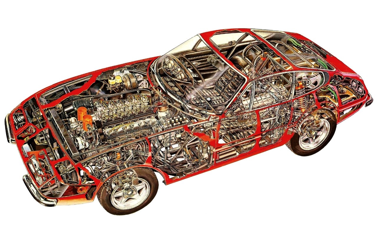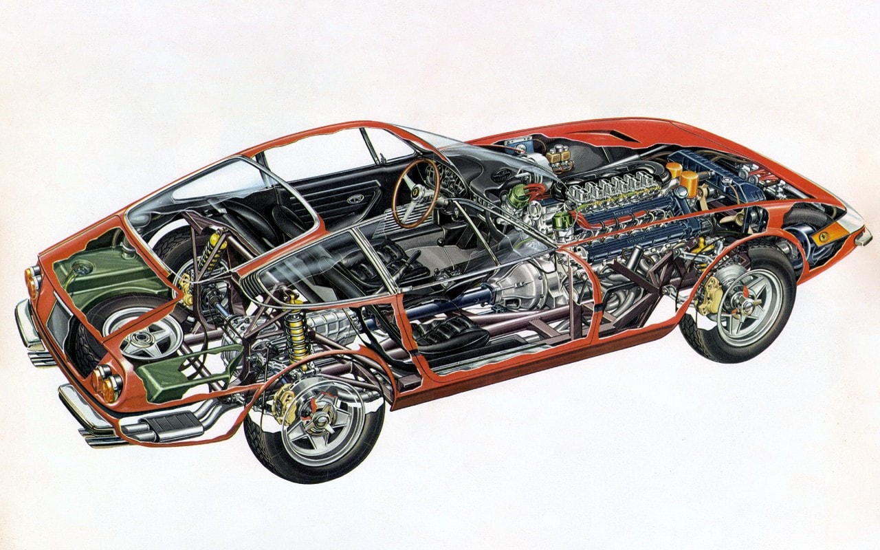 Avec 365 cm³ par cylindre, il affichait donc 4,4 litres et 432 Nm de couple et était gavé (sic !) par 6 carburateurs double corps (généralement des Webber, mais quelques exemplaires employaient des Solex)…, la boîte à 5 rapports étant installée à l’arrière et formant un seul bloc avec le différentiel.