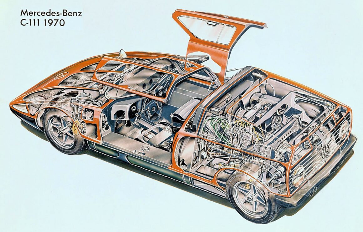 Pour la création de la C-111-1 en 1969, Mercedes? qui avait créé une autre supercar à moteur central au milieu des années 1960, s’est retrouvé avec un Bruno Sacco (nouvelle tête pensante du design-Mercedes), très critique envers le design maladroit “trop américain” de Paul Bracq. Sacco ne voulait pas que la C-111-1 soit une extrapolation de ce “vieux-design”… et, avec l’approbation de son patron, Karl Wilfert, Sacco a initié un nouveau design.