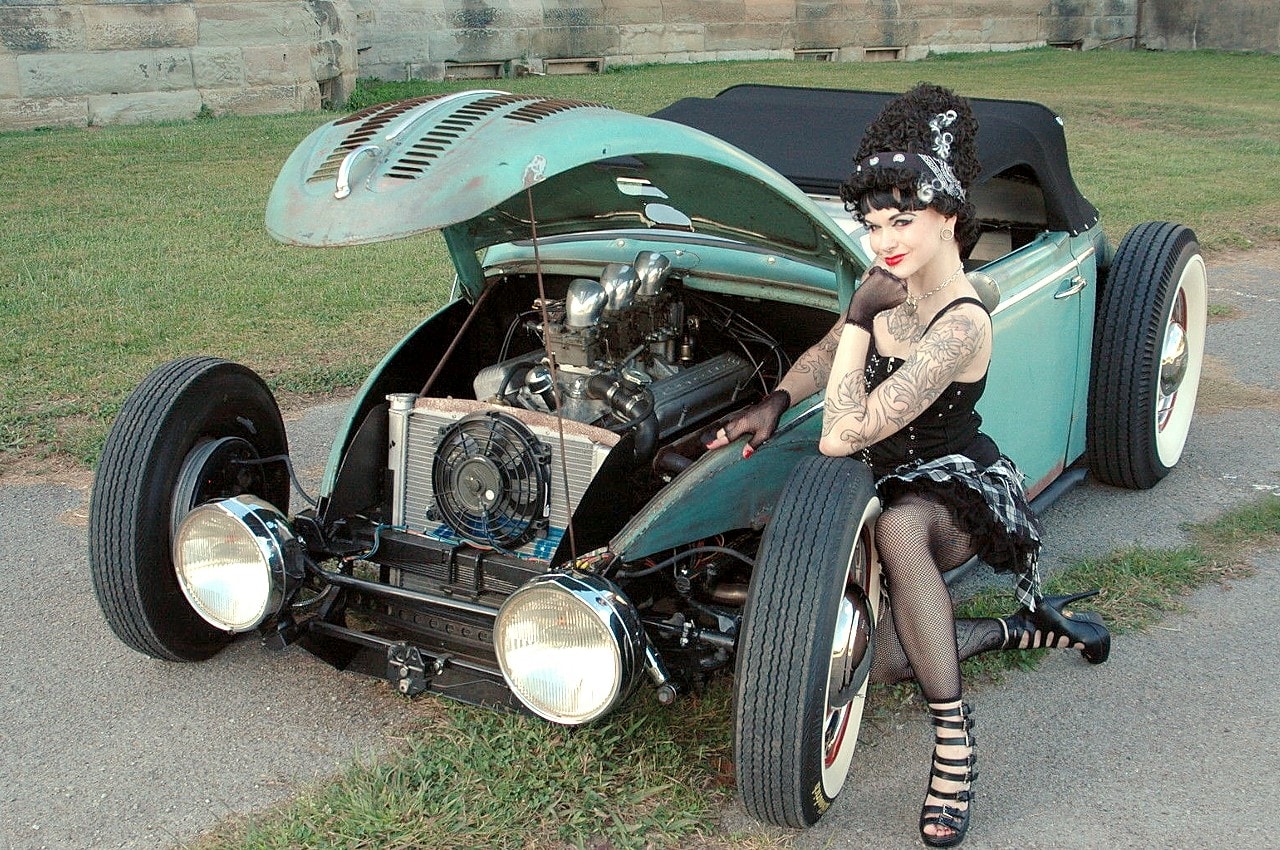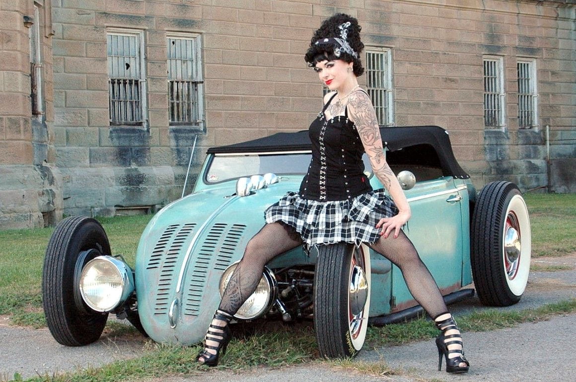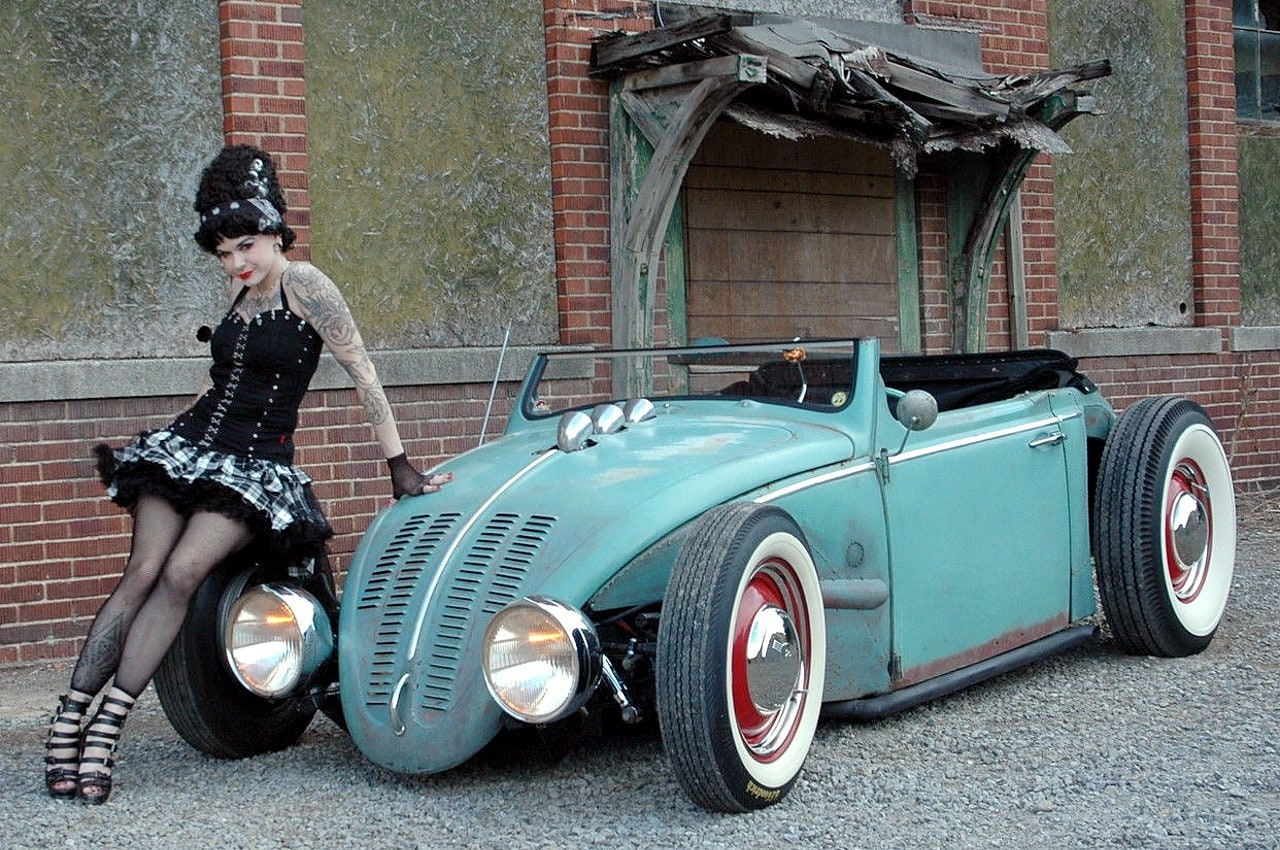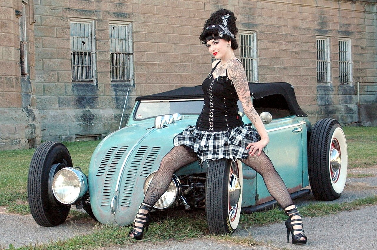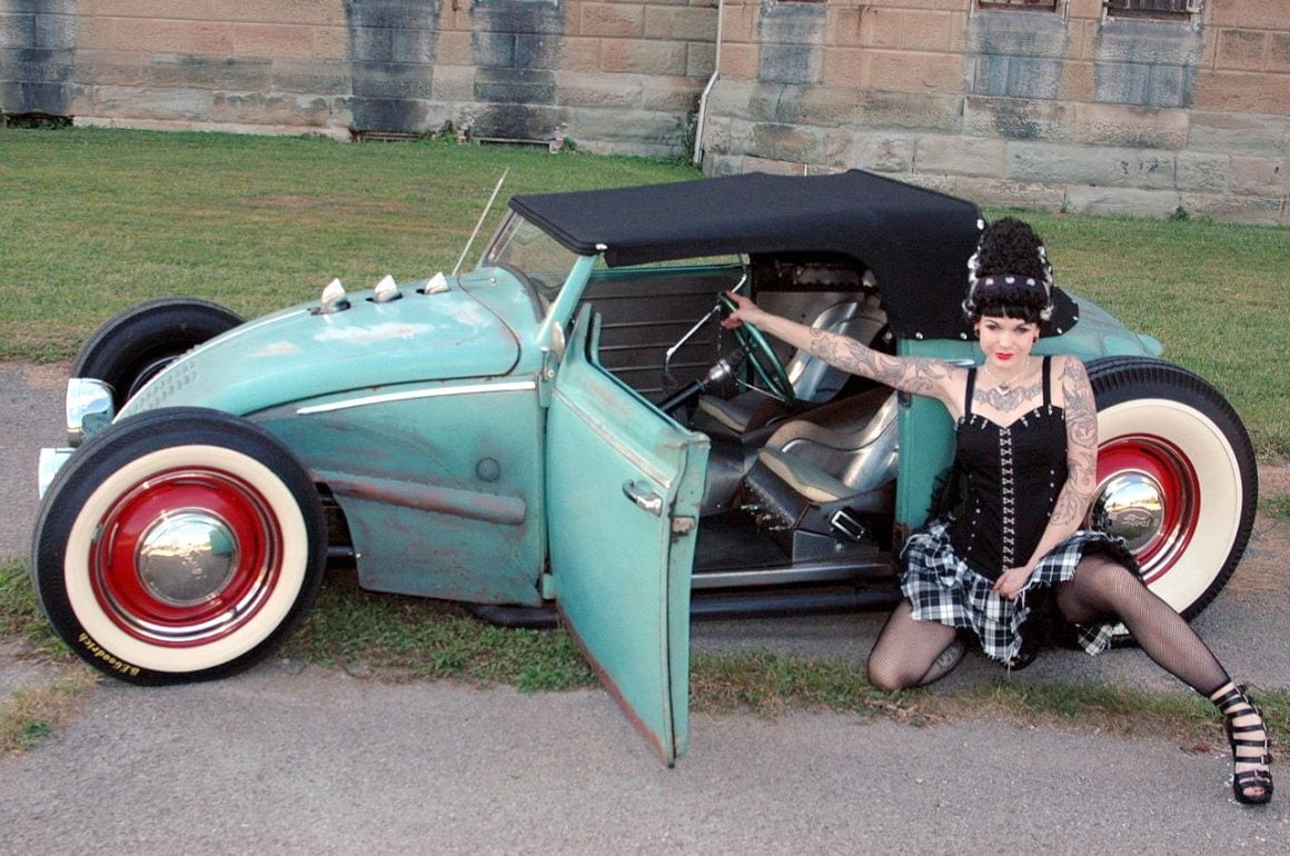 Elle m’a toutefois dit que sa VW, surnommée “Volkentien” était en fait, un Hot-Rod équipé à l’avant (!) d’un V8 283ci provenant d’une antique Corvette 1959 accidentée…, son “Bitza” avait été présenté dans le “Old Skool Rodz Magazine” l’été dernier…, elle ne “pute” s’empêcher de m’ajouter dans un sabir suave, ce que j’ai pieusement retranscrit ci-après : “Ses caractéristiques de la voiture, un plein tube châssis de milieu des années 30’s, un Ford, essieu avant, barbouillé jusqu’à 59 de vette 283 avec tri puissance, et boîte autotik turbo 350 trans, Ford arrière de 9” sur l’air full métallik intérieur, y compris la main métallique de sièges à fonctionnement haché dessus, body a été canalisé, raccourci et sectionns, blancs large de cocker…, unique… rouler vitres latérales…, des troncs fini et abrite le réservoir de carburant… Commerce possible dans quelque chose qui s’empare de mon intérêt…, un intérêt particulier en Porsche et autres voitures de sport de 30,000.00US$ cash”…