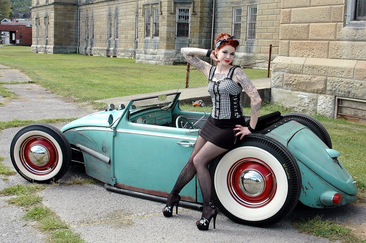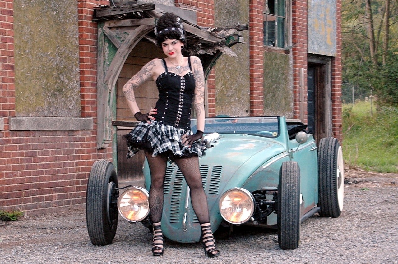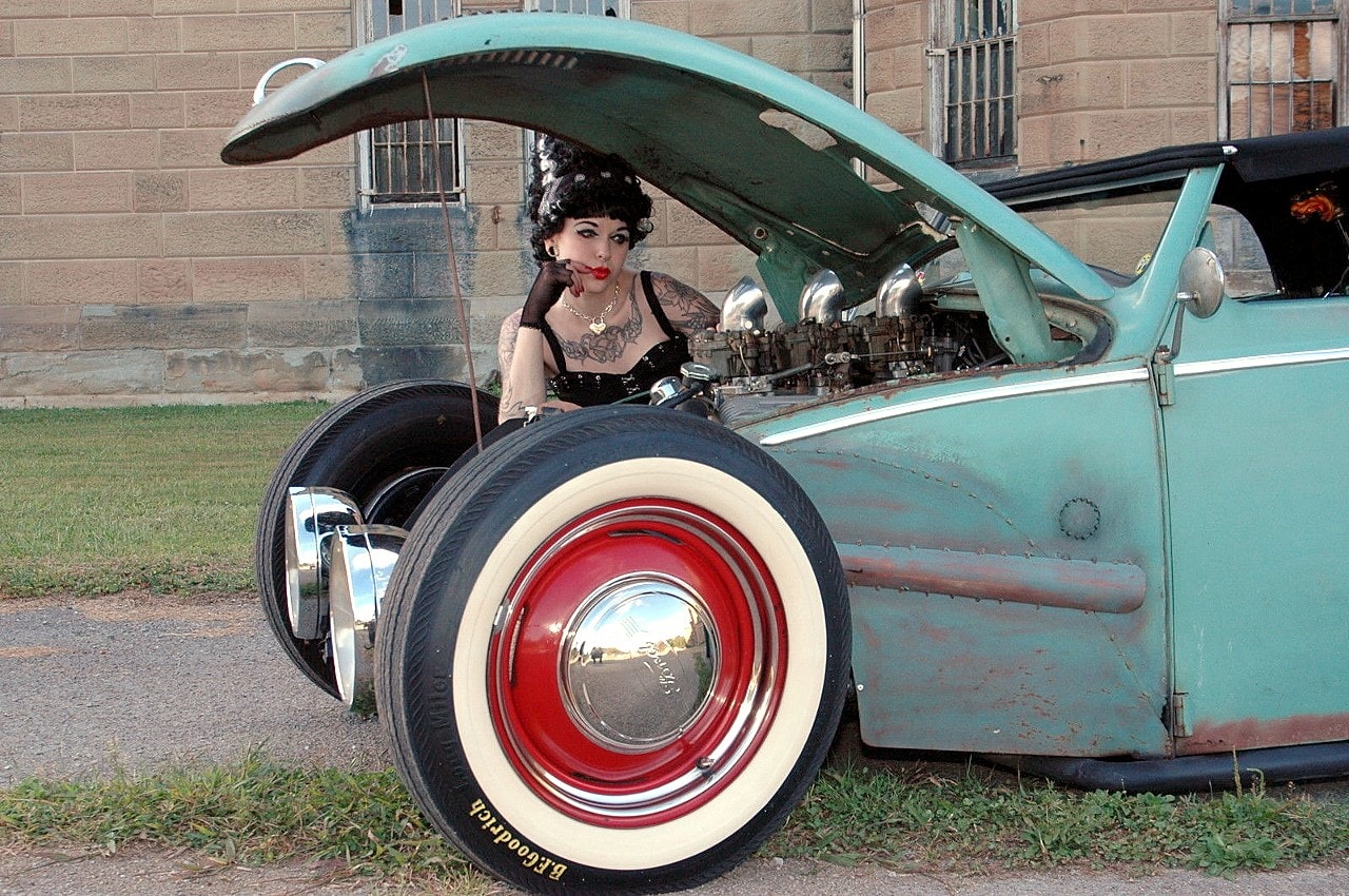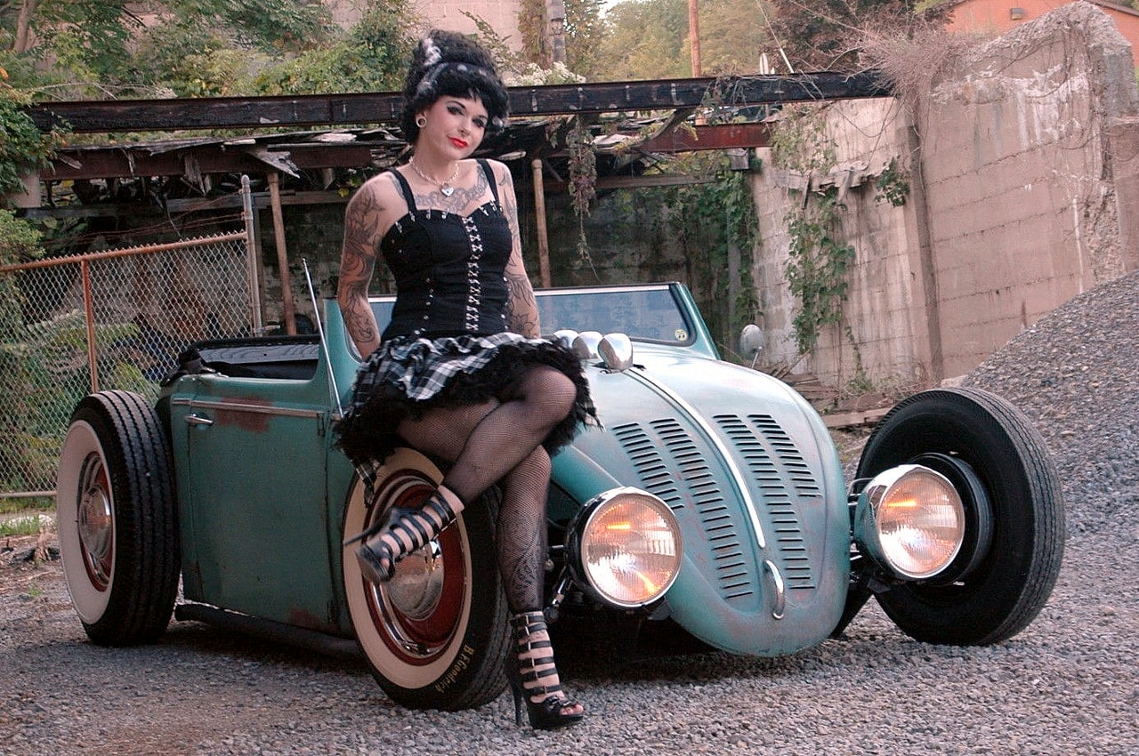 Elle m’a toutefois dit que sa VW, surnommée “Volkentien” était en fait, un Hot-Rod équipé à l’avant (!) d’un V8 283ci provenant d’une antique Corvette 1959 accidentée…, son “Bitza” avait été présenté dans le “Old Skool Rodz Magazine” l’été dernier…, elle ne “pute” s’empêcher de m’ajouter dans un sabir suave, ce que j’ai pieusement retranscrit ci-après : “Ses caractéristiques de la voiture, un plein tube châssis de milieu des années 30’s, un Ford, essieu avant, barbouillé jusqu’à 59 de vette 283 avec tri puissance, et boîte autotik turbo 350 trans, Ford arrière de 9” sur l’air full métallik intérieur, y compris la main métallique de sièges à fonctionnement haché dessus, body a été canalisé, raccourci et sectionns, blancs large de cocker…, unique… rouler vitres latérales…, des troncs fini et abrite le réservoir de carburant… Commerce possible dans quelque chose qui s’empare de mon intérêt…, un intérêt particulier en Porsche et autres voitures de sport de 30,000.00US$ cash”…