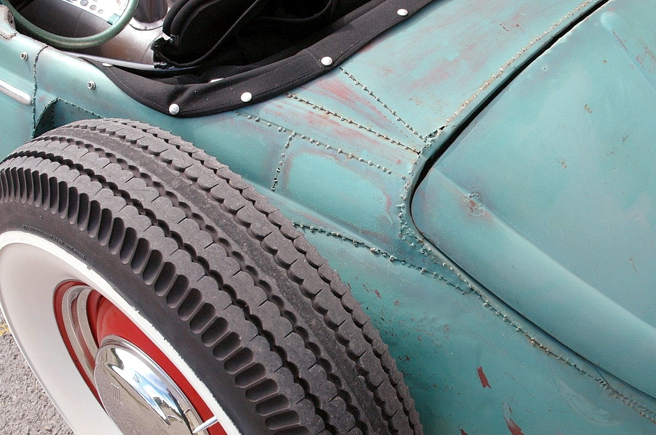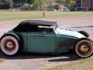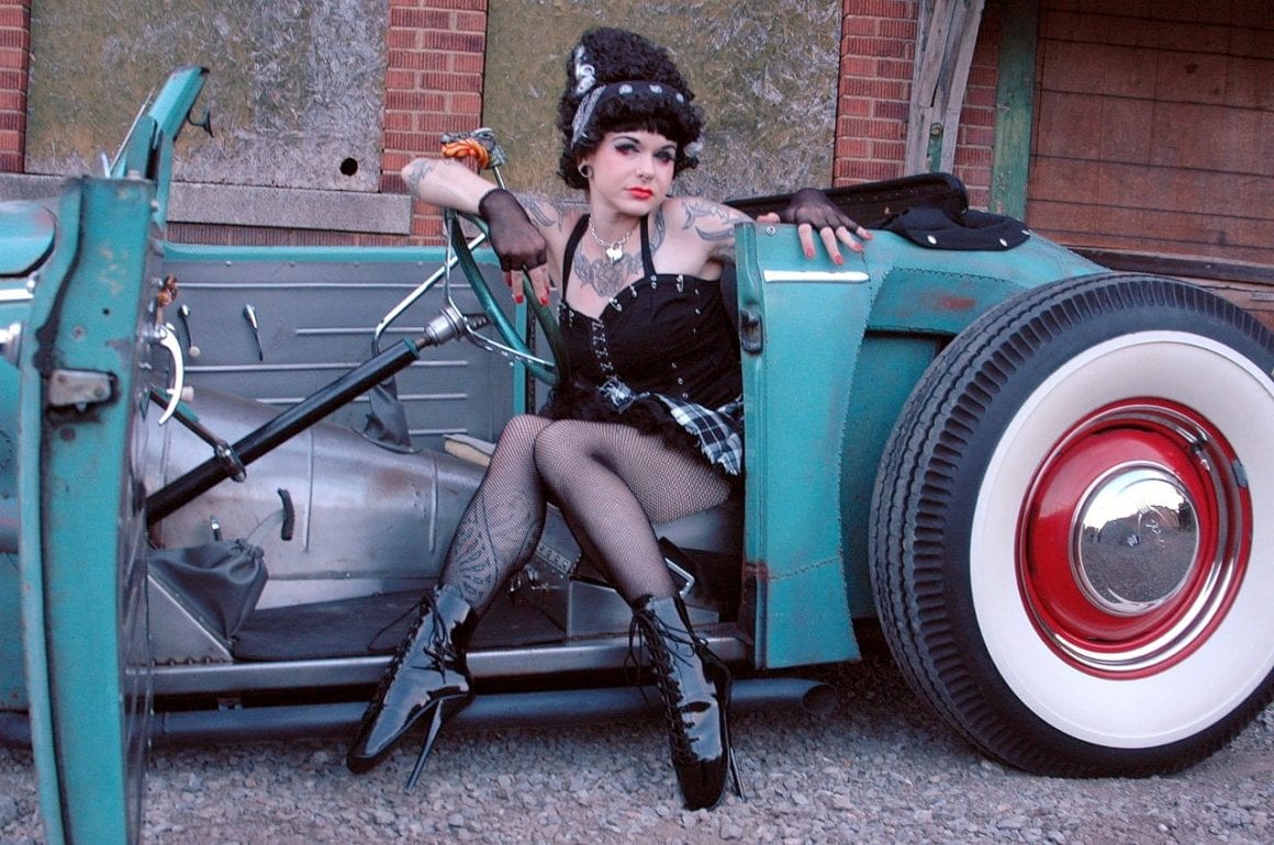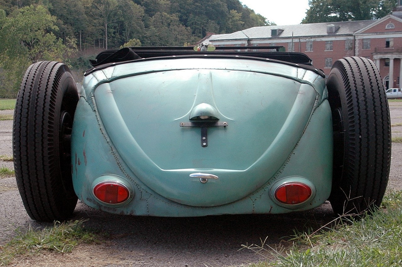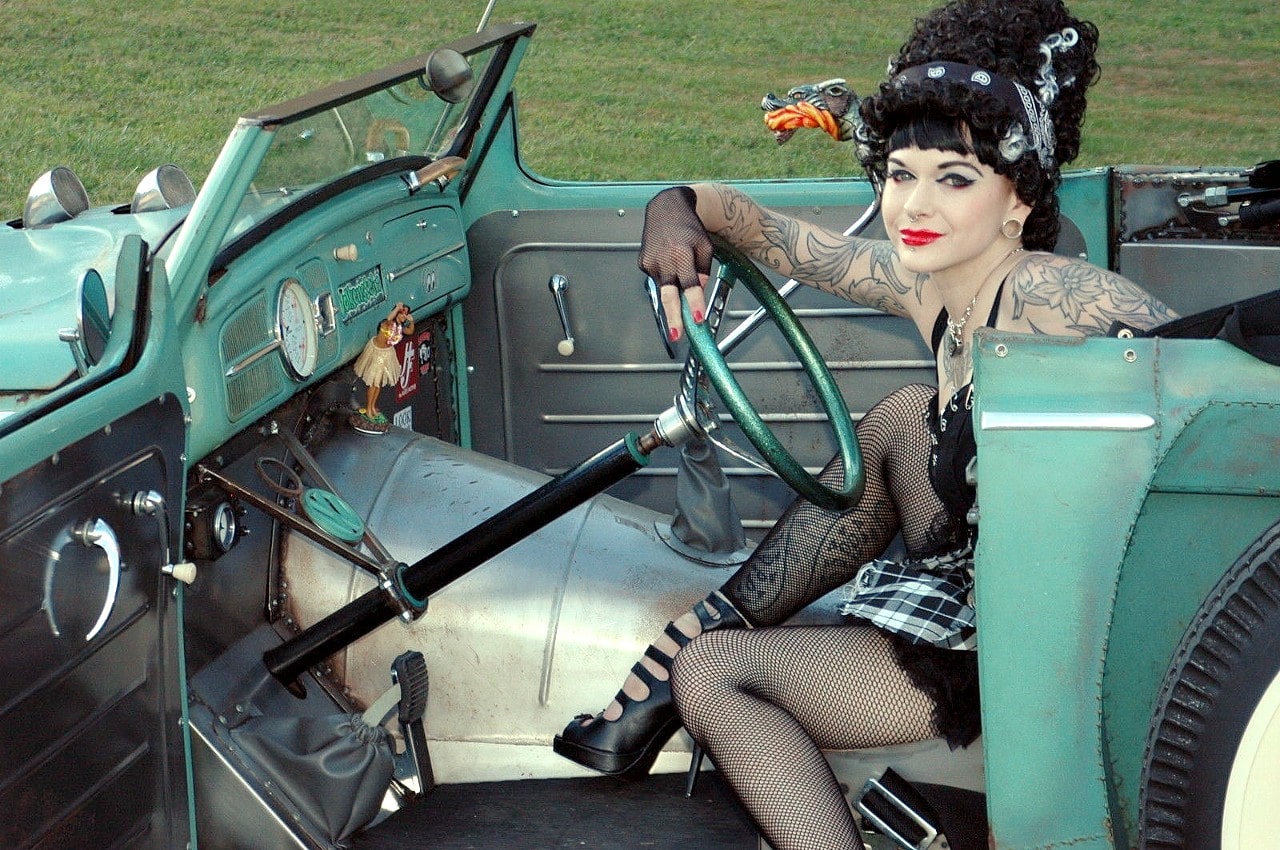 Elle m’a toutefois dit que sa VW, surnommée “Volkentien” était en fait, un Hot-Rod équipé à l’avant (!) d’un V8 283ci provenant d’une antique Corvette 1959 accidentée…, son “Bitza” avait été présenté dans le “Old Skool Rodz Magazine” l’été dernier…, elle ne “pute” s’empêcher de m’ajouter dans un sabir suave, ce que j’ai pieusement retranscrit ci-après : “Ses caractéristiques de la voiture, un plein tube châssis de milieu des années 30’s, un Ford, essieu avant, barbouillé jusqu’à 59 de vette 283 avec tri puissance, et boîte autotik turbo 350 trans, Ford arrière de 9” sur l’air full métallik intérieur, y compris la main métallique de sièges à fonctionnement haché dessus, body a été canalisé, raccourci et sectionns, blancs large de cocker…, unique… rouler vitres latérales…, des troncs fini et abrite le réservoir de carburant… Commerce possible dans quelque chose qui s’empare de mon intérêt…, un intérêt particulier en Porsche et autres voitures de sport de 30,000.00US$ cash”…