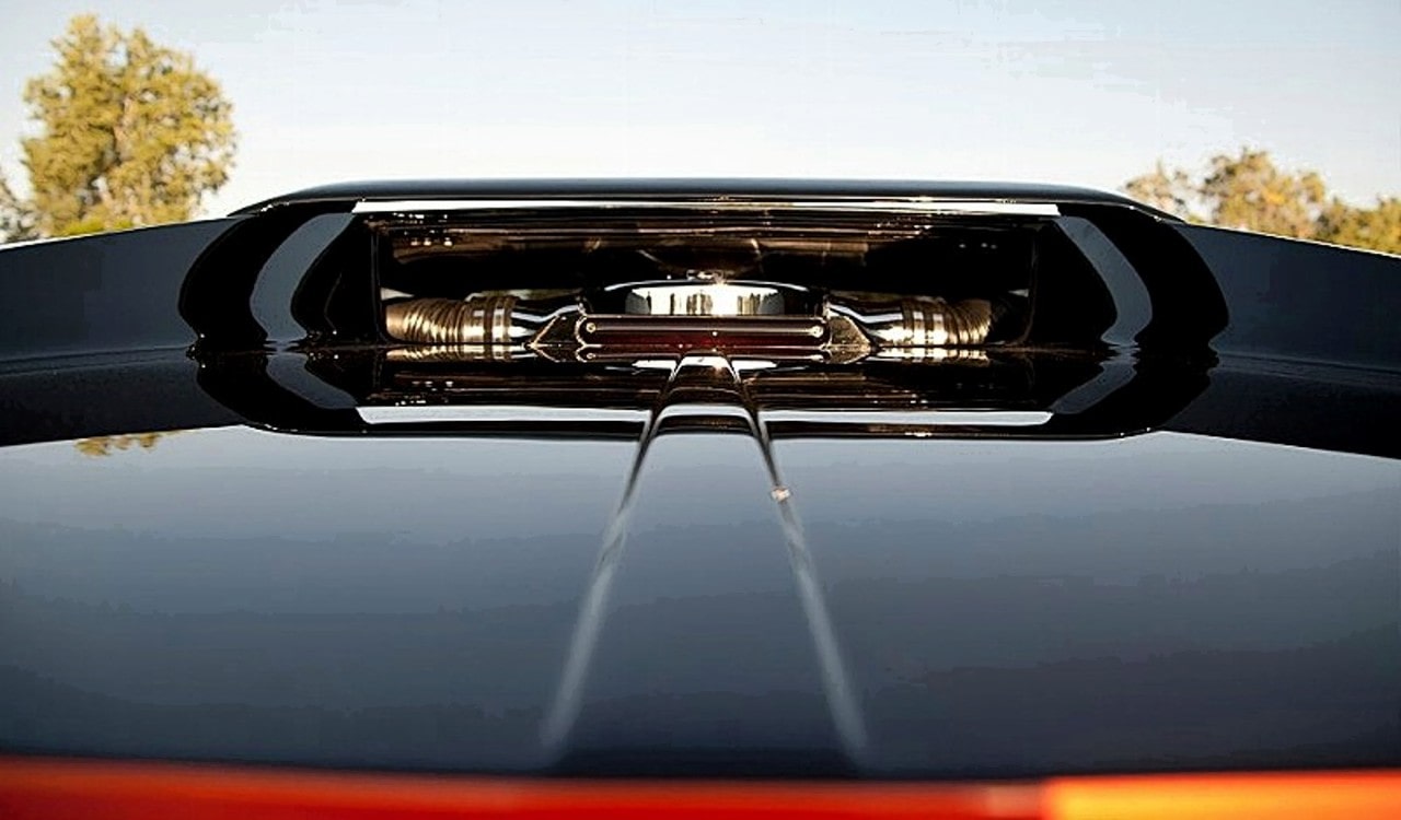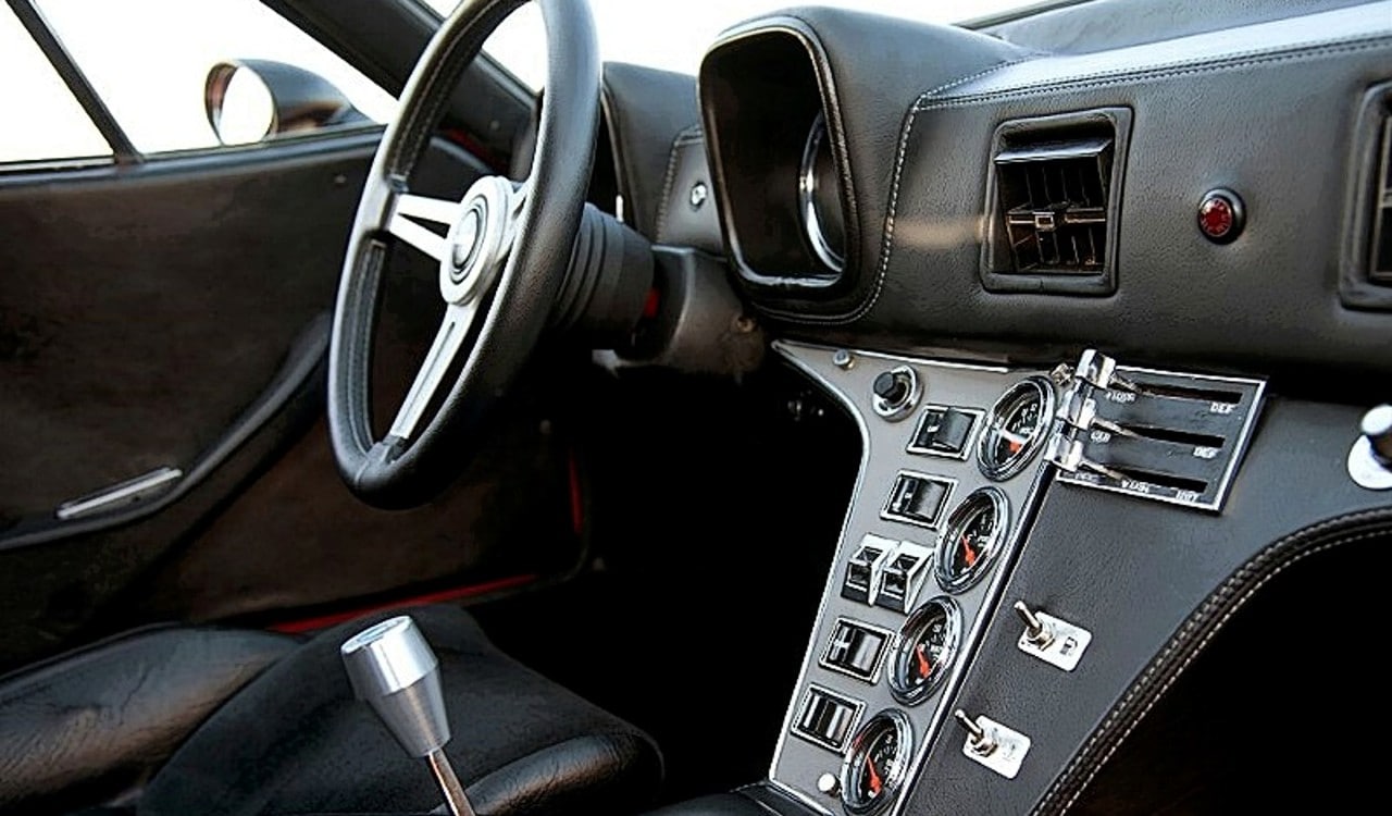 Propulsée par un V8 Cleveland 351ci en fonte, la Pantera dispose alors de 270 chevaux pour figurer parmi les plus rapides GT du moment (et notamment la Corvette aux USA), conçue sur une coque autoporteuse et carrosserie en acier bon marché, la Pantera n’est pas très légère… Le V8 Ford tout en fonte n’aide pas à gagner des kilos… Le bestiau, plutôt le bovin, ne sait que beugler comme à l’abattoir, pas d’envolées lyriques comme un V12 Ferrari mais un grognement viril qui se transforme en hurlement de râles et d’agonie dans les tours et qui prend aux tripes et fait vibrer tout le corps espérant qu’il sera rapidement mis fin aux tortures… Questions sensations, on est servi, c’est glauque comme dans un abattoir, mais tout le reste c’est du grand n’importe quoi !